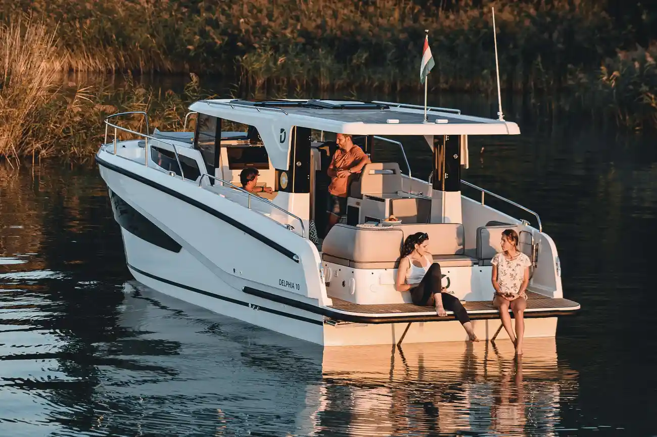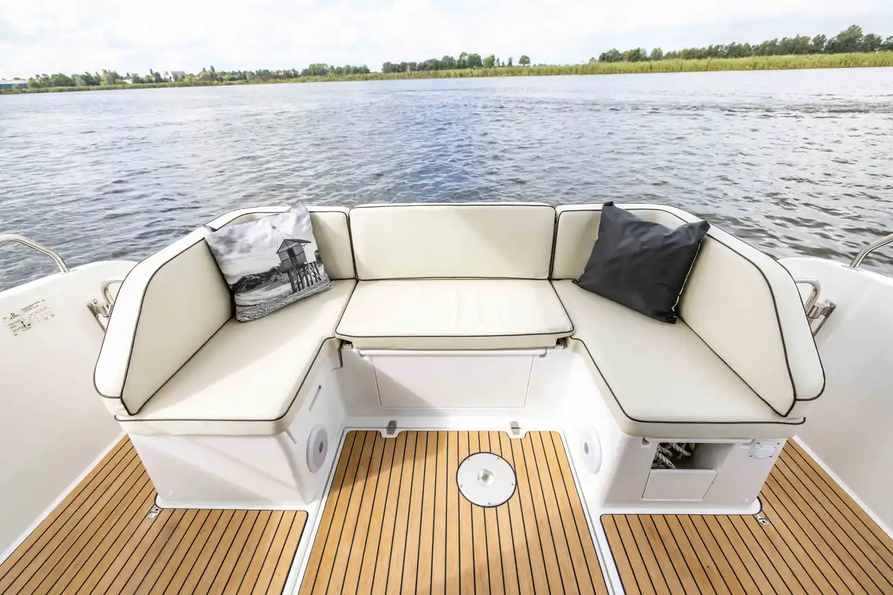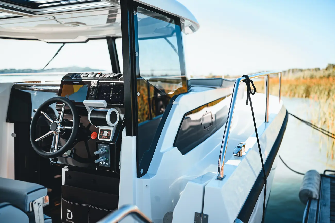 The Delphia 10 “Lounge Top” designed by Vri Pack of Holland,  this example an ex factory show boat now offered at a substantial saving on a new build.  The model emphasizes a large sociable  cockpit with easy access from a side door and transom. Yet with the beauty of a fixed hardtop thus negating the need for full canopies with easily slot in side panels.  Specification boasts Full Teak decks, a cockpit with fixed roof with hatches and roof bars for water toys. The cockpit seats 12 with ease, 2 cabins below, each with over 6'06" headroom and large berths, a spacious toilet room with shower cubical. This example with the Torquedo E Drive propulsion.