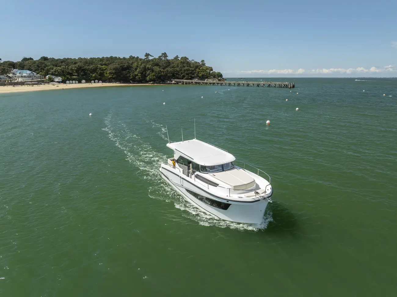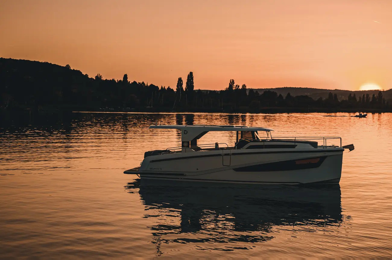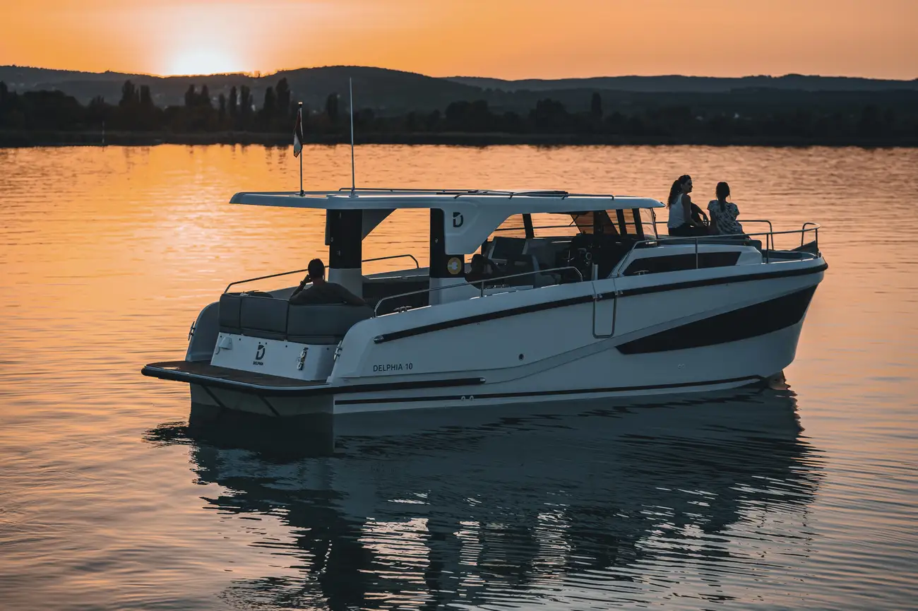 The Delphia 10 “Lounge Top” designed by Vri Pack of Holland,  this example an ex factory show boat now offered at a substantial saving on a new build.  The model emphasizes a large sociable  cockpit with easy access from a side door and transom. Yet with the beauty of a fixed hardtop thus negating the need for full canopies with easily slot in side panels.  Specification boasts Full Teak decks, a cockpit with fixed roof with hatches and roof bars for water toys. The cockpit seats 12 with ease, 2 cabins below, each with over 6'06" headroom and large berths, a spacious toilet room with shower cubical. This example with the Torquedo E Drive propulsion.