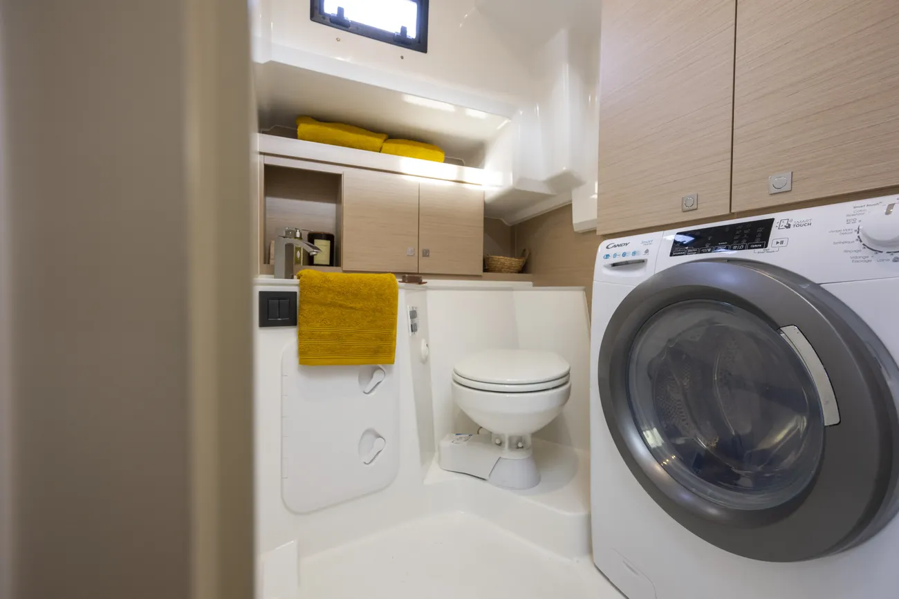• LAYOUT: Walnut interior incl. Grey oak style laminated floorboards - 2 cabins, 2 toilets, 1 separate shower - entrance to bow toilet from bow cabin