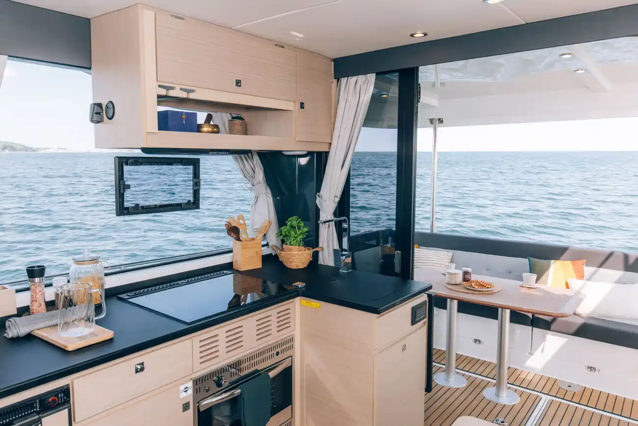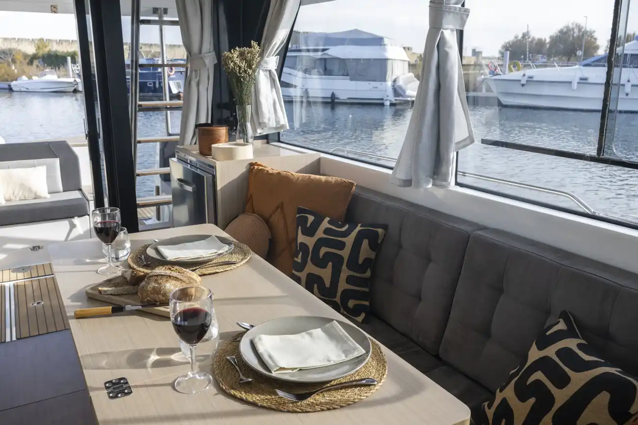 A stunning 12-meter motorboat, the Delphia 12 is the crown jewel of the Delphia range, embodying harmony and high performance, inviting you to truly connect with the sea and discover an exceptional experience, all from the comfort of its bright and welcoming spaces. Give in to the charms of the modern design and sleek lines of the Delphia 12 Diesel, which effortlessly and harmoniously blends aesthetics with functionality. Each detail has been meticulously designed to offer you smooth and enjoyable sailing experiences, so you can disconnect and embrace a carefree retreat on the water. As meals shared in good company always make for wonderful memories, the design of the Delphia 12 Sedan integrates a practical and functional kitchen space. As meals shared in good company always make for wonderful memories, the design of the Delphia 12 Sedan integrates a practical and functional kitchen space. Delphia offers owners the option of enjoying nature in comfort and with peace of mind, thanks to its extended roof. Exterior