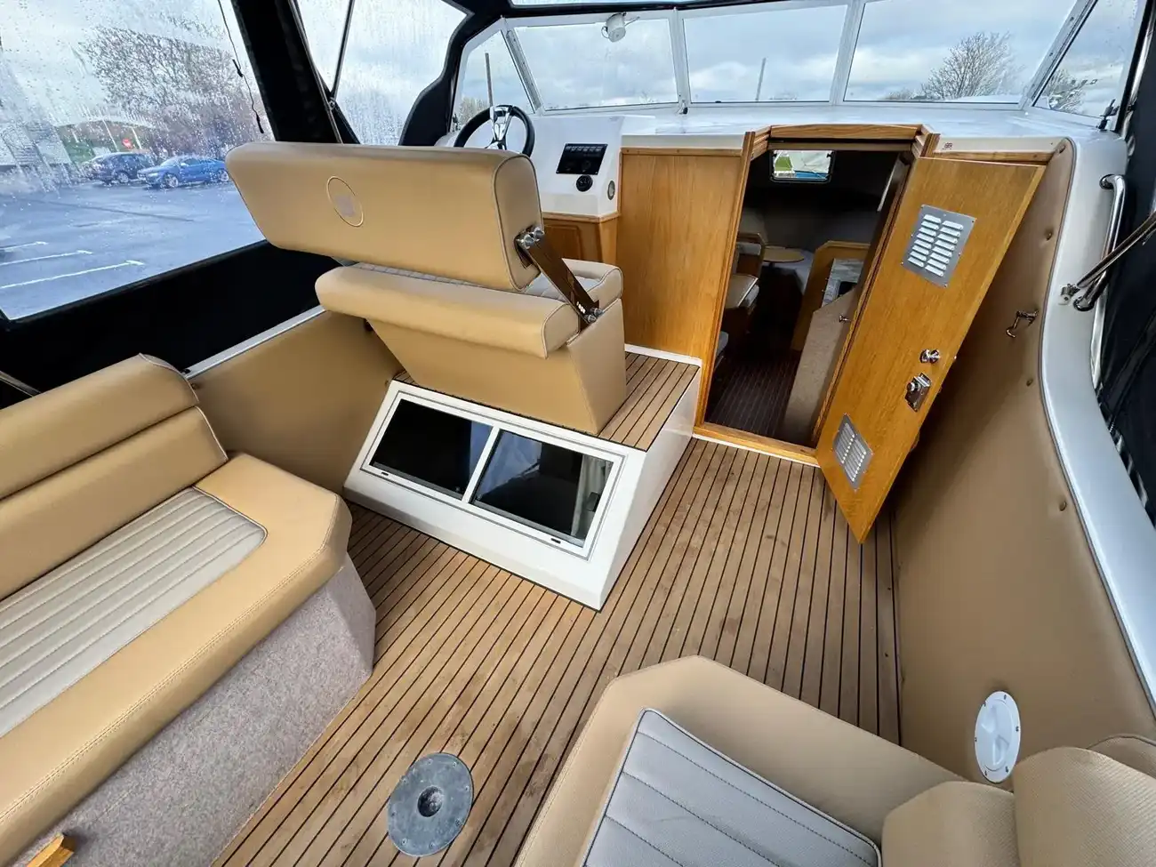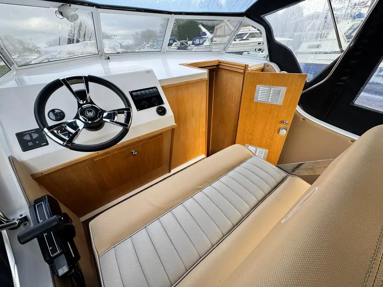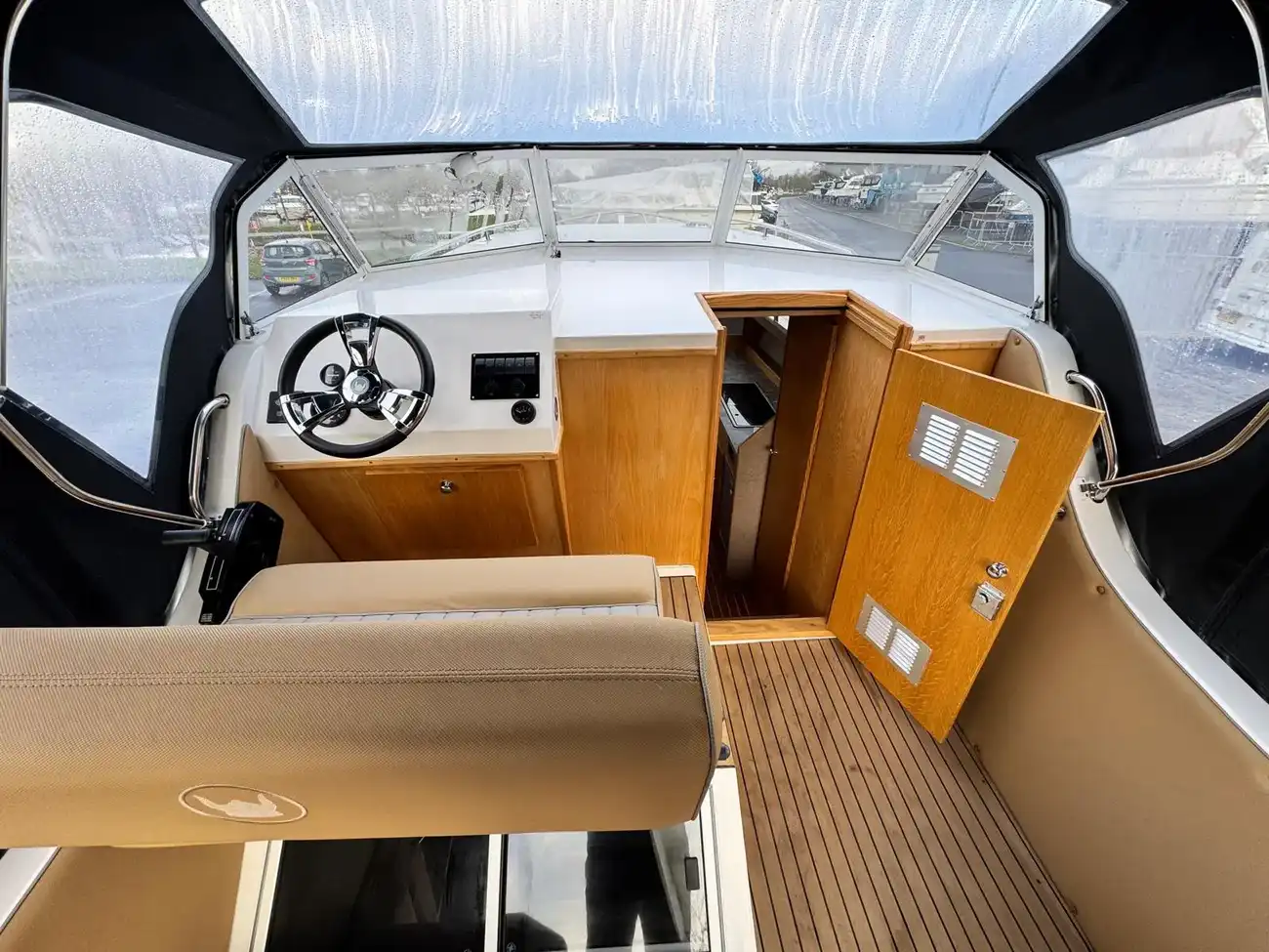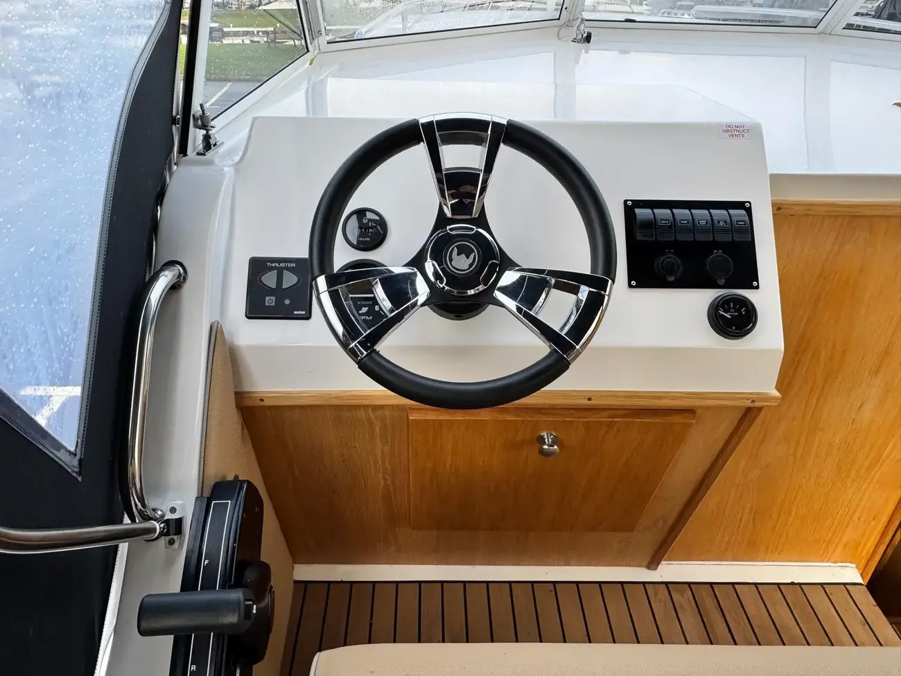 The cockpit is thoughtfully laid out for both cruising and socialising. The helm position is to port, featuring cable steering to the outboard, single-lever engine controls, and clearly arranged ancillary switches.