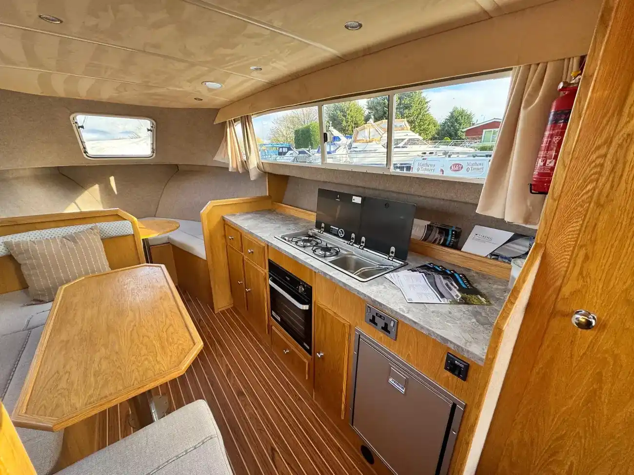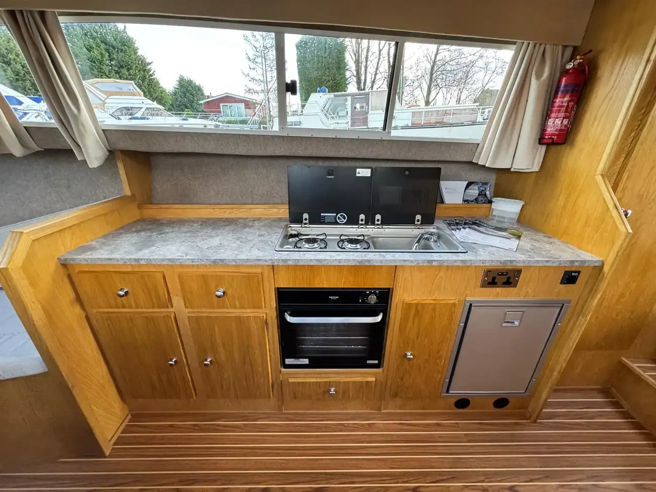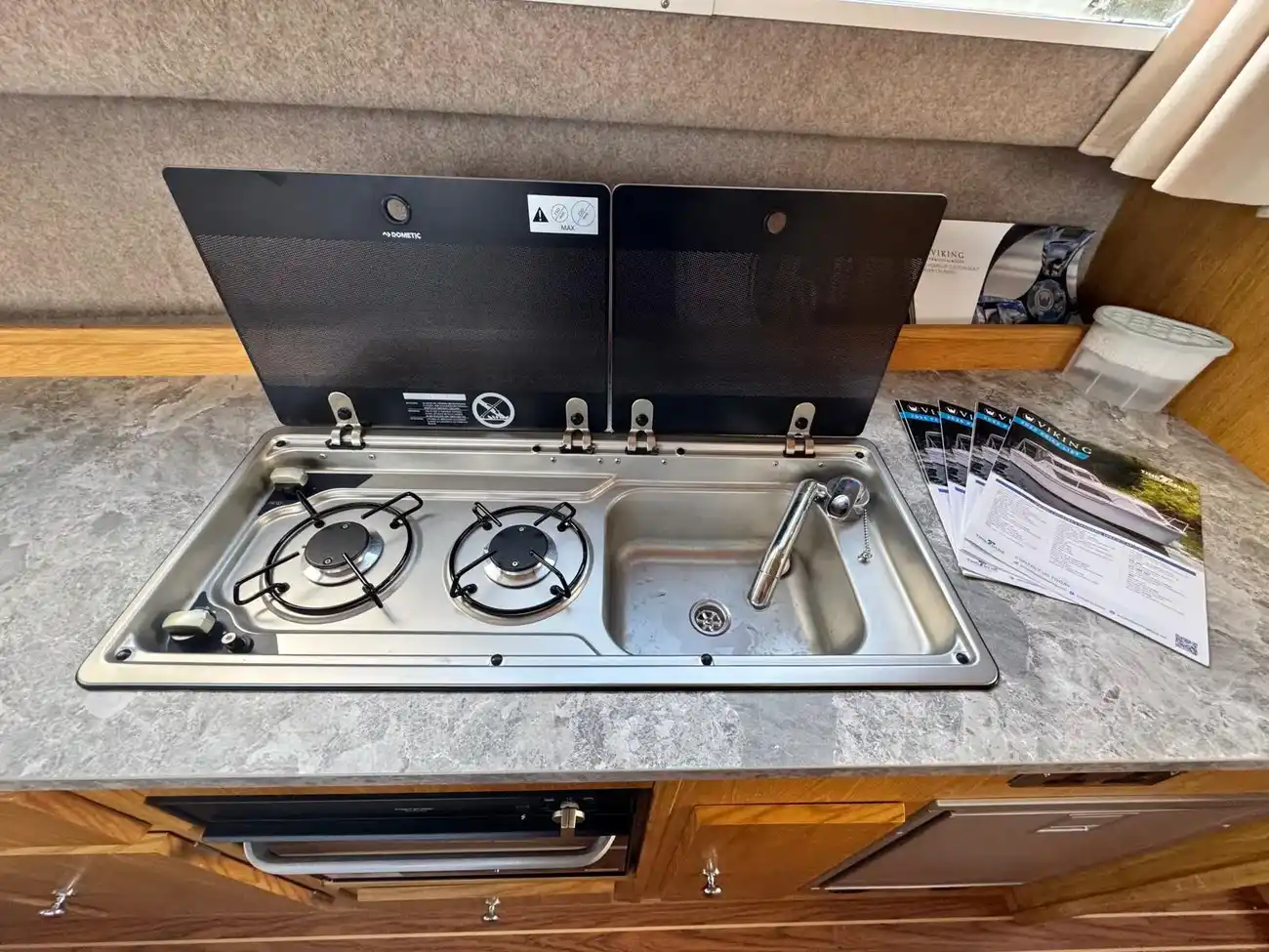 At the heart of the cabin is a U-shaped dinette, which easily converts into a double berth, complemented by V-berths forward. To starboard, opposite the seating area, you’ll find the well-equipped galley, complete with ample storage beneath the worktops. The sink and hob are neatly finished with flush-fitting, fold-down glass covers, maximising worktop space when not in use.