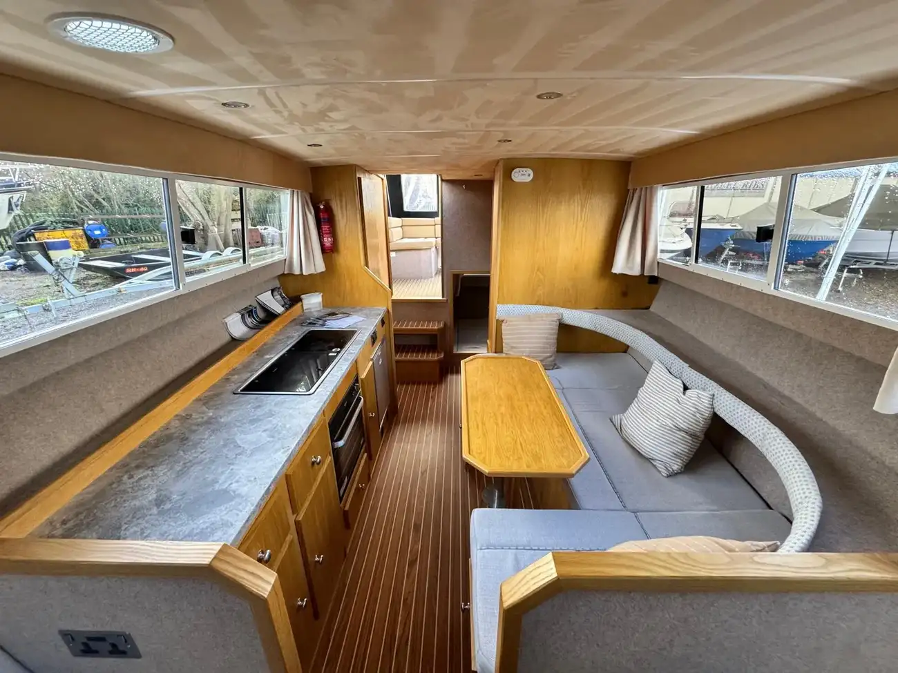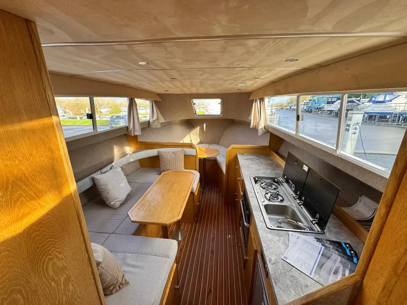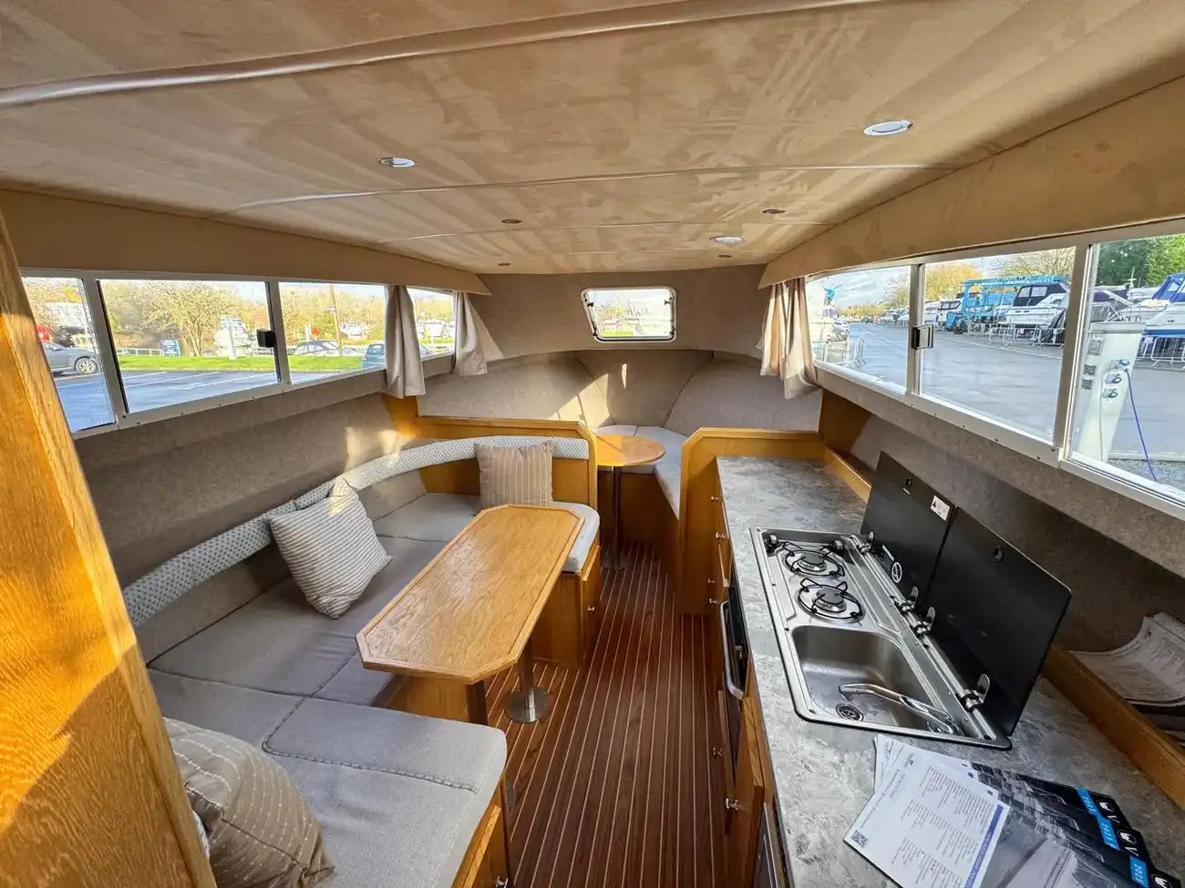 At the heart of the cabin is a U-shaped dinette, which easily converts into a double berth, complemented by V-berths forward. To starboard, opposite the seating area, you’ll find the well-equipped galley, complete with ample storage beneath the worktops. The sink and hob are neatly finished with flush-fitting, fold-down glass covers, maximising worktop space when not in use.