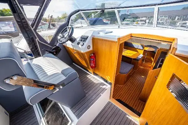 The cockpit features the helm to port with steering via a cable to the outboard, single lever engine controls, and ancillary switches.