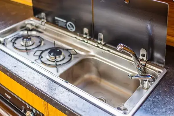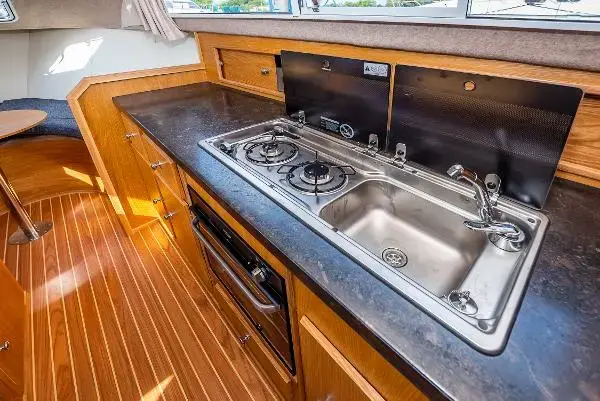 To starboard, opposite the main seating area, is the galley with storage beneath the worktops. The sink and hob are fitted with a flush fitting fold-down glass cover.