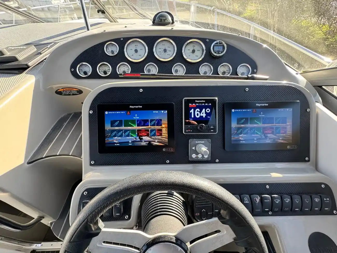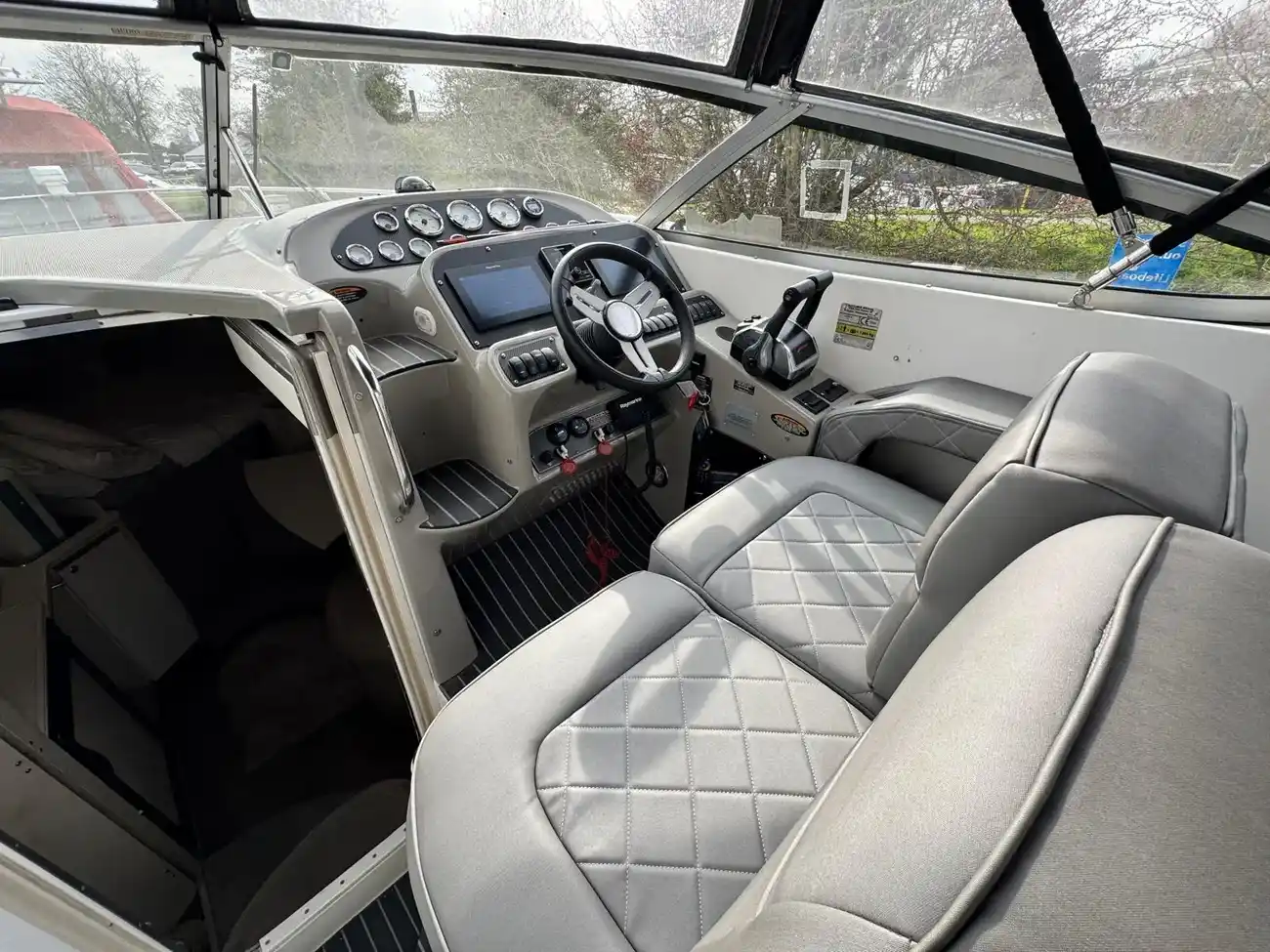 The helm is Stb side and is well laid out and has a lovely sporty feel to it. The helm seat is adjustable as is the steering wheel. Opposite is the navigator’s seat.
