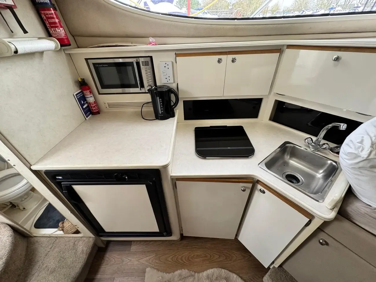 Next is the galley which benefits from an electric hob, microwave, large fridge and ample work surface and storage, single sink with hot and cold water via the calorifier/immersion.