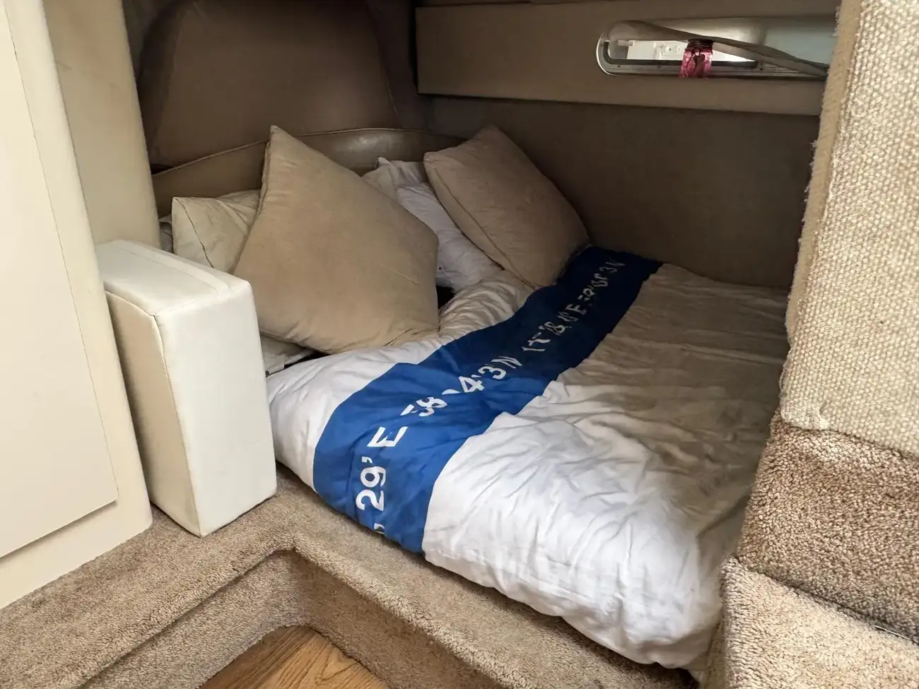 Fwd is the large double berth with its privacy curtain. Again, this has stowage beneath.
