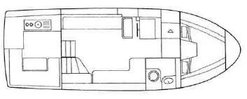Down 4 steps and through the starboard cabin door into a large saloon with L-shaped seating and a cabinet and 12v fridge to starboard.