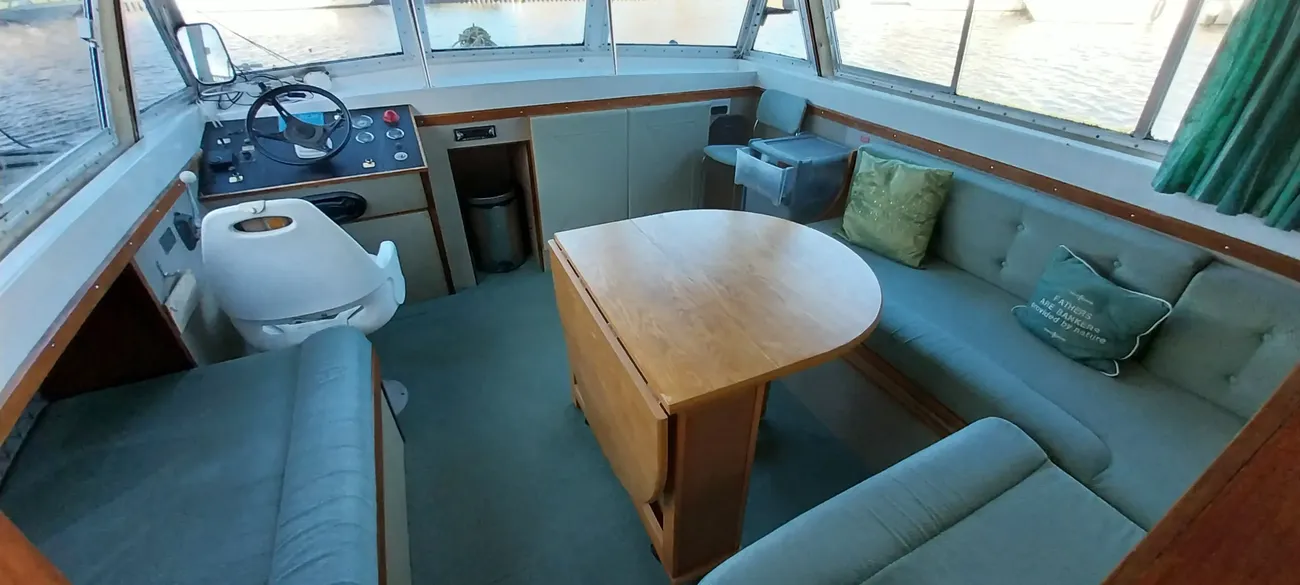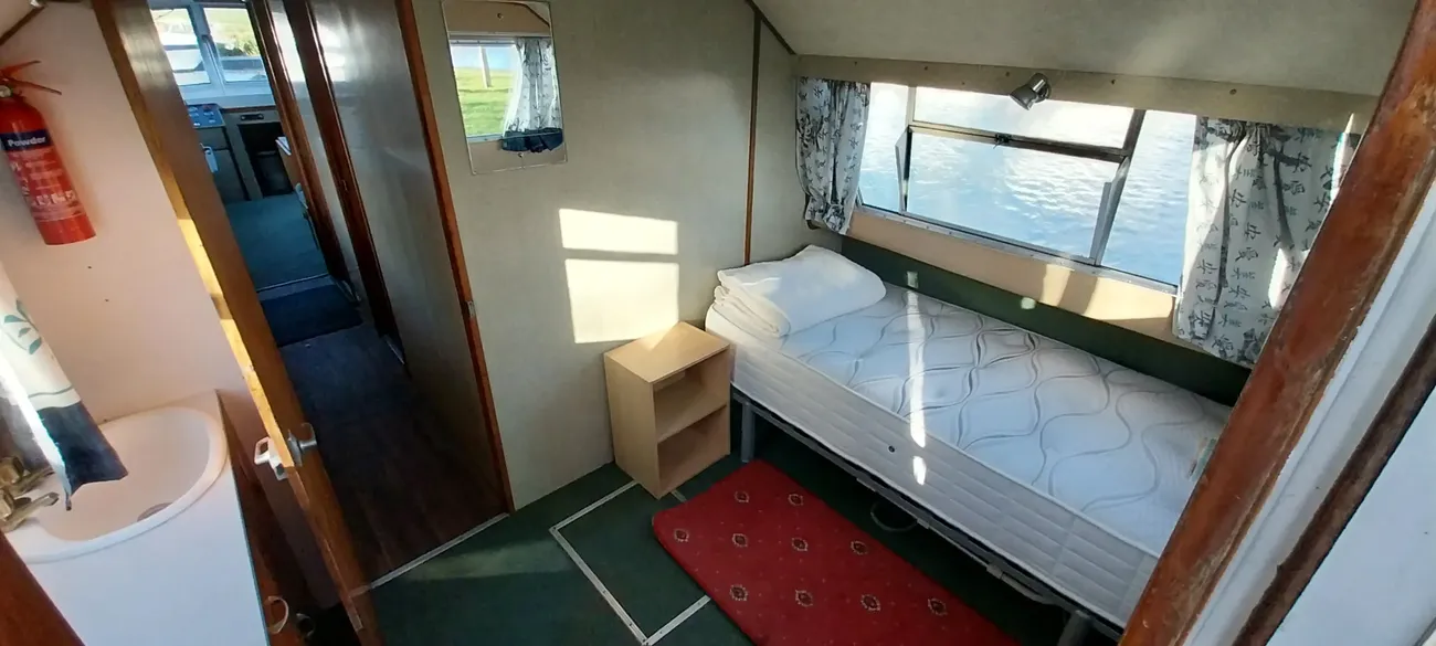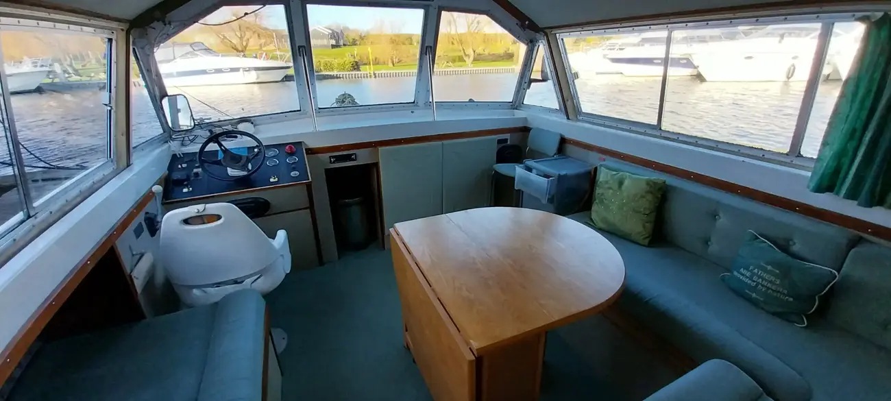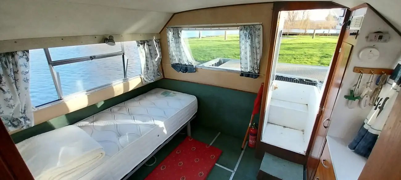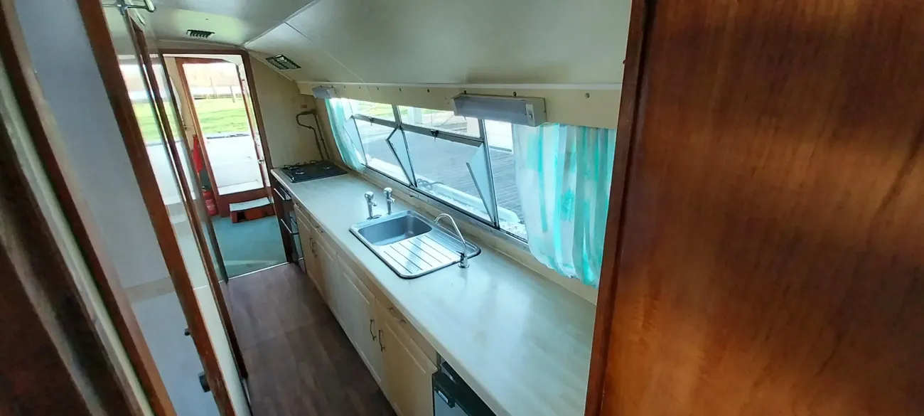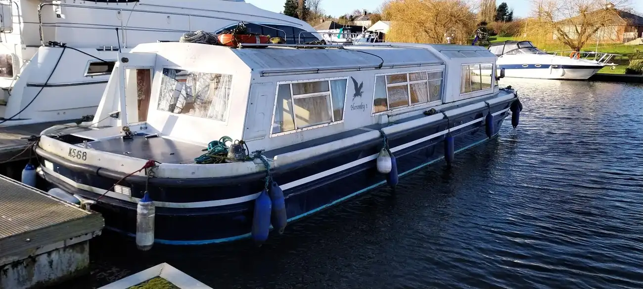 Heronby 1 is a fair example of her type. Offering good size accommodation and with her sliding canopy, the ability to pass under all bridges on the Broads. Fitted with a single toilet and shower compartment. Specifications include: warm air heating, gally fitted with stainless steel single drainer sink, 4 burner gas hob, gas oven and grill, microwave oven, refrigerator, plenty of storage (cupboards and drawers). Overall she is in fair condition but would benefit from a little tlc. Heronby 1 is an ideal craft for both extended cruising or just weekending on her mooring. She has great potential for anyone wishing to find a live aboard.