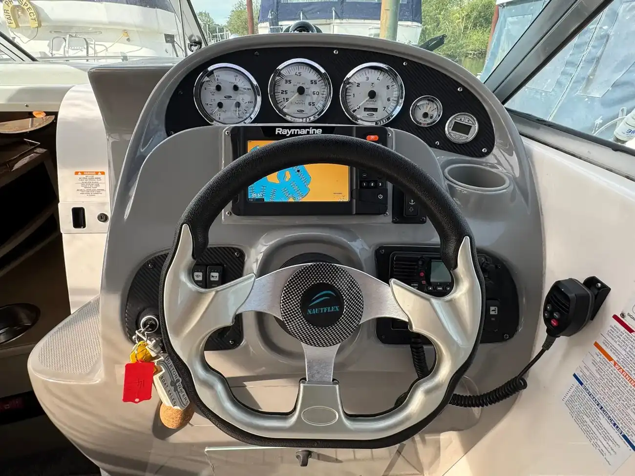 The helm is Stb side and has a lovely sporty feel to it. The helm has a bolster and swivels which allows the seat to be used socially too. It is equipped with a Raymarine plotter, VHF radio, depth sounder and electric windlass.