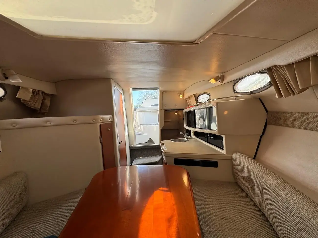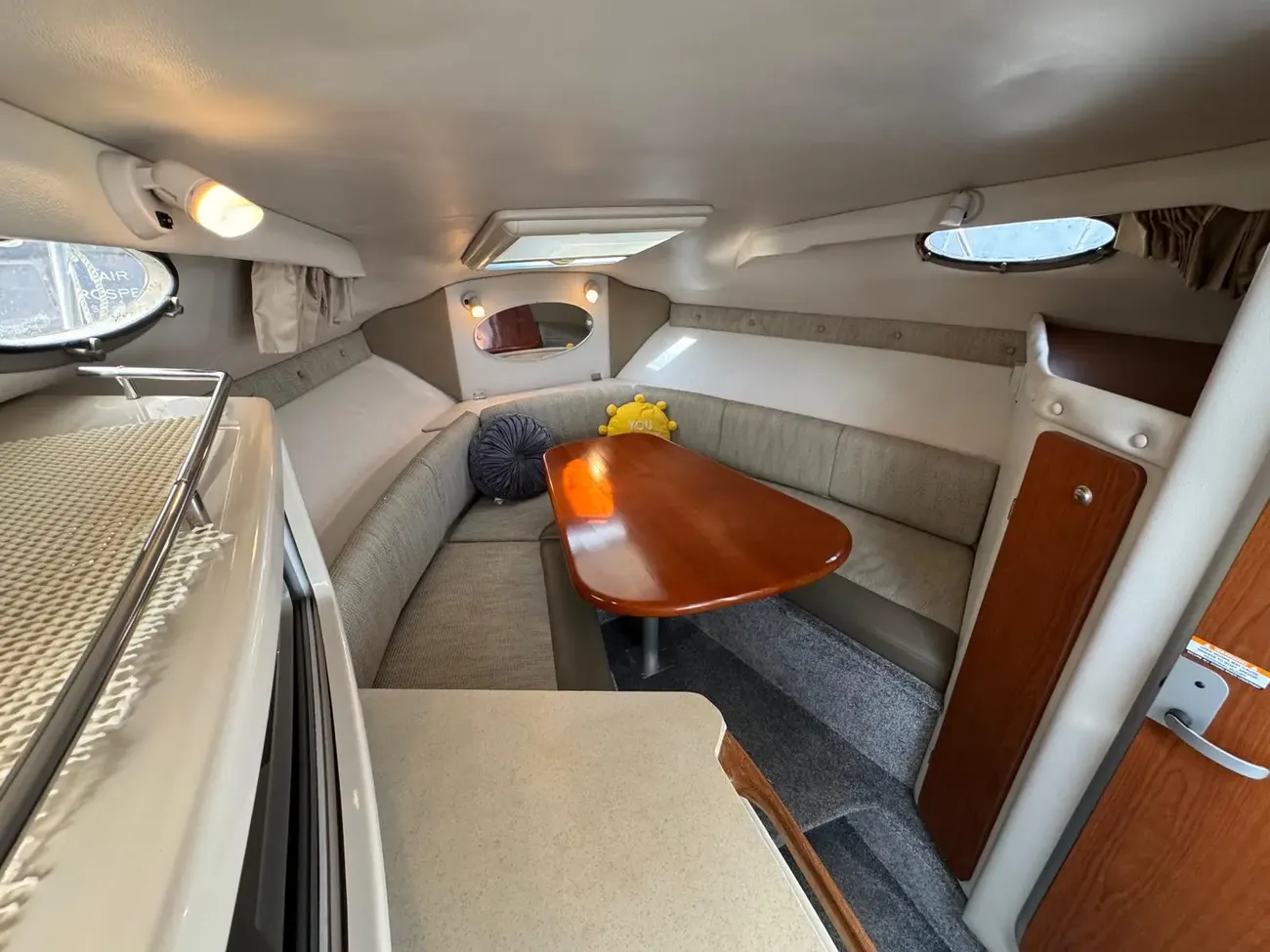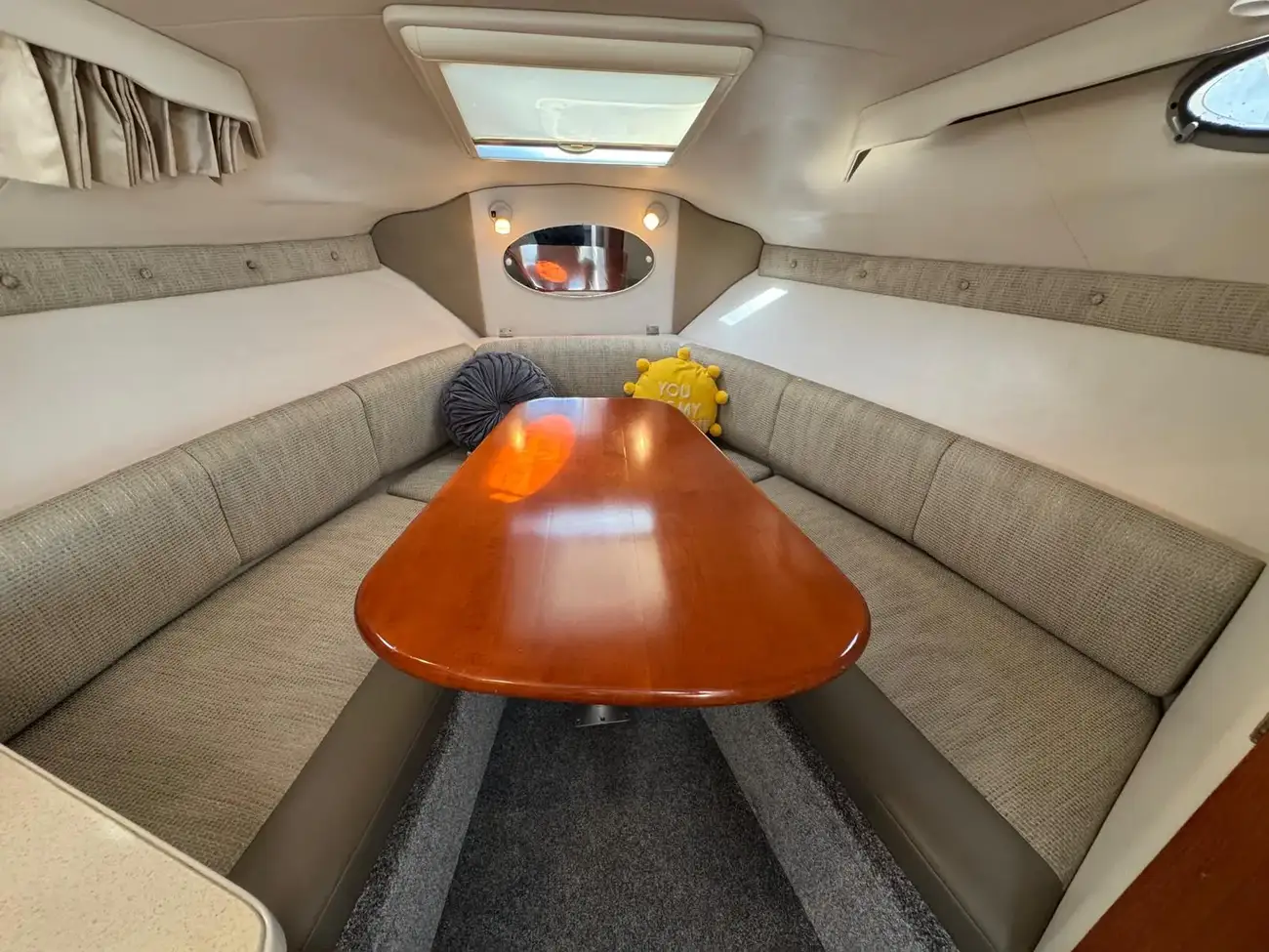 Opposite is the seating area for 4 adults with dining table. The aft bench seat also folds away to give a larger aft cockpit if required. (Engine access beneath).