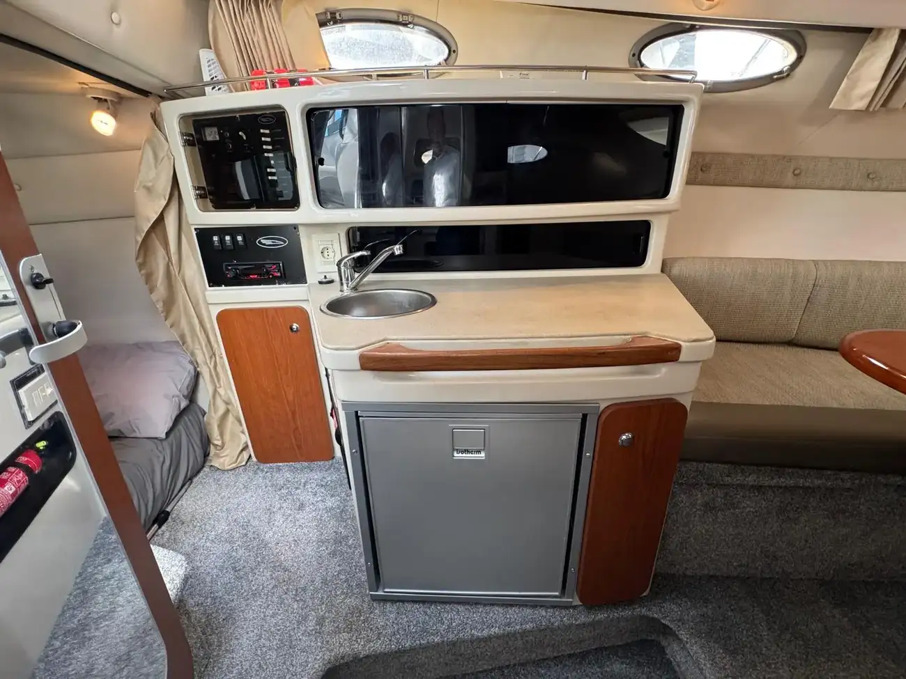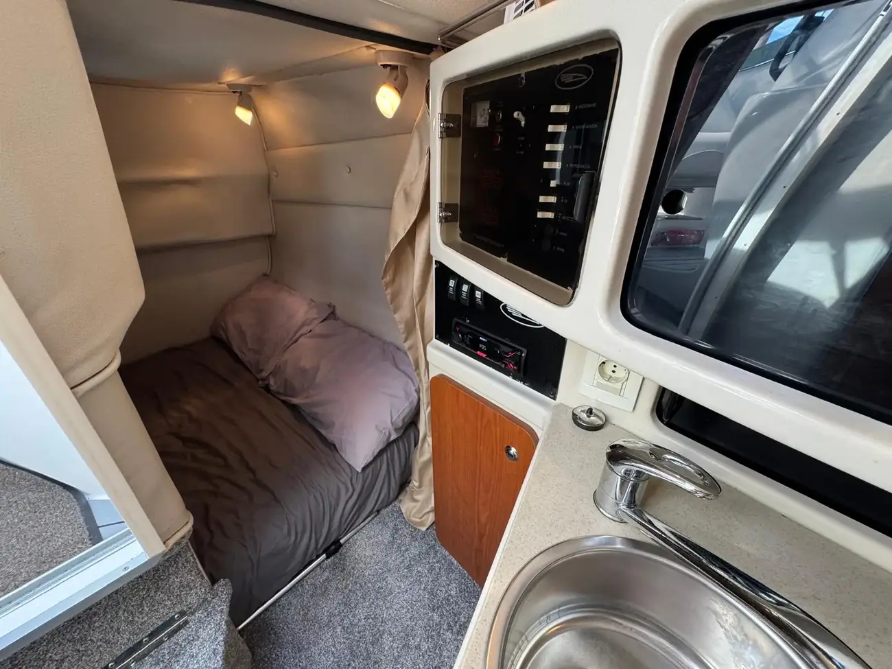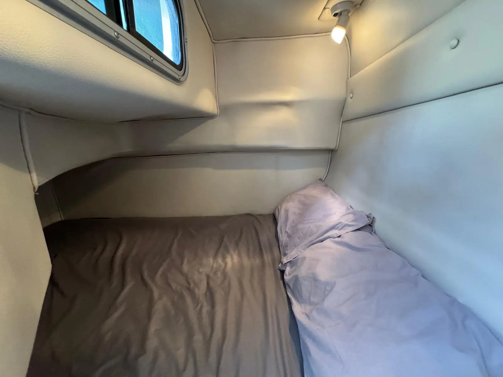 There is an under-cockpit cabin with double berth with overhead reading lights an opening window.