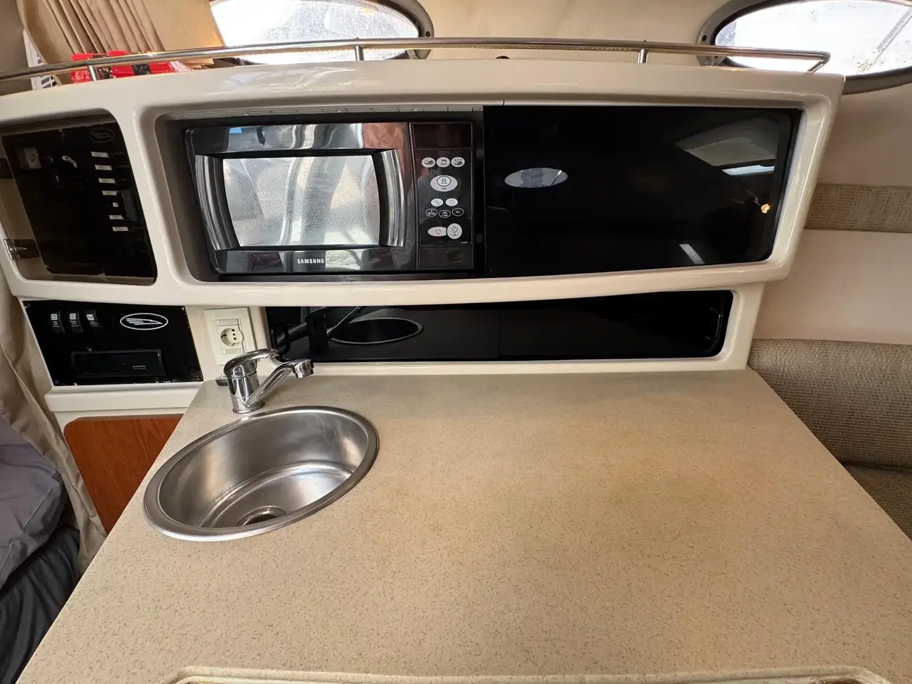 The galley is port side and fitted with a Samsung microwave oven located out of site in a locker, stainless-steel sink with hot and cold mixer taps, (hot water via calorifier) and both eye level and lower-level cupboard space.
