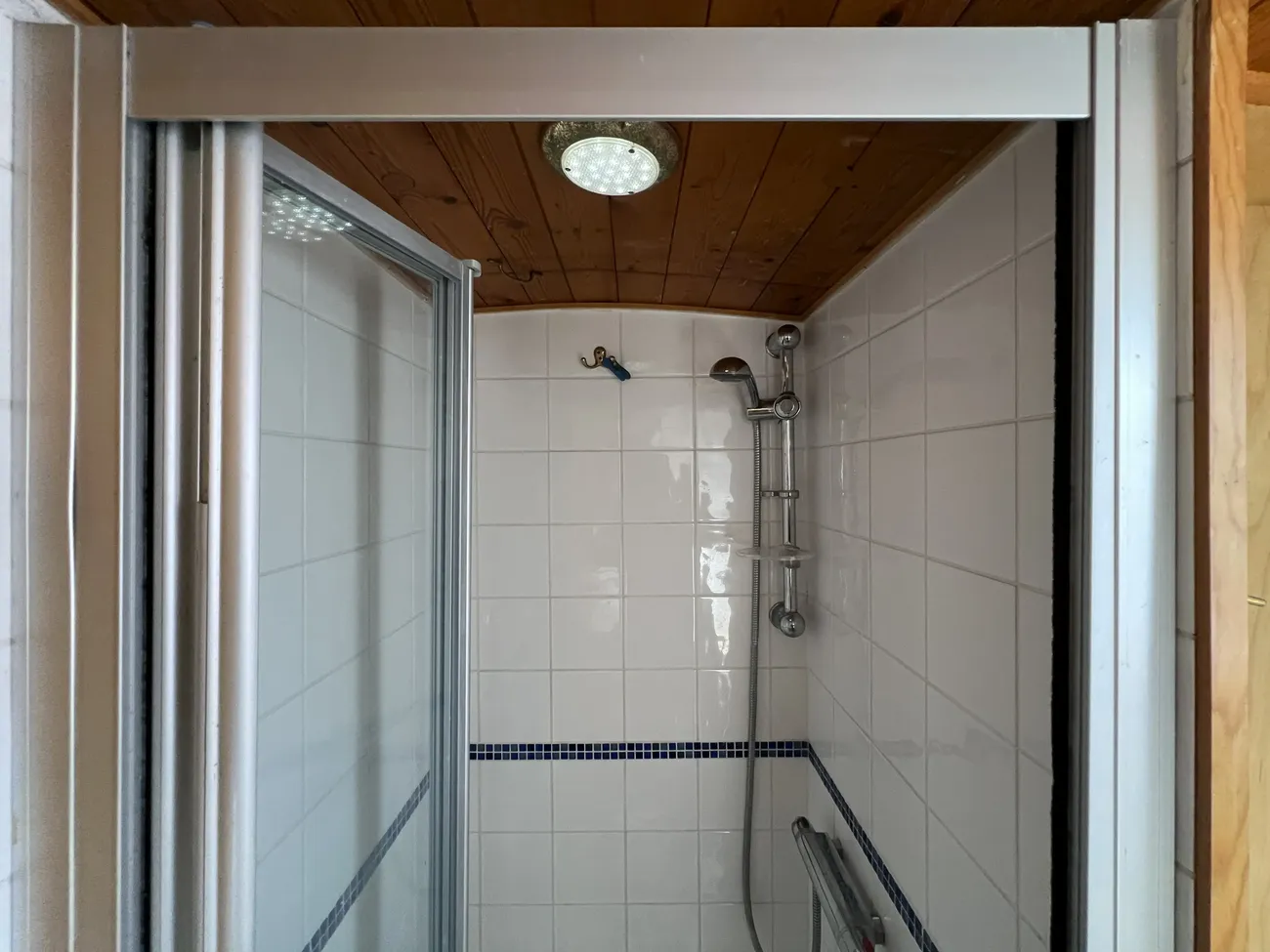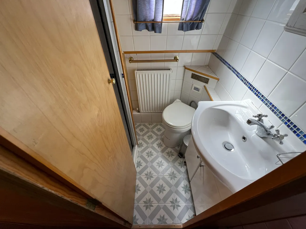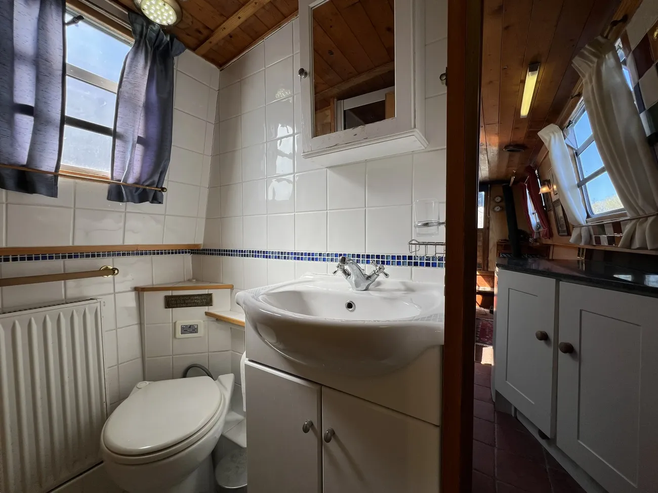 Positioned to port, the bathroom is fitted with a pump-out macerator toilet, a separate shower enclosure, and a ceramic hand basin set within a vanity unit. Additional storage cupboards provide practical onboard convenience.