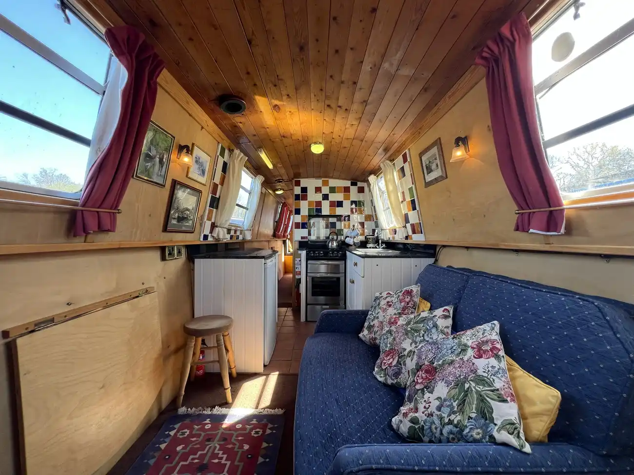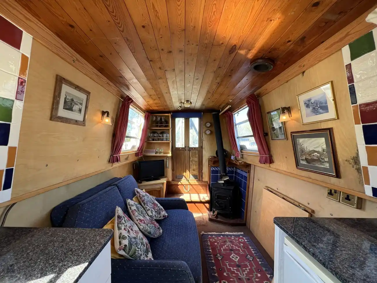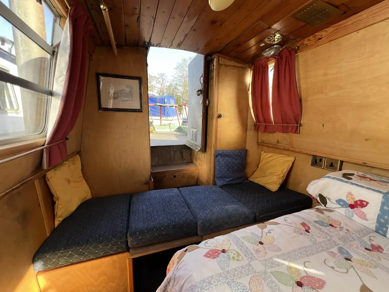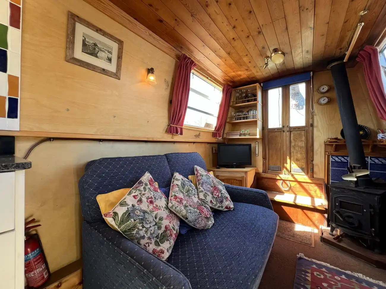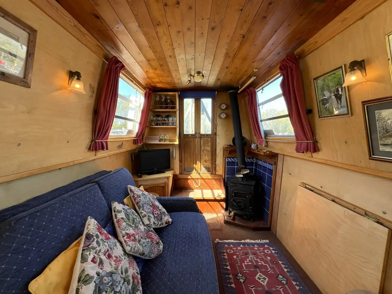Located forward, the saloon provides direct access onto a good-sized bow well deck, ideal for al fresco dining. A sofa bed offers additional sleeping accommodation for two when required, while a fold-out dining table neatly stows under the gunwale when not in use. A multifuel stove, set on a tiled hearth to starboard, provides warmth and comfort for year-round cruising.