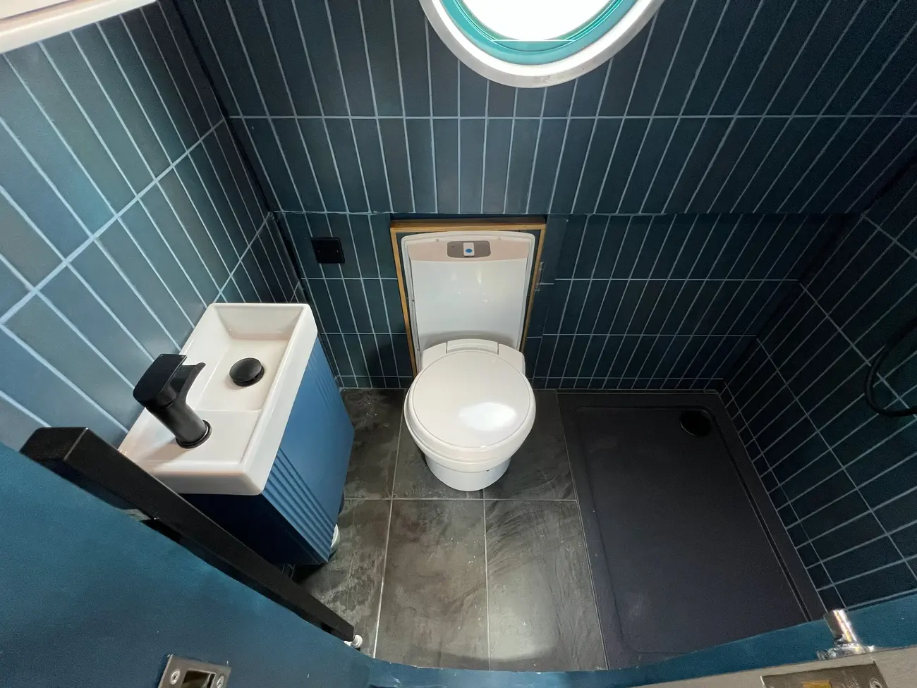 A spacious bathroom, entered via a sliding door, is fitted with a Thetford cassette toilet, a large separate shower enclosure, and a vanity unit with ceramic hand basin. A heated towel rail adds comfort.