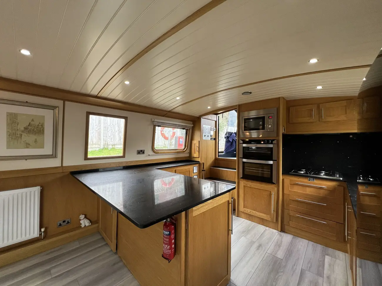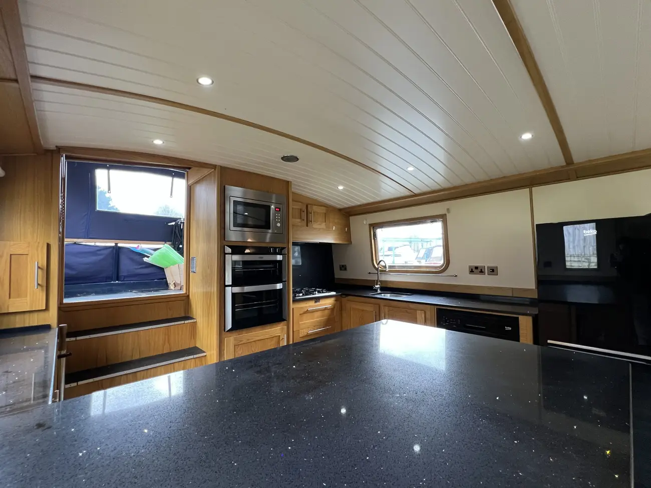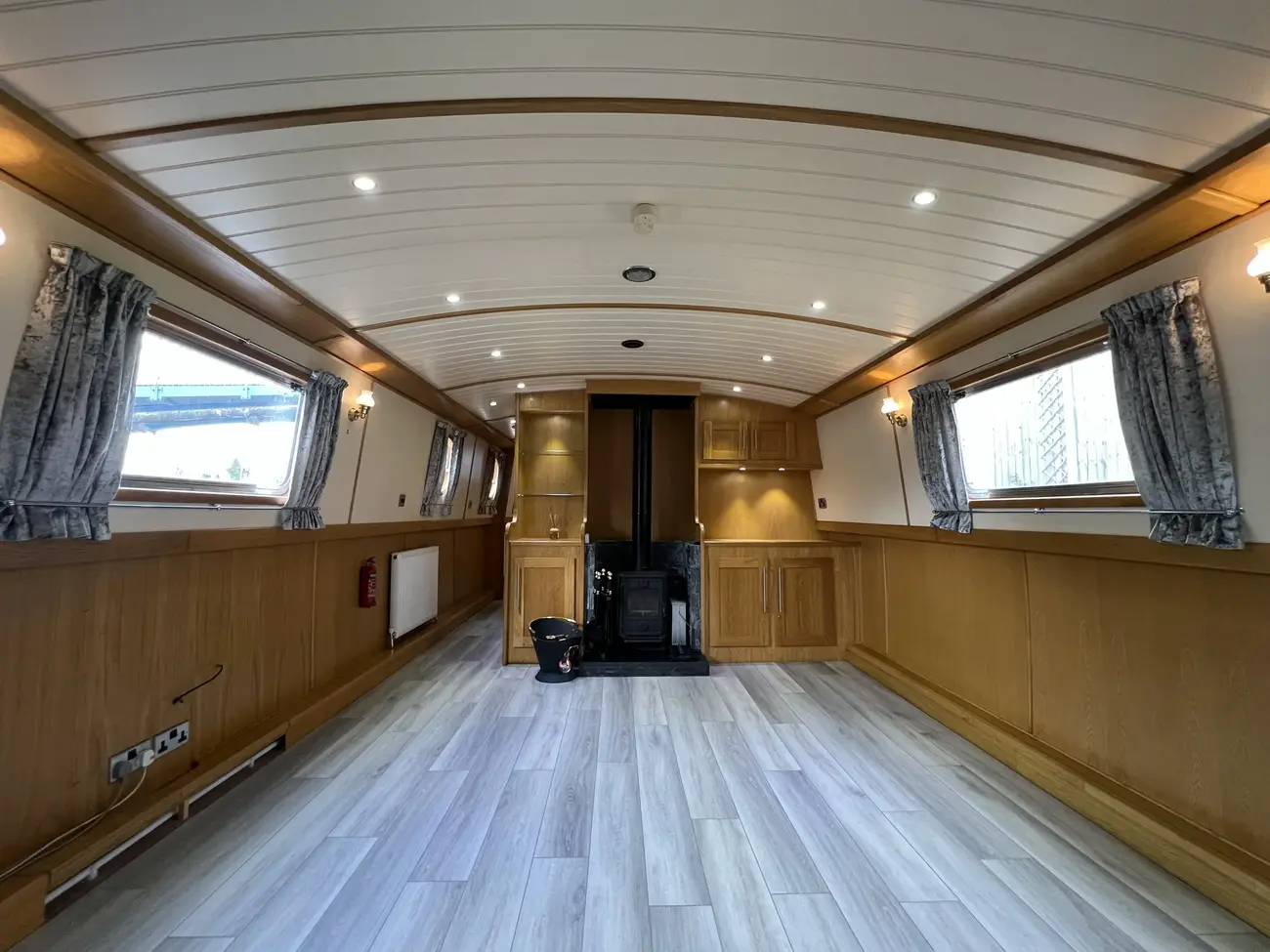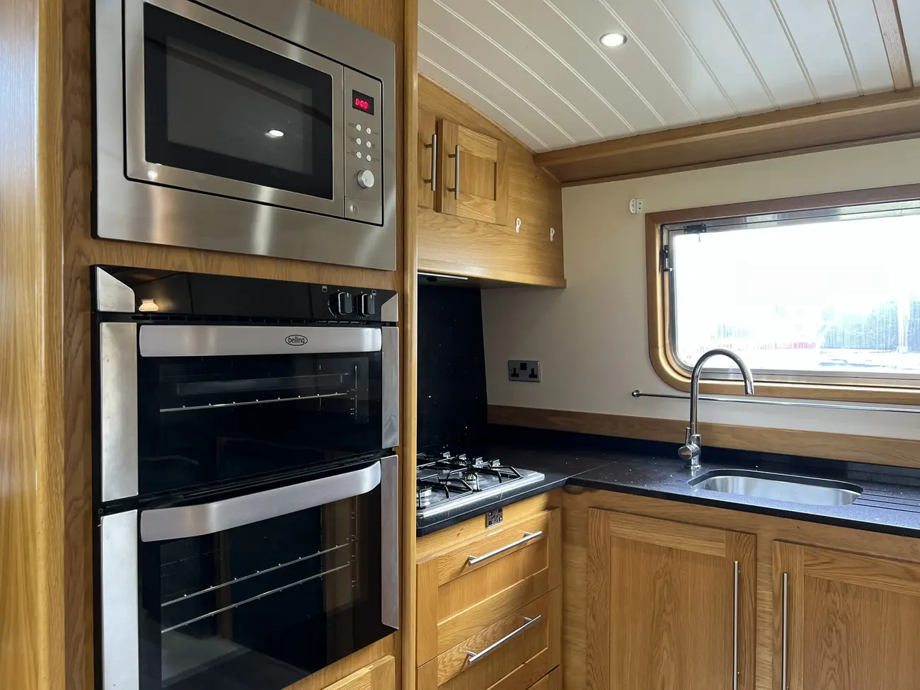 The open-plan saloon is spacious and versatile, offering ample room for free-standing furniture to suit individual tastes. A Morso Swift multifuel stove with tiled surround creates a warm focal point, with built-in cupboards and shelving positioned either side. Provision has been made for a television via under-gunnel wiring. A sofa bed could easily be incorporated to provide additional guest accommodation if required. The combined saloon and galley area forms a fantastic social hub, ideal for entertaining.