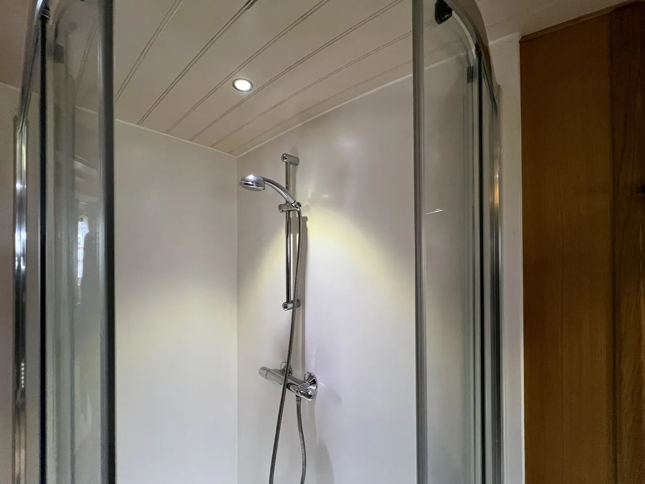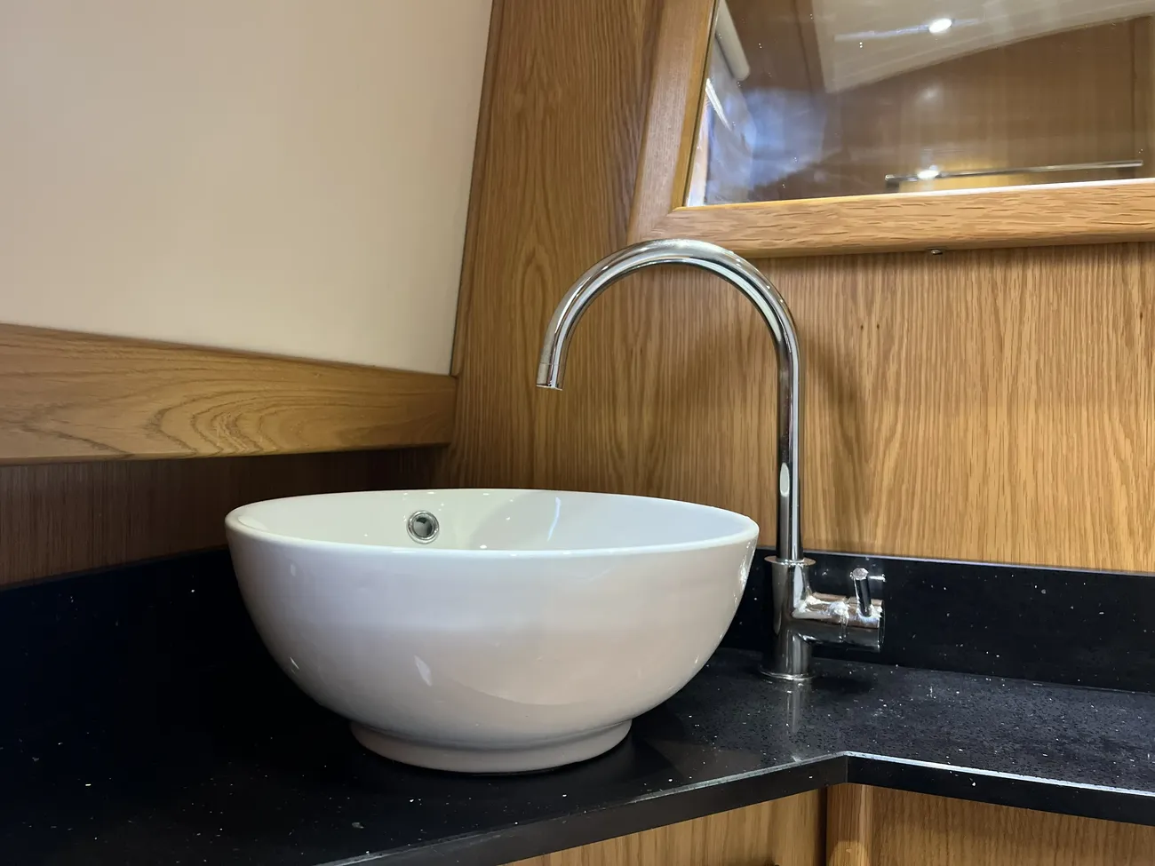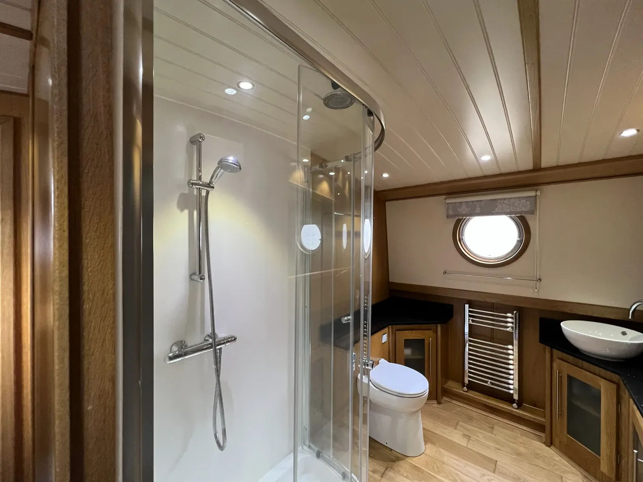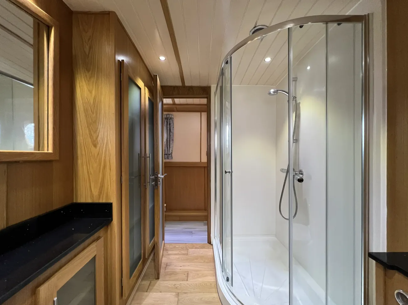 A short corridor leads from the saloon to the generously proportioned bathroom. This well-appointed space features a ceramic basin mounted on matching granite work surfaces, a large separate shower enclosure, heated towel rail, and a pump-out macerator toilet, with a Porta Potti available if required. Useful cupboards and cabinets provide additional storage.