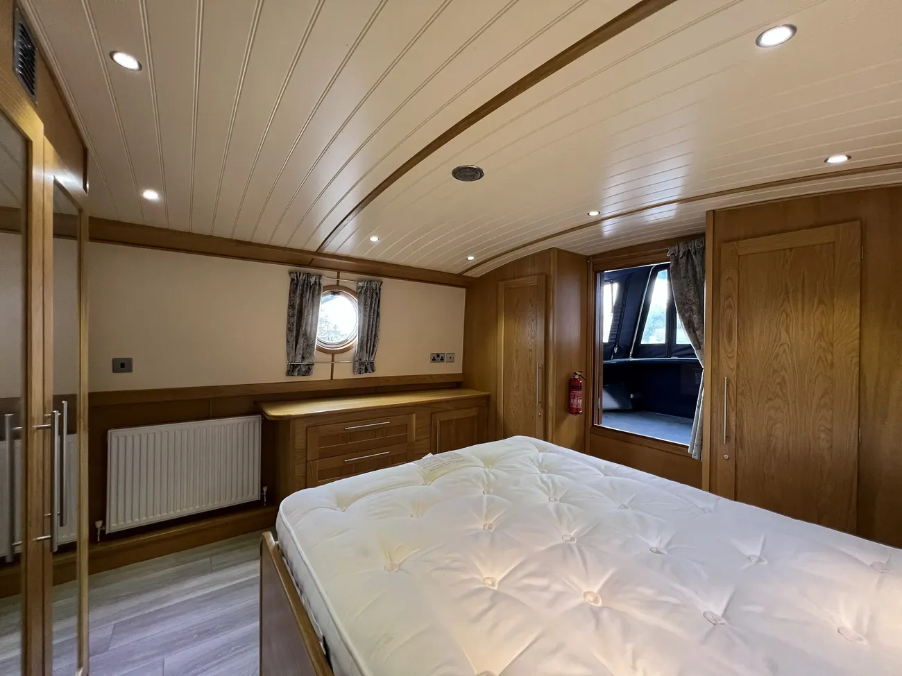 Located forward, the master cabin offers direct access onto the bow well deck. The fixed double berth includes reading lights and substantial storage beneath. Three large mirrored hanging wardrobes provide excellent clothes storage, complemented by built-in bedside cabinets and three large drawers opposite. Additional wardrobes with shelving space are positioned either side of the bow doors, creating exceptional storage capacity for liveaboard comfort.