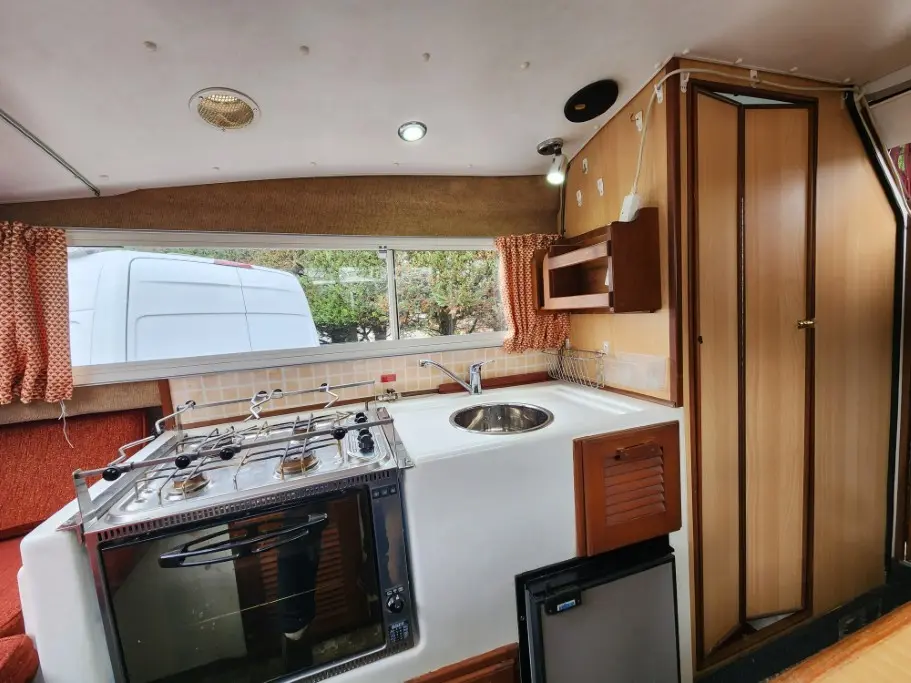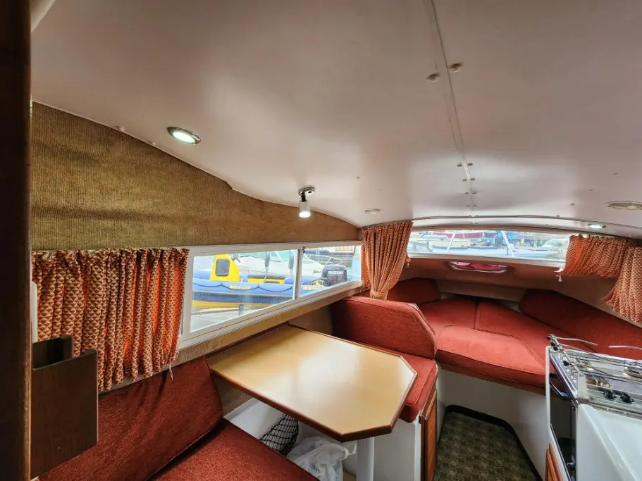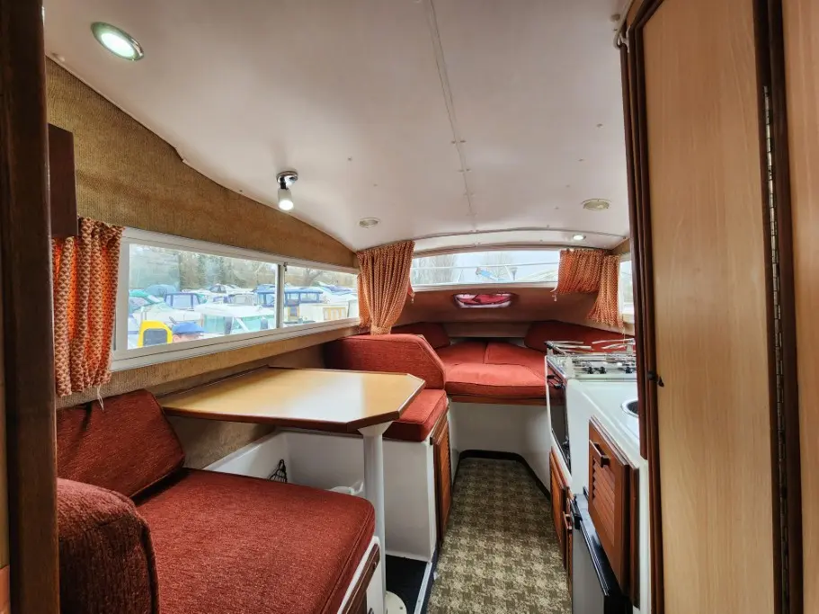 The galley includes a built in fridge, a gas cooker and 4 burner hob. There is a dinette table on the port side that lowers to create a double berth for guests. The bow area seating opens out as a comfortable and spacious sleeping area.