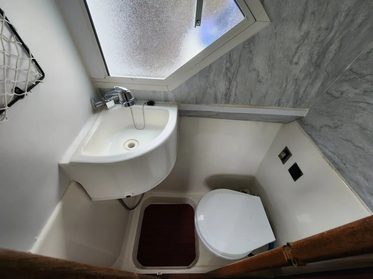 As you enter the cabin, you have a good sized storage cupboard on the port side and the heads on the starboard side has an electric pumpout toilet.