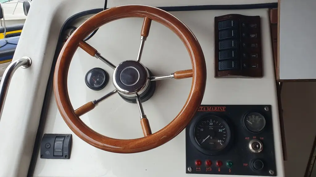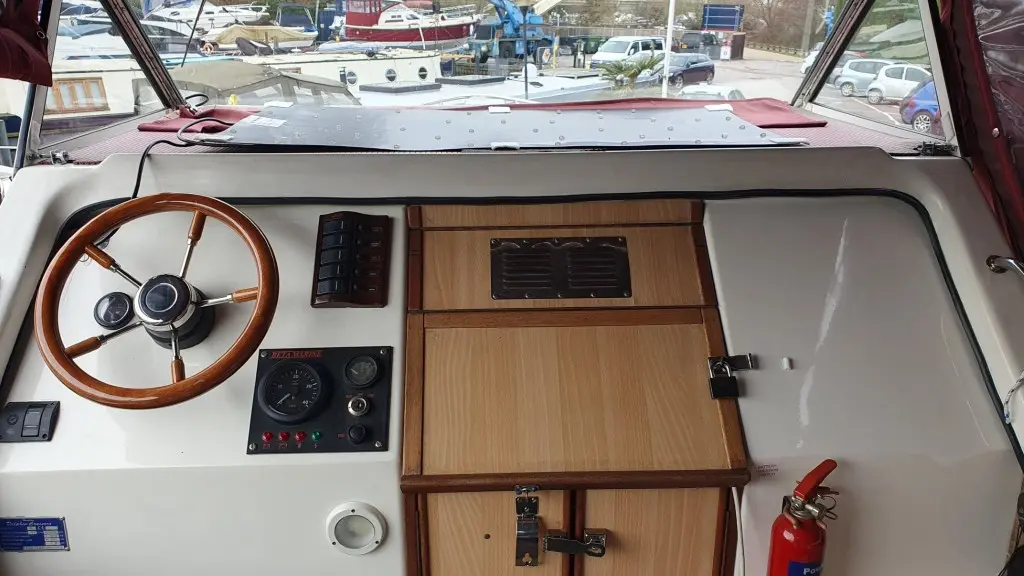The cockpit has ample seating with good condition upholstery and a folding Helmsman's chair at the wheel.