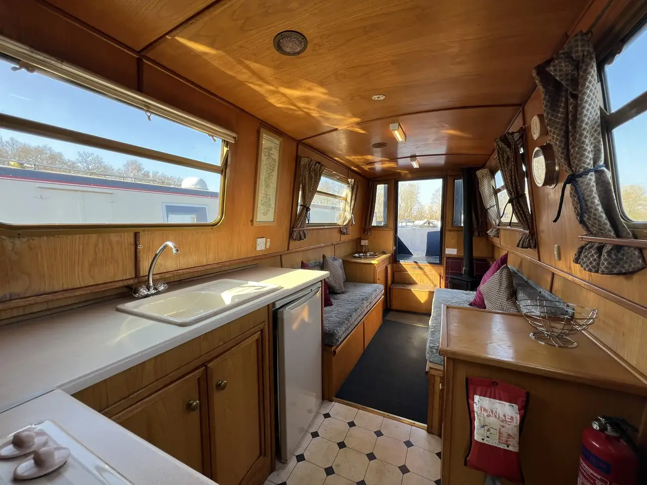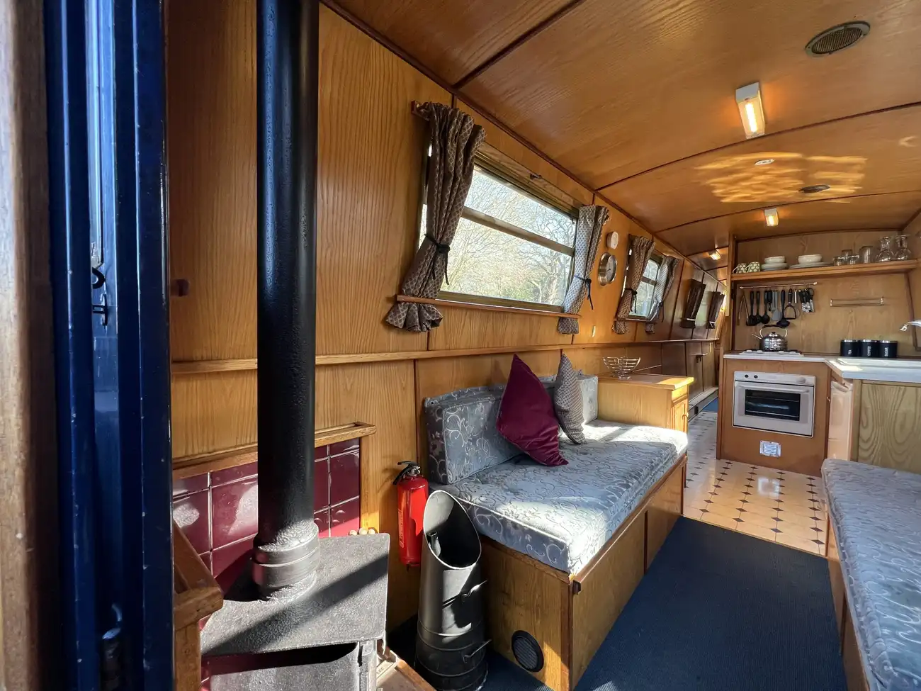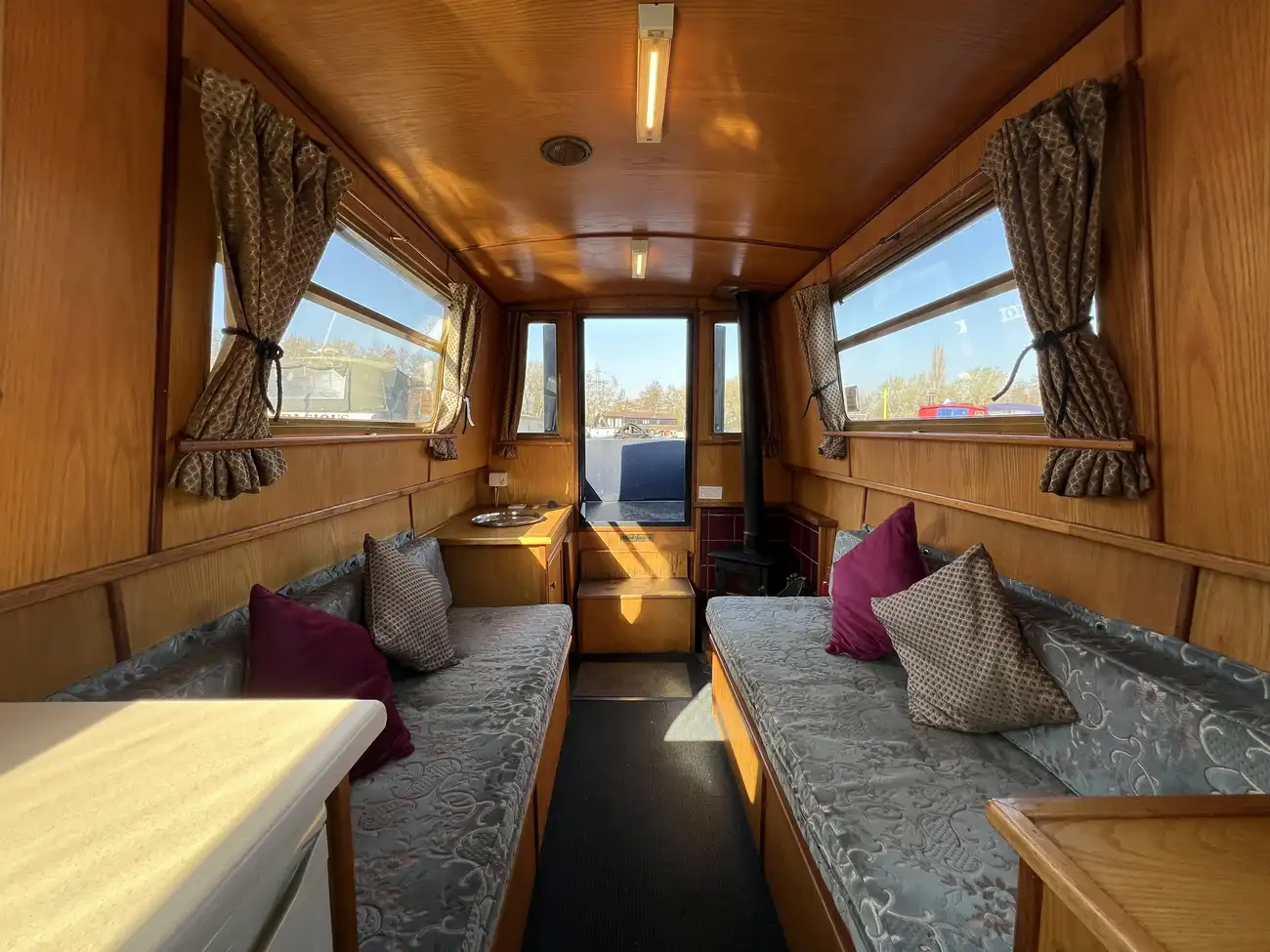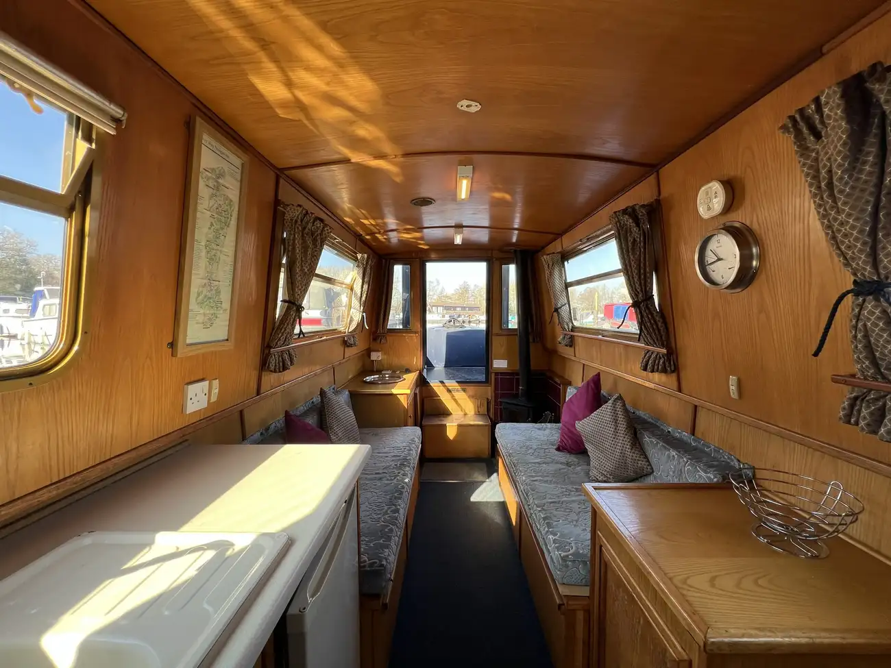 Located forward, the saloon benefits from direct access onto the bow well deck. Built-in port and starboard bench seating converts into an across-width double berth, providing additional sleeping accommodation for two when required, with useful storage found beneath both seats. Two storage cupboards and a removable dining table neatly stows under the gunwale when not in use. A Boatman multifuel stove on a tiled hearth, provides ample heat for comfortable year-round cruising.