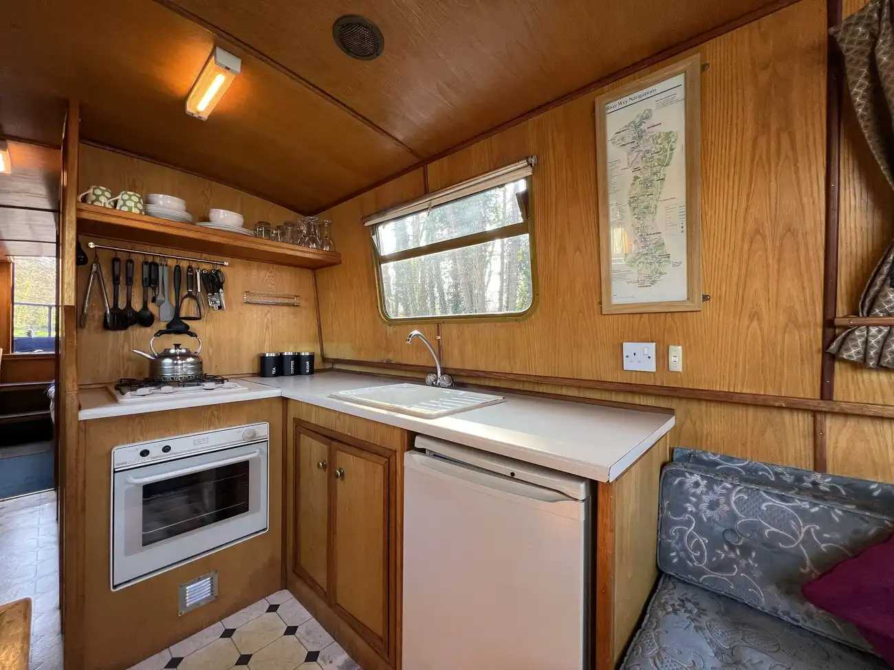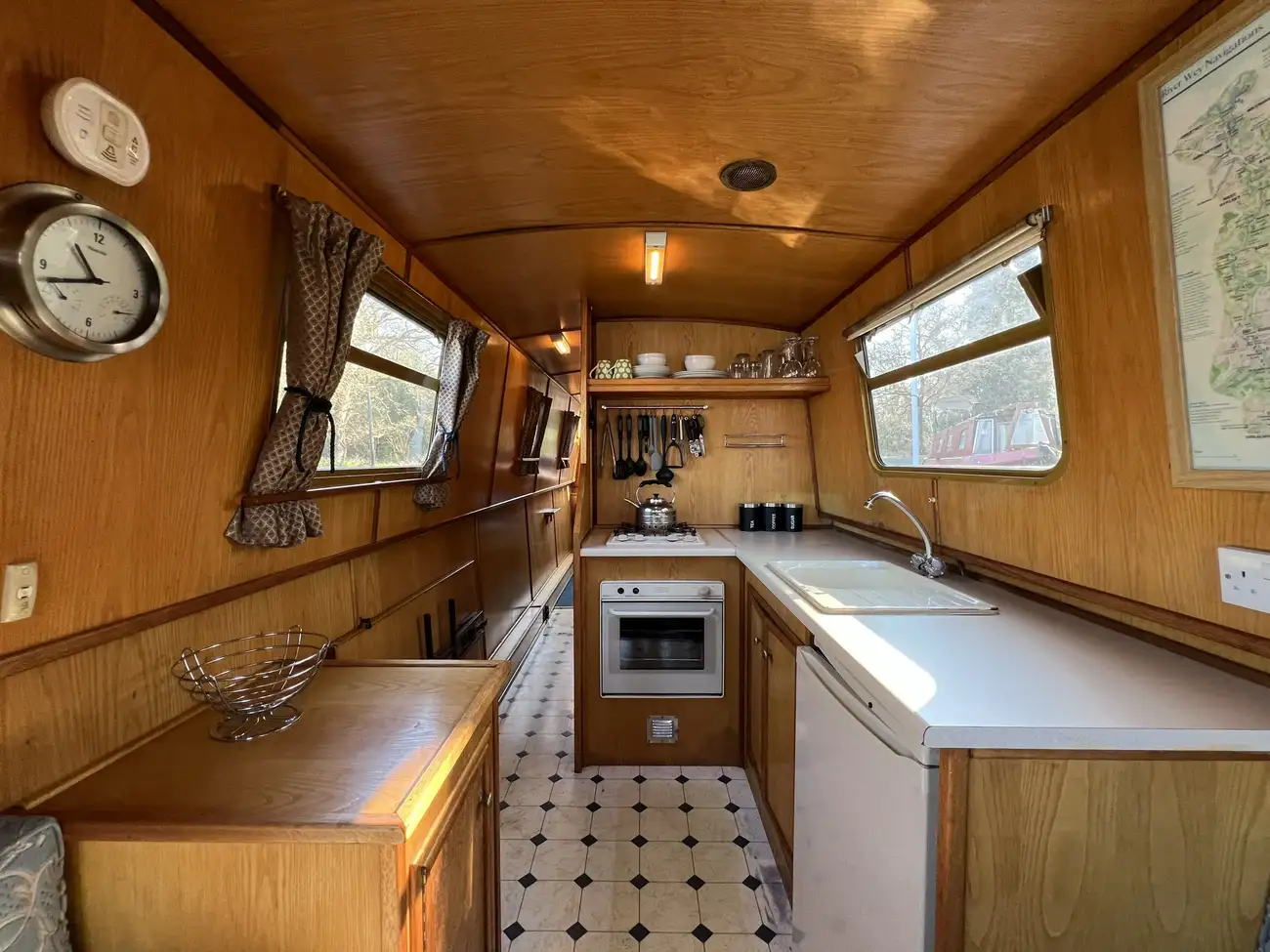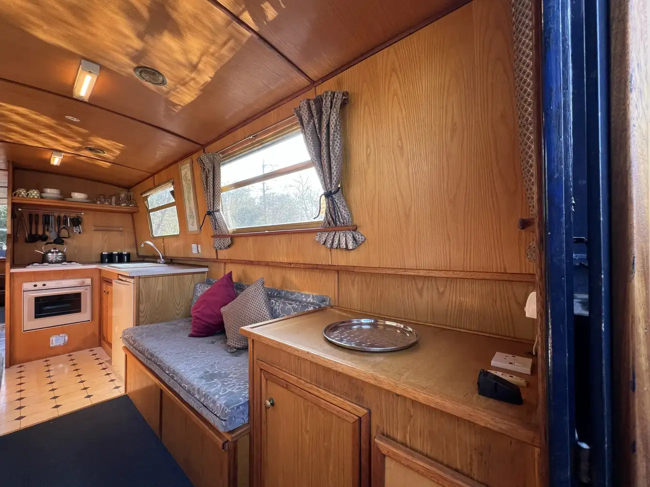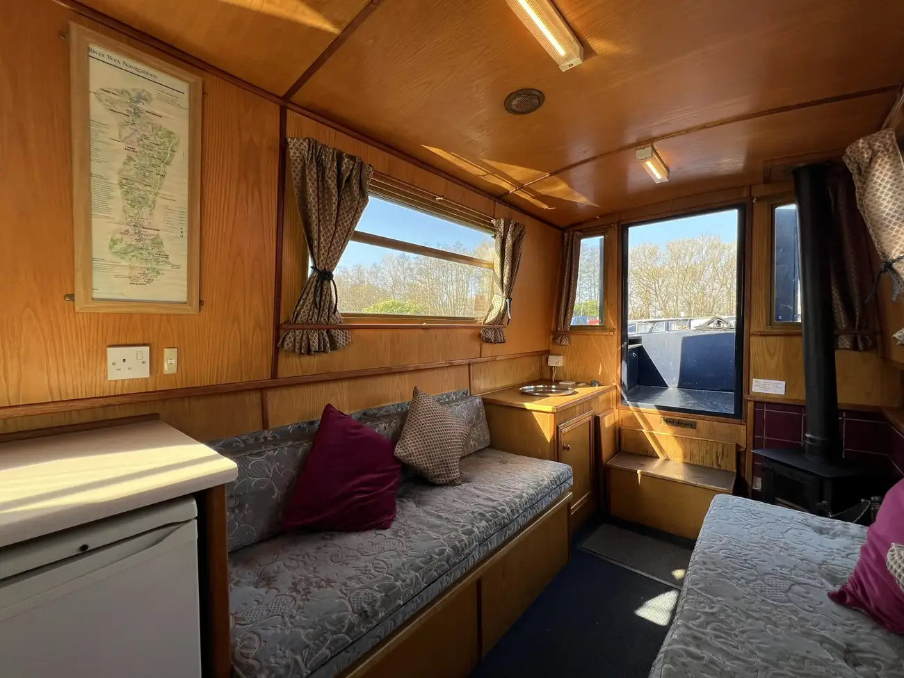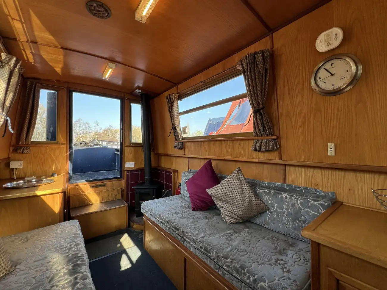 Located forward, the saloon benefits from direct access onto the bow well deck. Built-in port and starboard bench seating converts into an across-width double berth, providing additional sleeping accommodation for two when required, with useful storage found beneath both seats. Two storage cupboards and a removable dining table neatly stows under the gunwale when not in use. A Boatman multifuel stove on a tiled hearth, provides ample heat for comfortable year-round cruising.