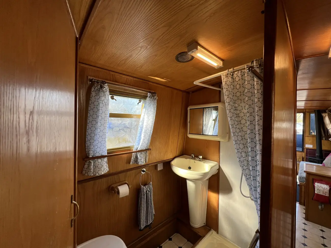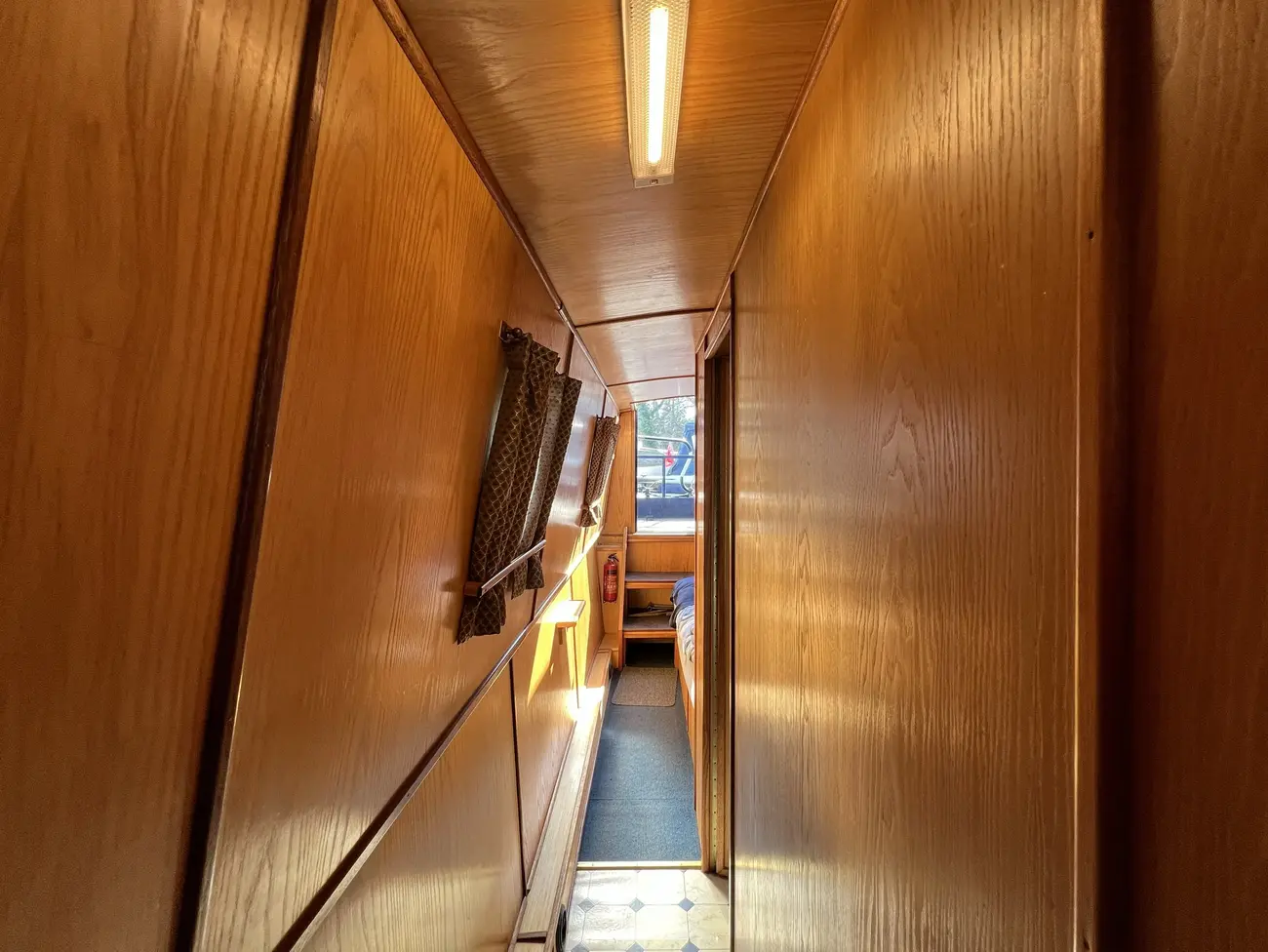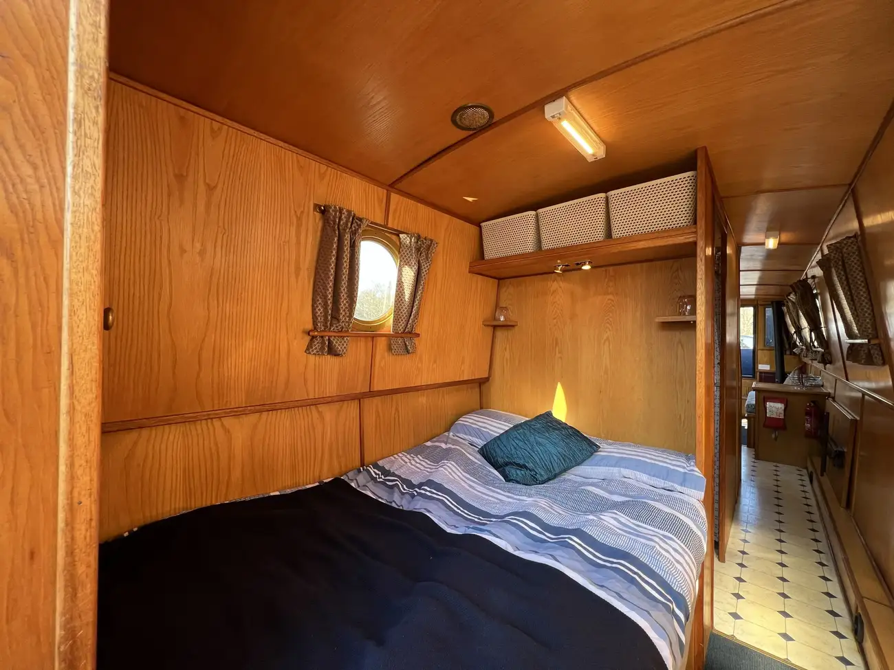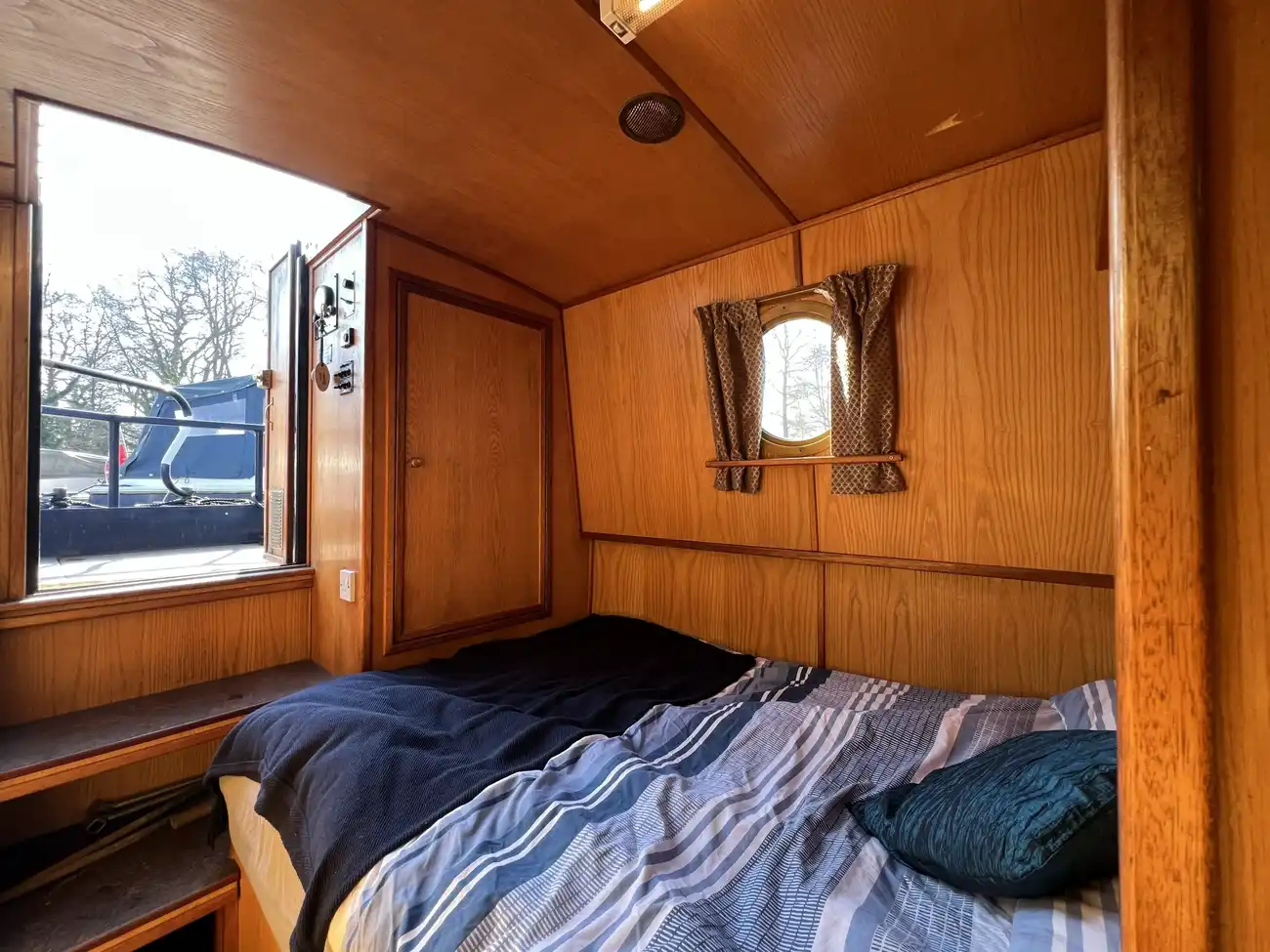 Located forward, the saloon benefits from direct access onto the bow well deck. Built-in port and starboard bench seating converts into an across-width double berth, providing additional sleeping accommodation for two when required, with useful storage found beneath both seats. Two storage cupboards and a removable dining table neatly stows under the gunwale when not in use. A Boatman multifuel stove on a tiled hearth, provides ample heat for comfortable year-round cruising.