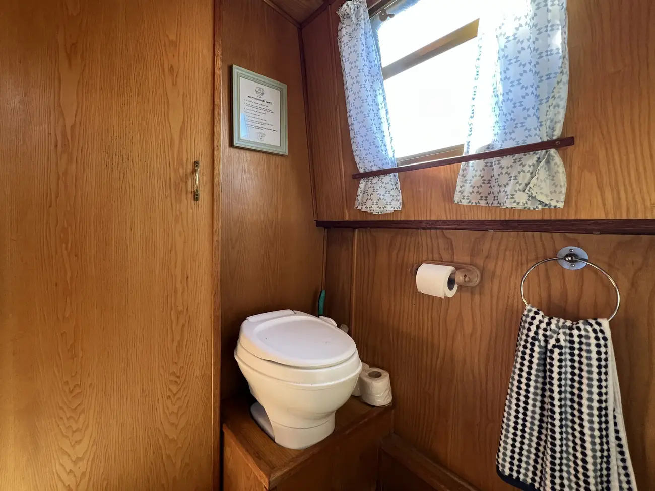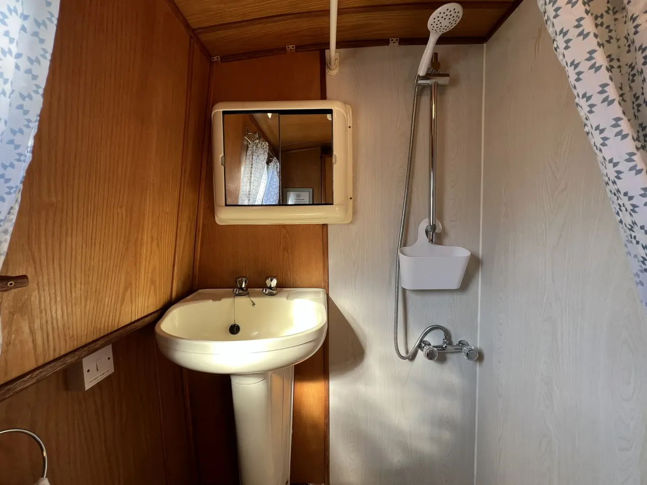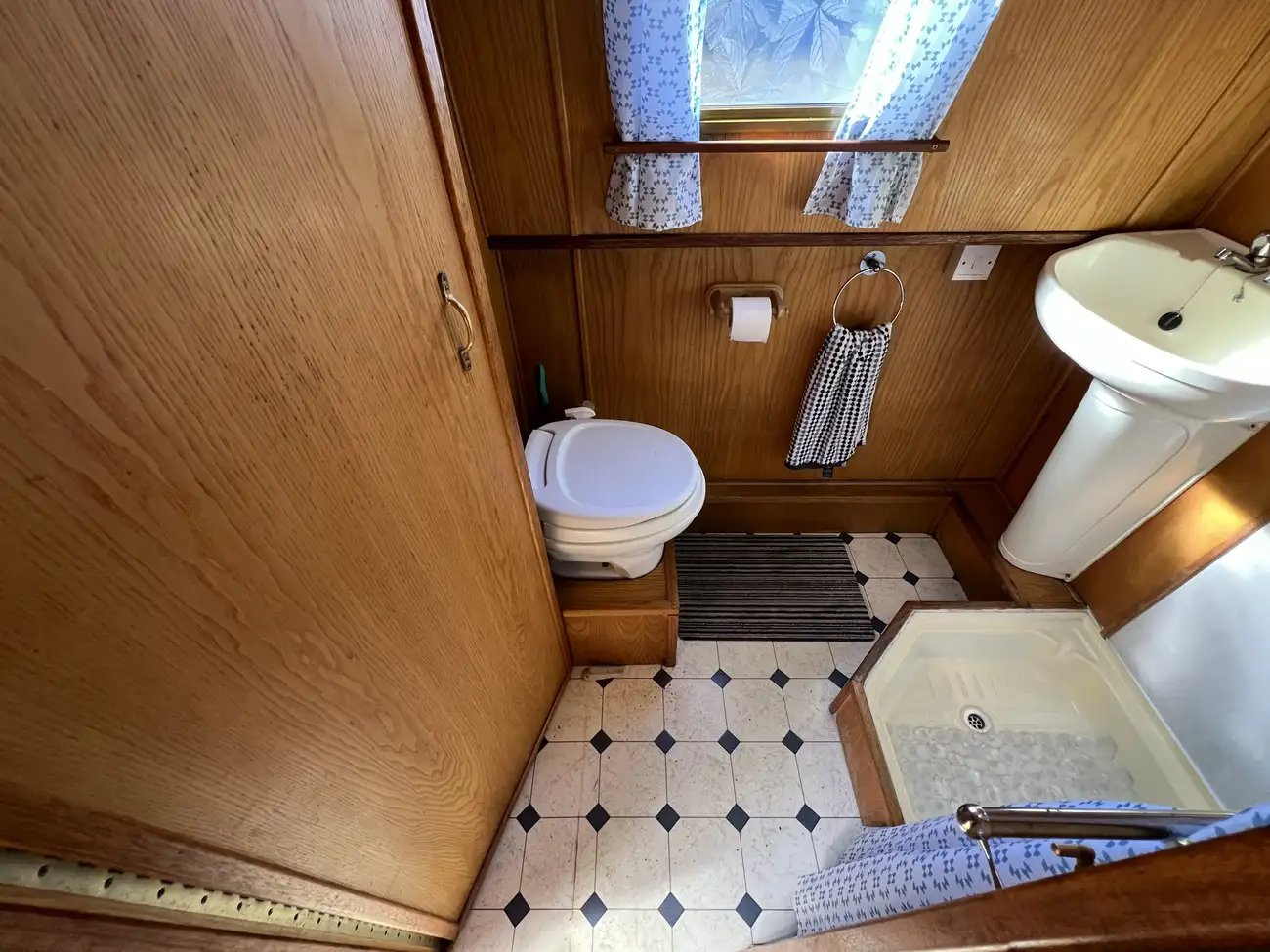 The bathroom (heads) makes efficient use of the available space and is fitted with a shower, hand basin, and pump-out toilet, providing practical and comfortable onboard facilities.