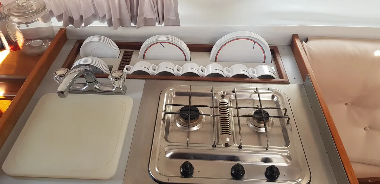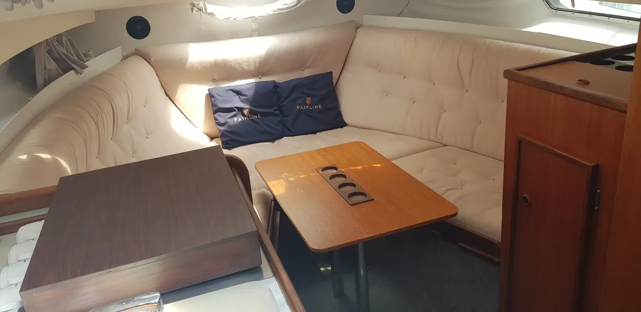 The accommodation provides 4 berths via a U shaped seating area with a large table that converts into a double berth and a double beneath in the cockpit sole at mid-ships. The galley is locatted to port and is equipped with a stainless steel sink, twin burner gas stove and grill, electric fridge and ample stowage. There is also additional recessed spaces for crockery. The toilet compartment is starboard side and is fitted with a sea toilet and a shower.