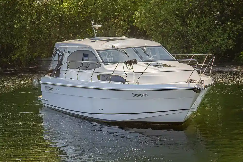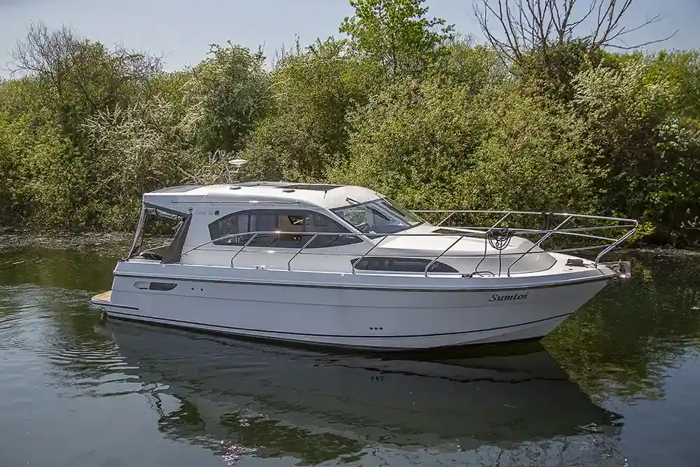 The featured vessel, Sumtoi, is a testament to Haines' dedication to quality & craftsmanship. The Haines 32 Sedan is more than just a boat; it's a gateway to a lifestyle of exploration and relaxation. Sliding doors and the Optional port side door by the helm open up the interior, ensuring everyone onboard feels connected, whether inside the  cabin or outside enjoying the weather. The boat features a double berth master cabin located at the bow, while additional space in the saloon area caters to guests. A luxurious walnut finish exhumes quality throughout the vessel, complemented by a sophisticated avonite worktop in the galley area, reflecting a modern yet warm ambiance. This reliable Nanni engine ensures smooth and efficient navigation.. Equipped with bow and stern thrusters, the boat is easy to handle and moor, providing assurance and control in various marine environments. Sumtoi is presented in "as new" condition and now at over £100,000 less than a new build today. Newly surveyed, polished and antifouled "Sumtoi" is ready to immediately make use of.