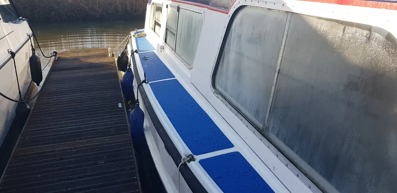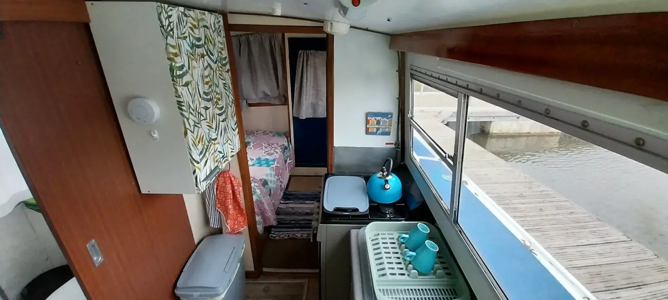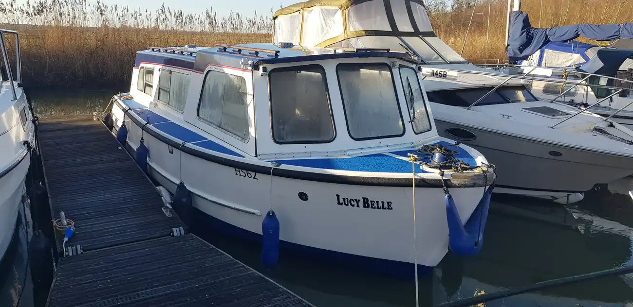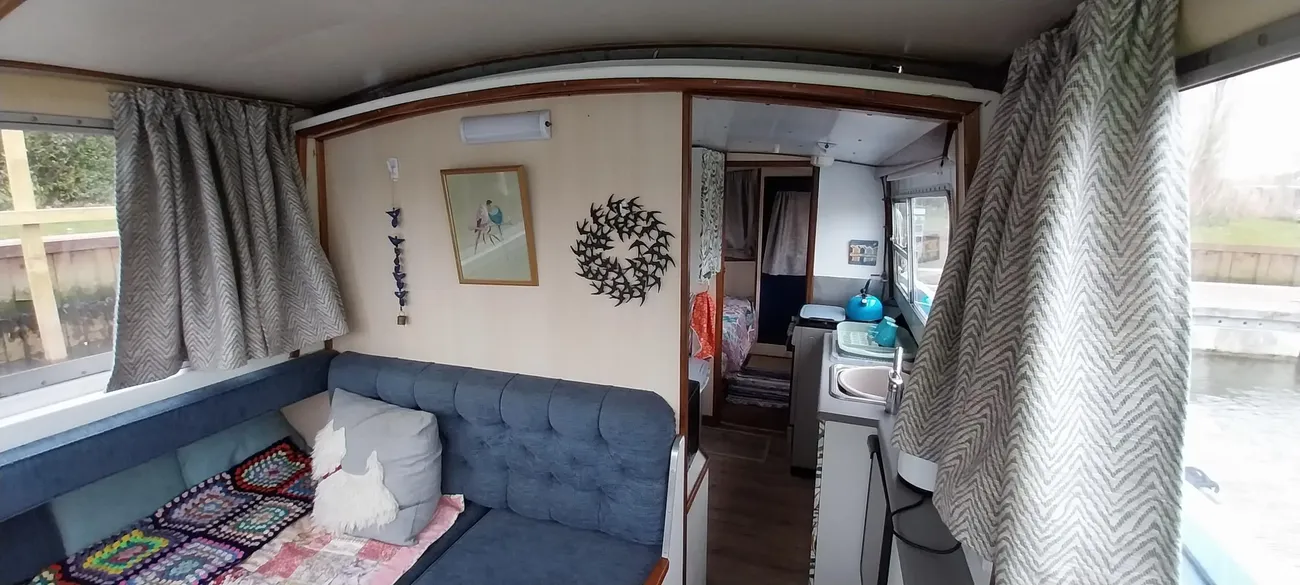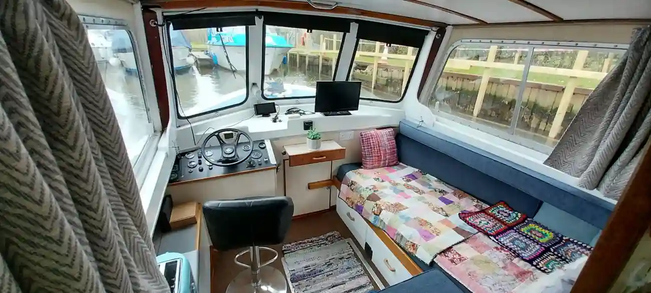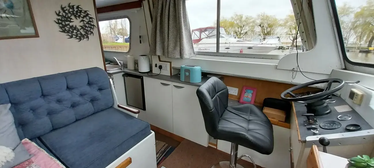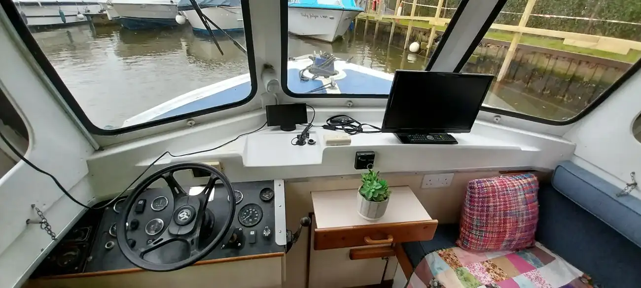 Presented to a good standard, she is a typical example of the ever popular Hampton Safari, well suited to the Broads or indeed to rivers and canals. Easy to handle especially with the reversing camera and monitor (Included but not fitted). Air draft allows clearance on most bridges with ease. She of course benefits from the sliding roof to the Wheel and saloon, perfect for those sunny afternoons or long hot summer evenings. The saloon itself offers a great social space, the wheel being to port, with the large L-shaped sofa to starboard. She includes a colour tv with ariel.