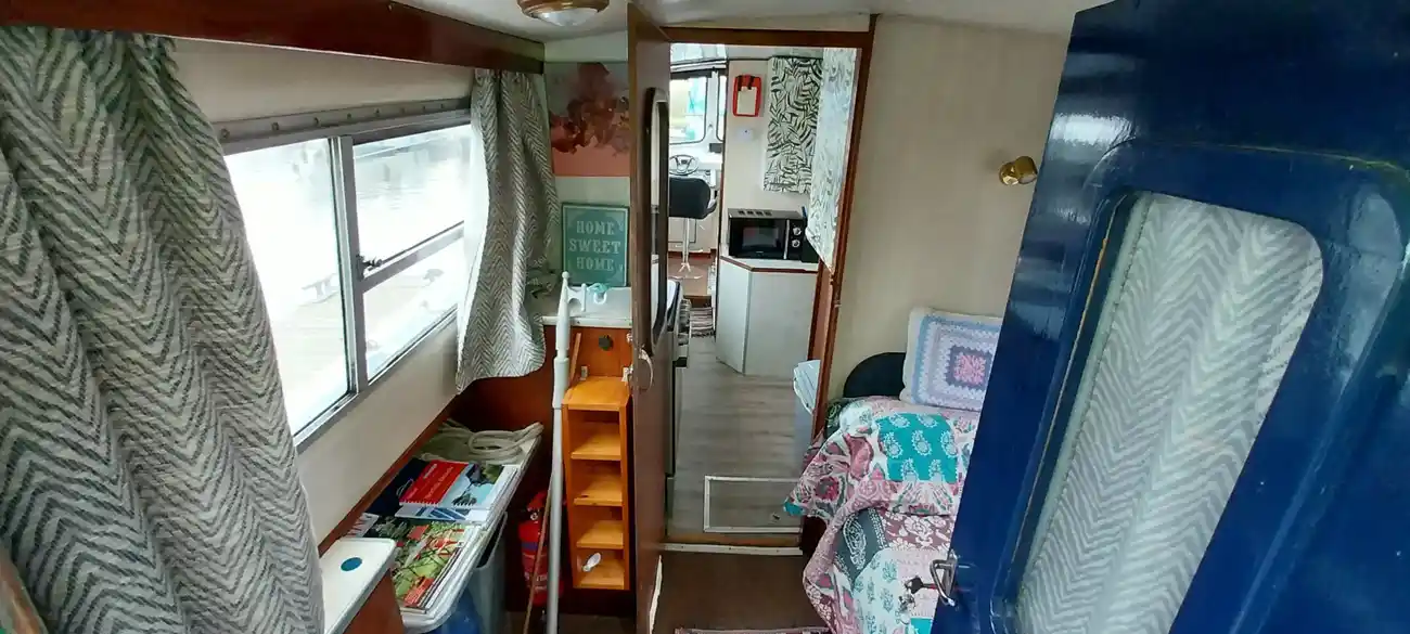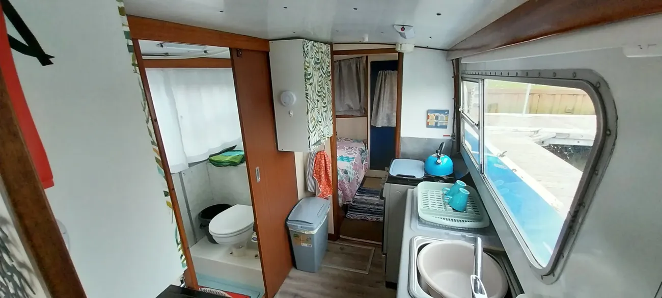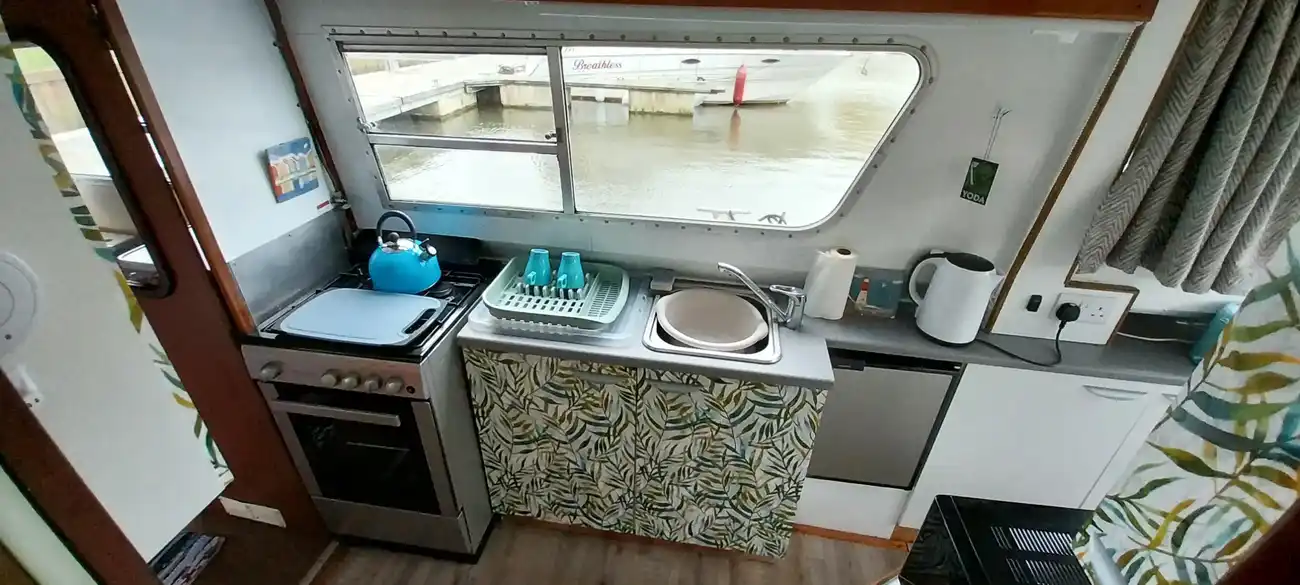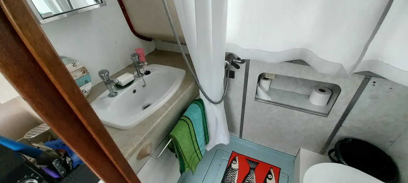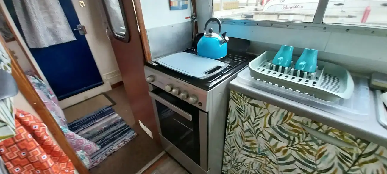 The galley is midships to port, and offers sufficient storage and work top space. Fitted with a stainless steel sink with mixer tap giving hot and cold water. A 4 burner gas hob, oven and grill and a 12v refrigerator. new microwave, toaster also both an electric and stovetop kettle. The head is to starboard and fitted with a manual pump toilet (to holding tank) shower and sink with hot and cold taps.