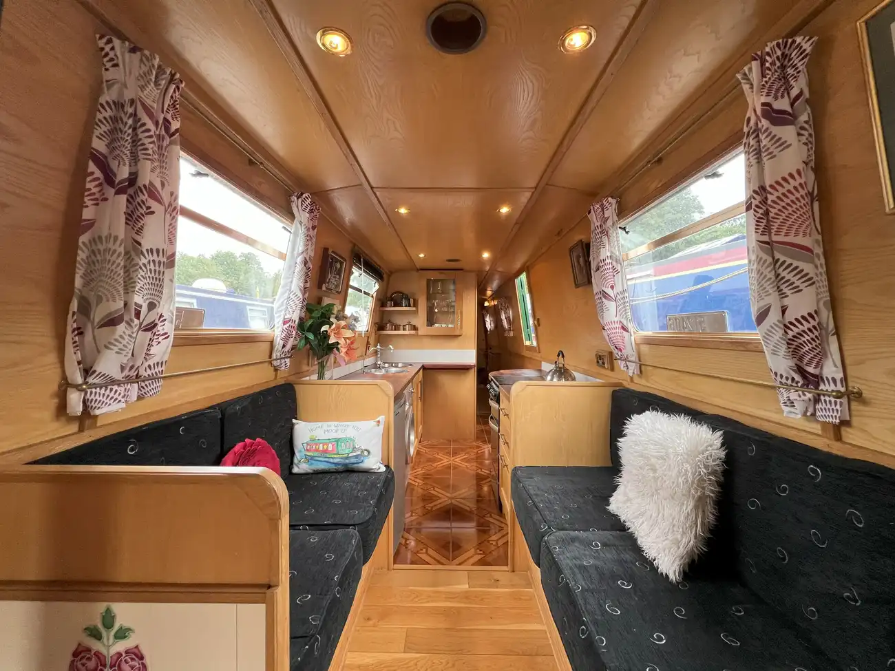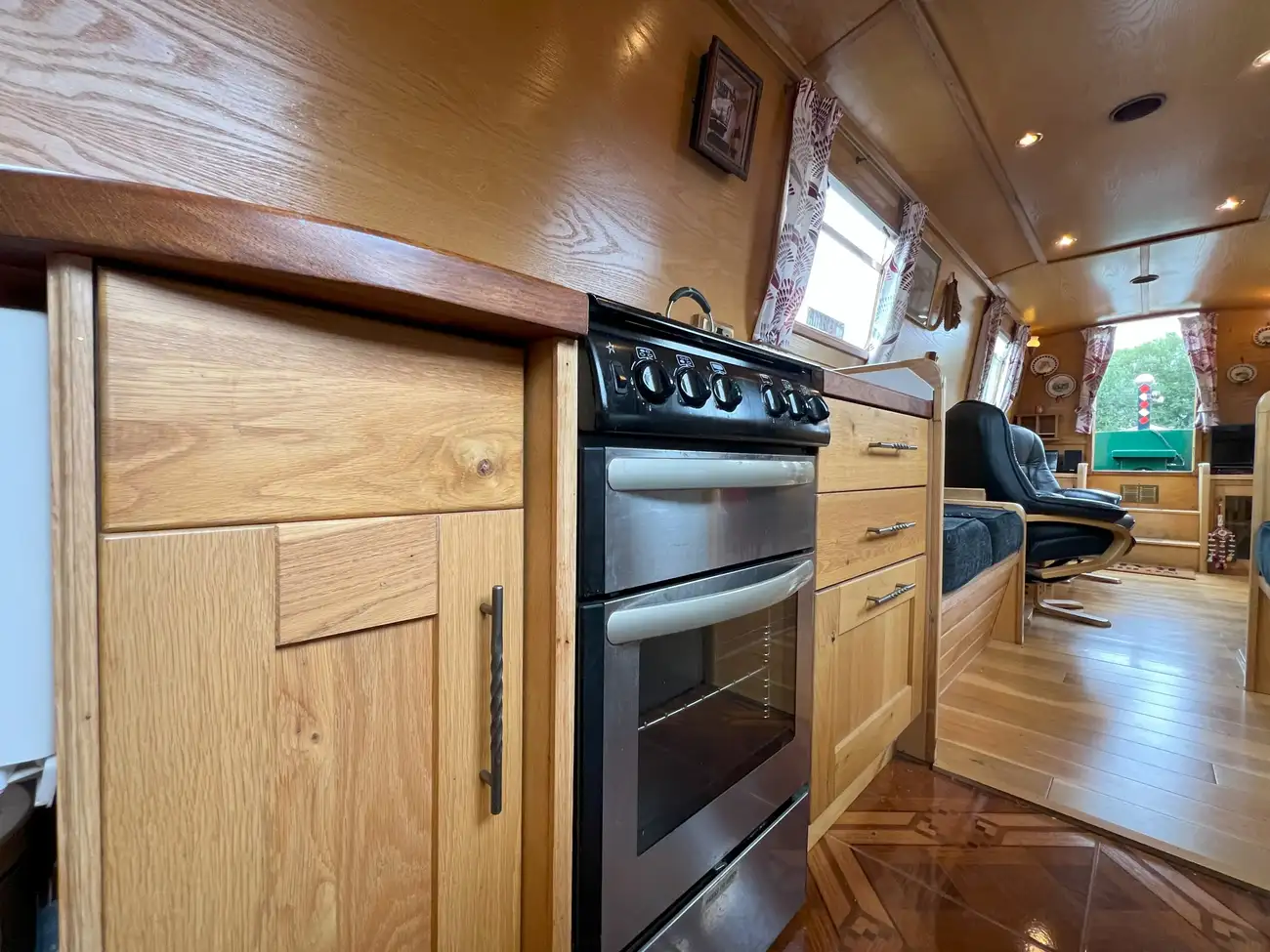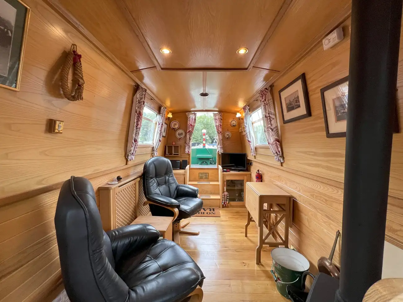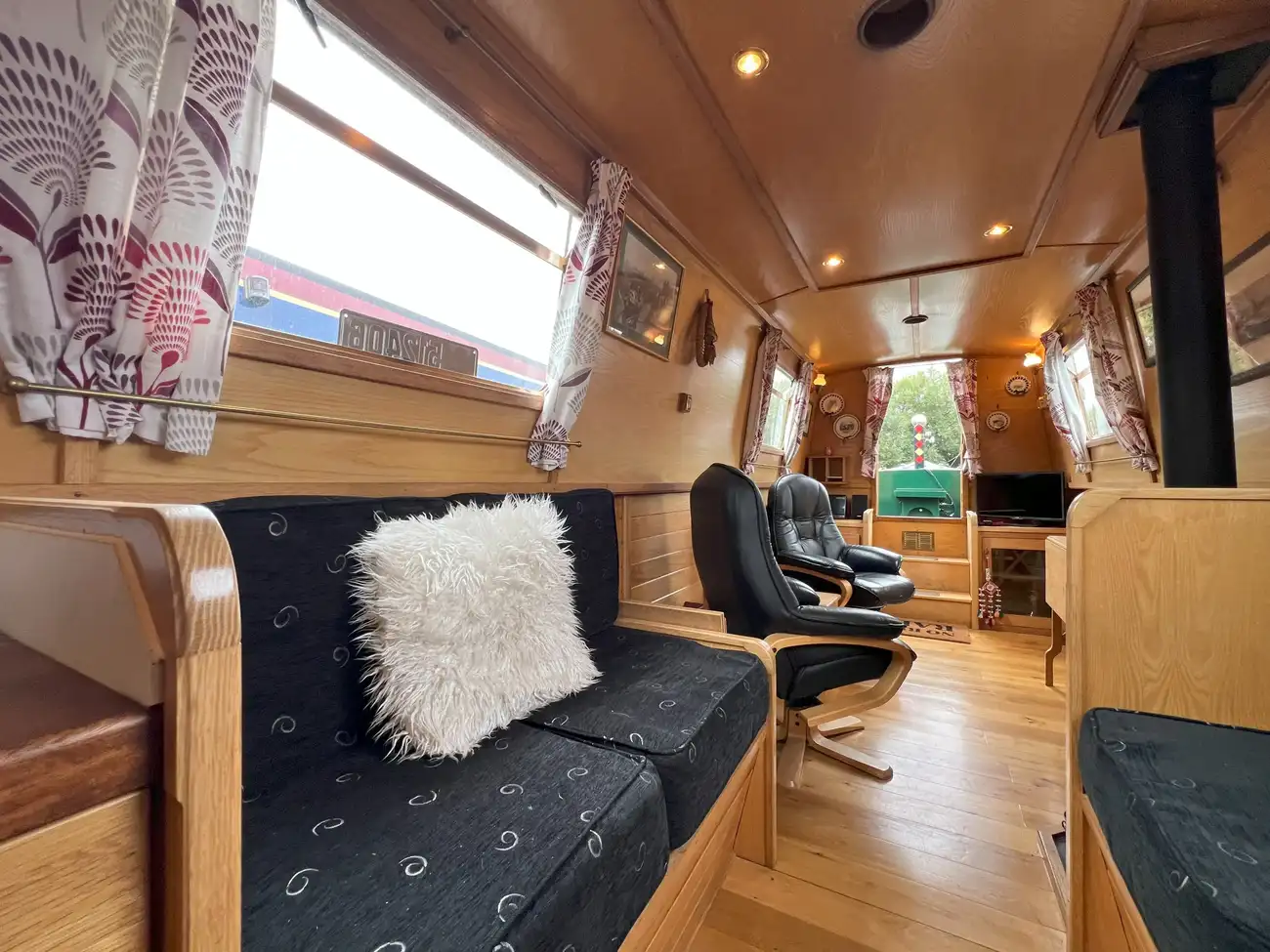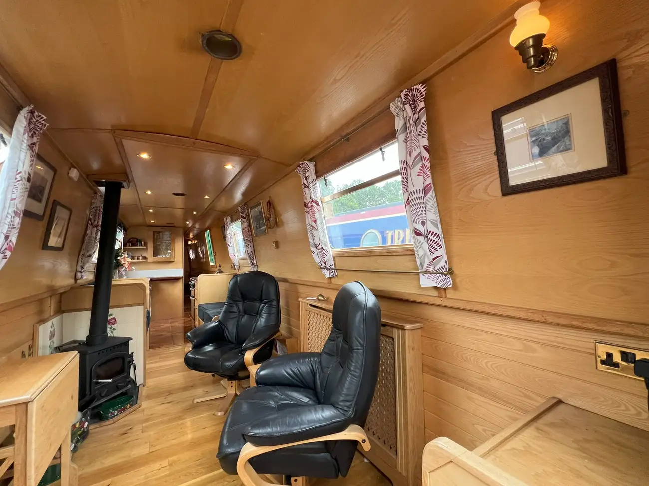 The open-plan saloon features two freestanding armchairs opposite a multifuel stove. If preferred, the armchairs could be replaced with a sofa bed to provide an additional two berths. Fixed port and starboard bench seating also converts into a cross-width double berth when required, with useful storage space beneath.