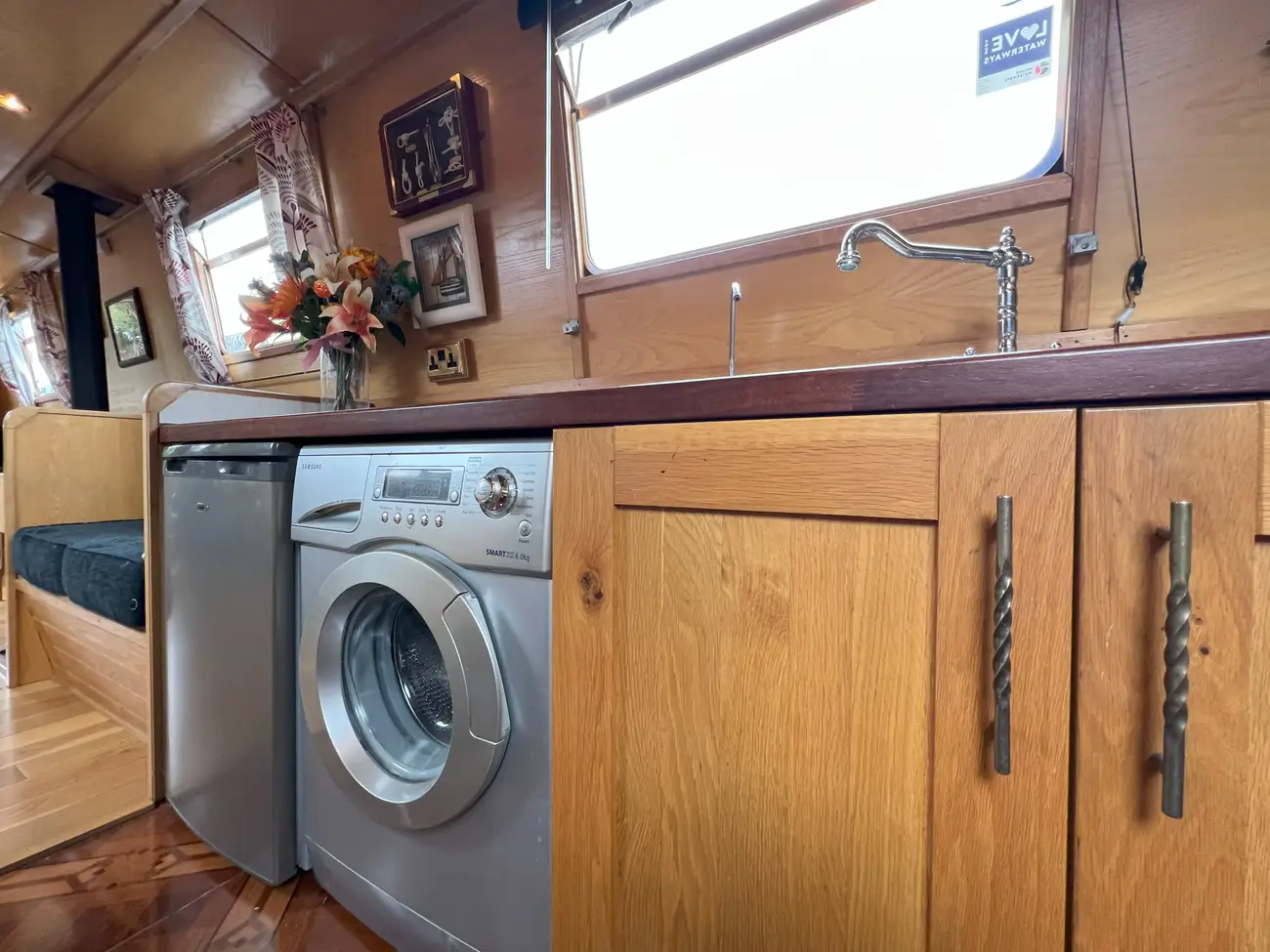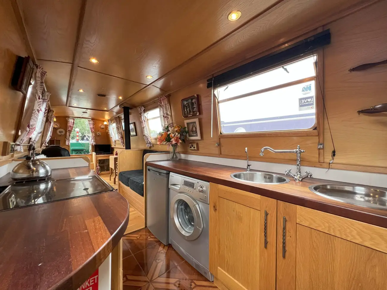 The walk-through galley kitchen is fitted to a high standard, finished with Iroko wood work surfaces and bespoke cabinetry. Appliances include a 4-burner gas hob, oven and grill, a 240V 6kg Samsung washing machine, and a 240V Logik fridge. A stainless-steel sink with drainer and a port-side hatch ensure plenty of natural light and ventilation, creating a bright and practical working space.