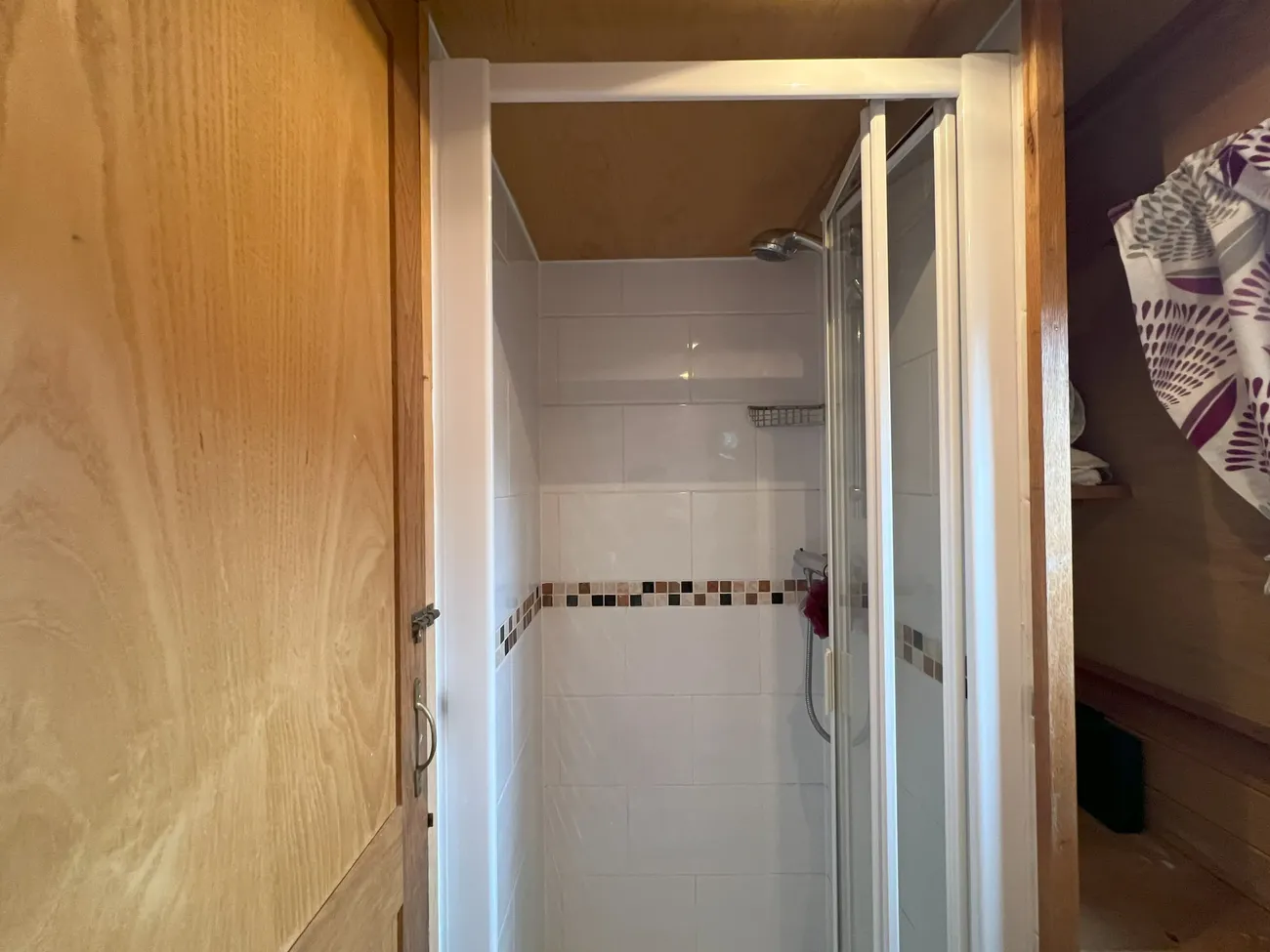 The bathroom makes excellent use of space, offering a good-sized shower enclosure, a pump-out toilet, and a vanity unit with a ceramic hand basin.