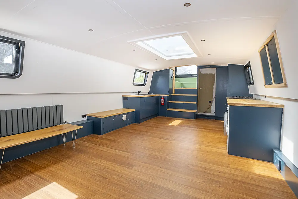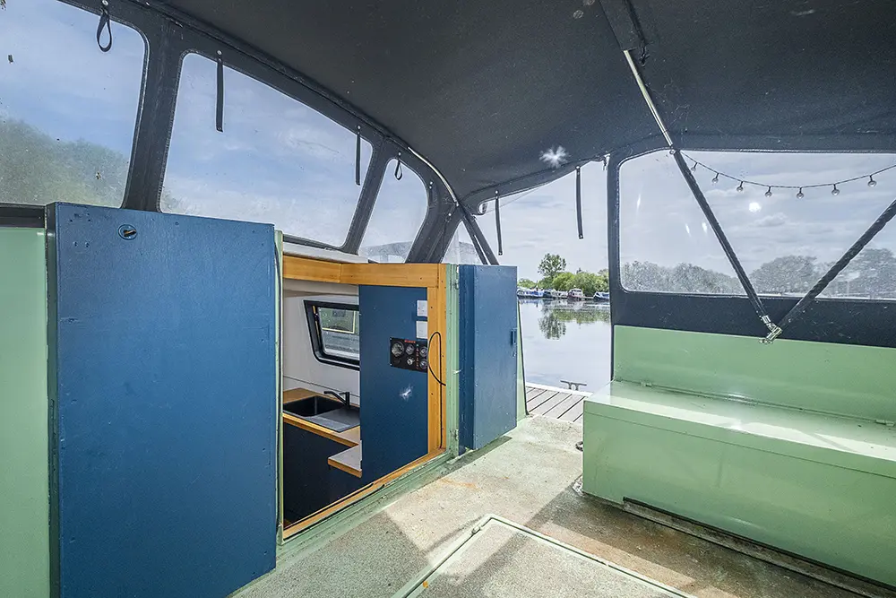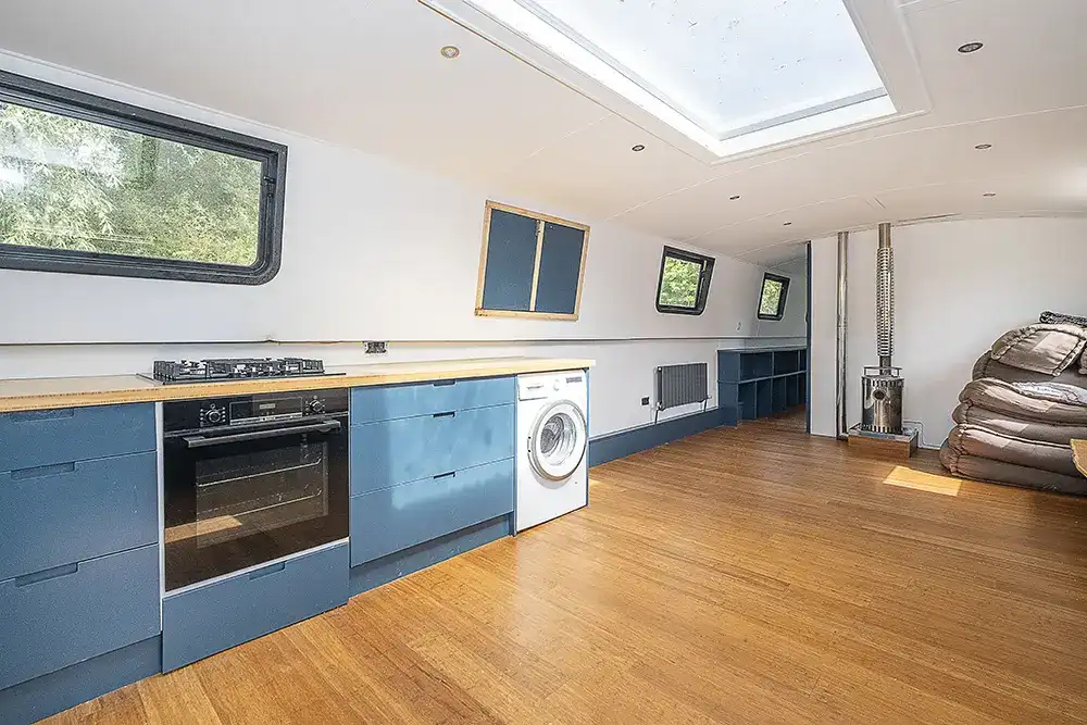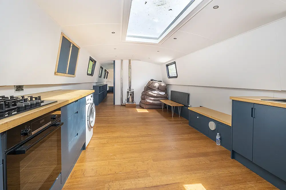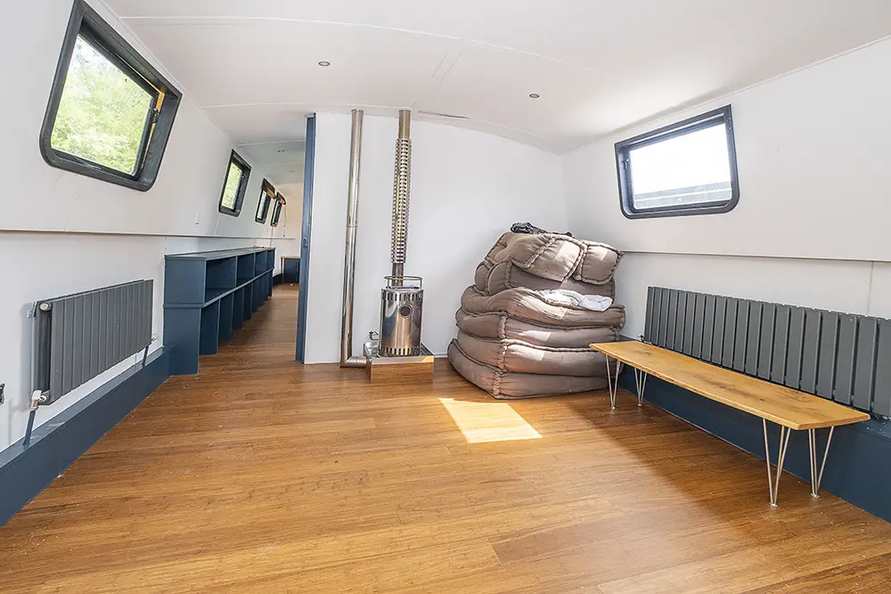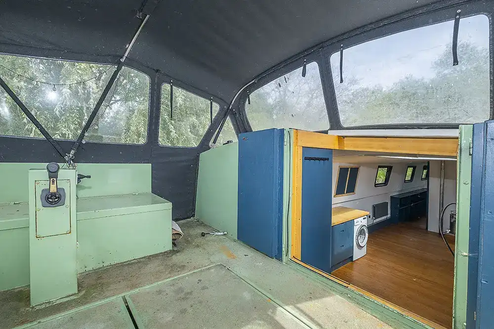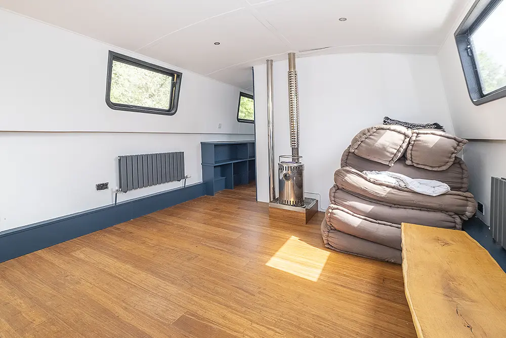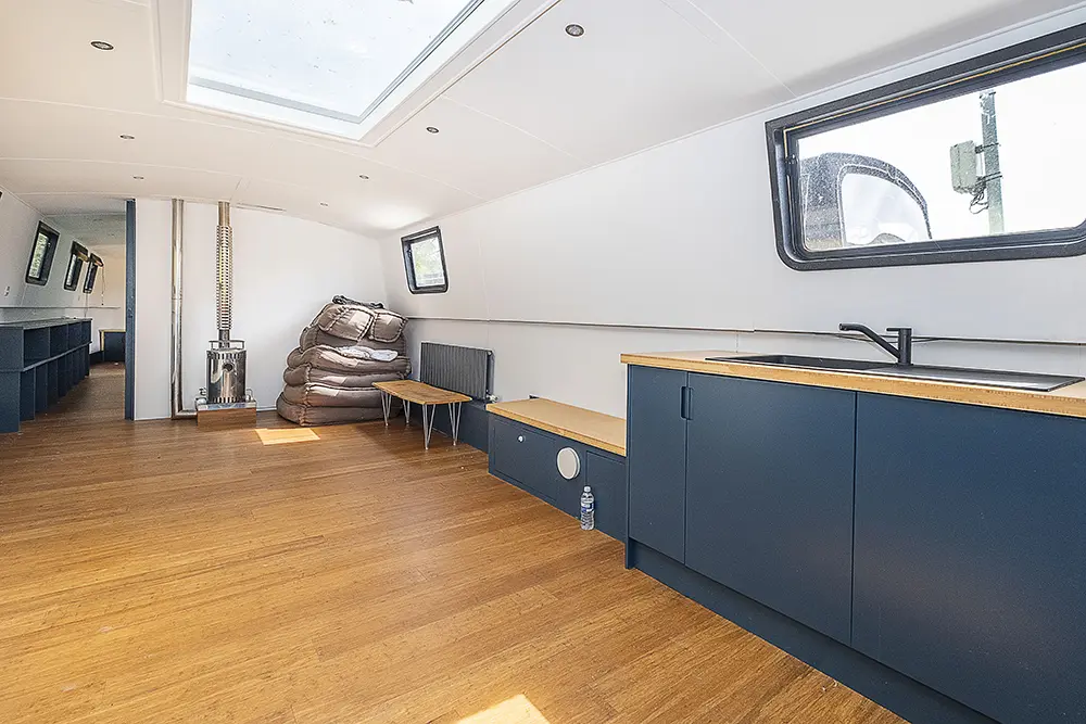 Pea Pod is a 1 owner Widebeam with the shell manufactured in 2020 by JSR Boats of Warwickshire, fitted out privately by the present owners and commissioned afloat at the beginning of 2022. The interior is of reverse layout design with a walk through open plan galley aft leading to the saloon featuring a diesel stove. Forward is a large toilet / shower compartment featuring a Thetford Chemical head and a large shower. Forward a gain with the corridor to port is access to the mast cabin which features a Island double bed against the forward bulkhead and a extremely spacious closet with ample wardrobes for storage. To the exterior the rear deck is covered by a full canopy, the Square stern offers a seating area within and tiller helm with control binnacle  to port. Power is by a Beta Marine B75 diesel and a bow thruster
