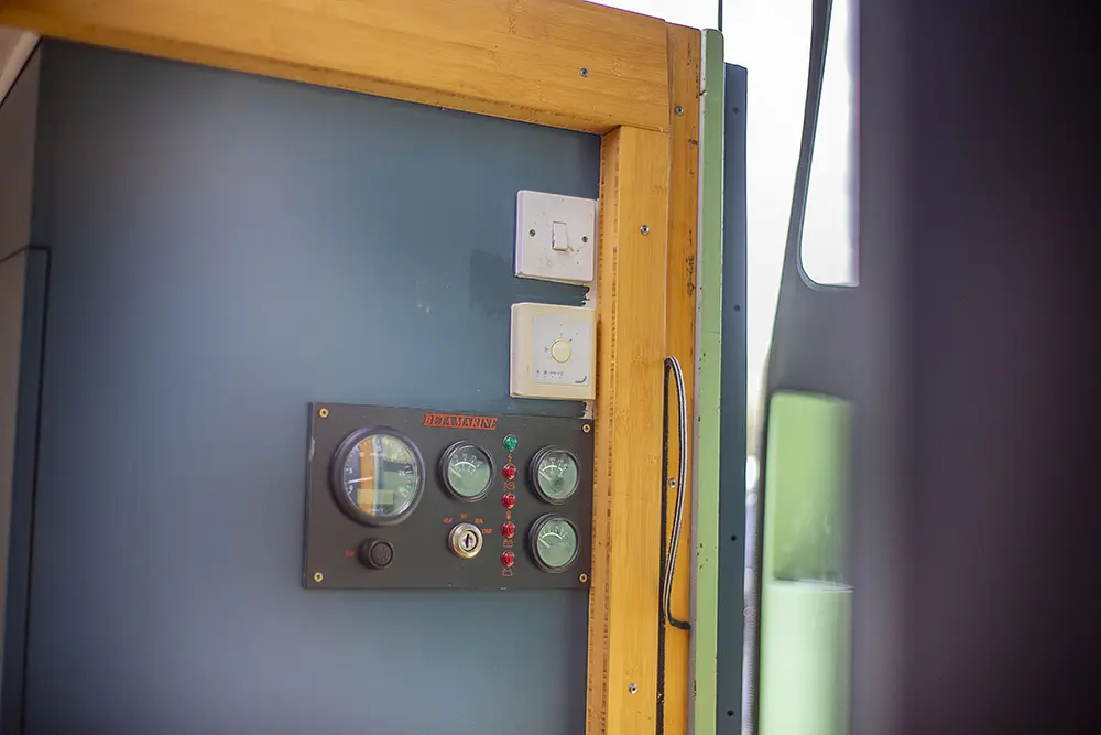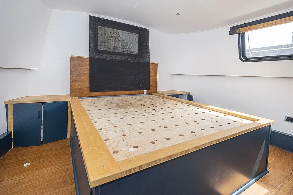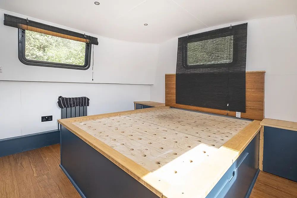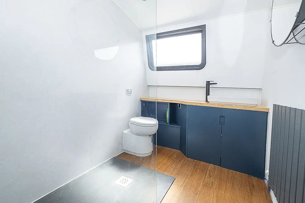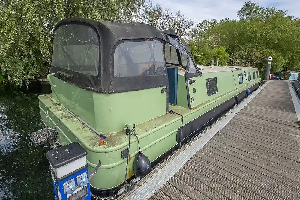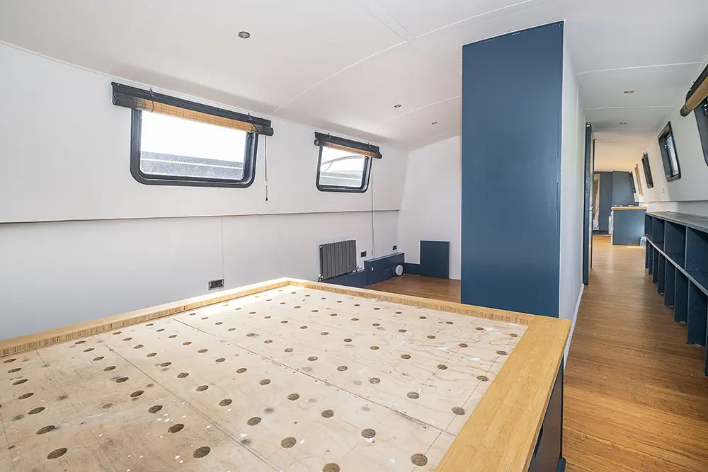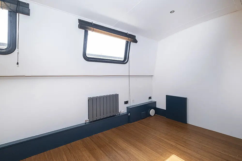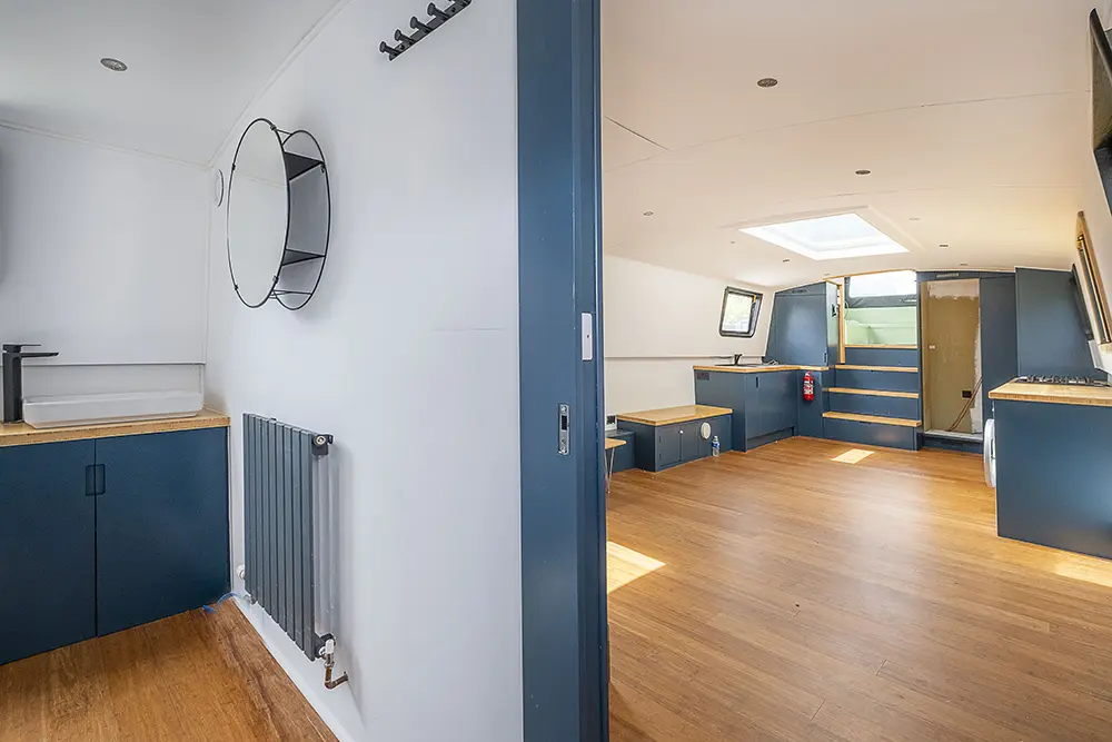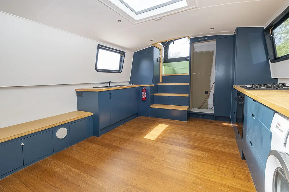Pea Pod is a 1 owner Widebeam with the shell manufactured in 2020 by JSR Boats of Warwickshire, fitted out privately by the present owners and commissioned afloat at the beginning of 2022. The interior is of reverse layout design with a walk through open plan galley aft leading to the saloon featuring a diesel stove. Forward is a large toilet / shower compartment featuring a Thetford Chemical head and a large shower. Forward a gain with the corridor to port is access to the mast cabin which features a Island double bed against the forward bulkhead and a extremely spacious closet with ample wardrobes for storage. To the exterior the rear deck is covered by a full canopy, the Square stern offers a seating area within and tiller helm with control binnacle  to port. Power is by a Beta Marine B75 diesel and a bow thruster