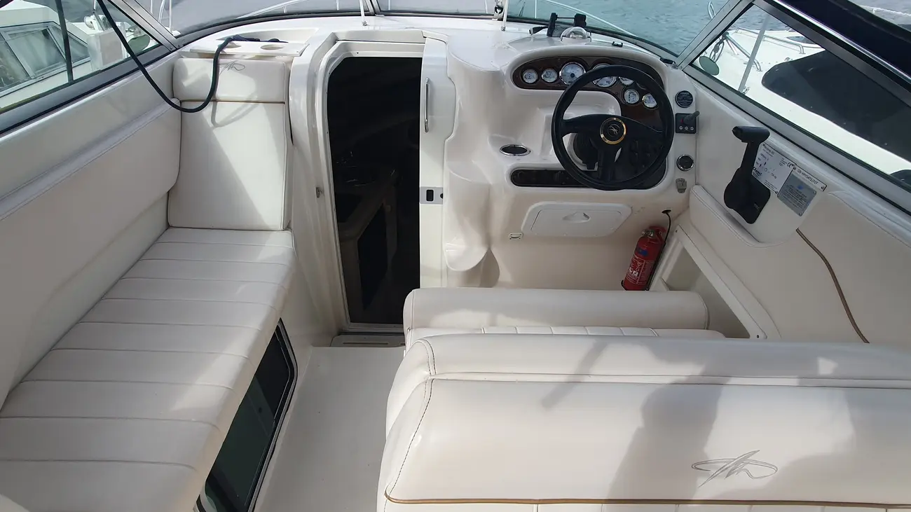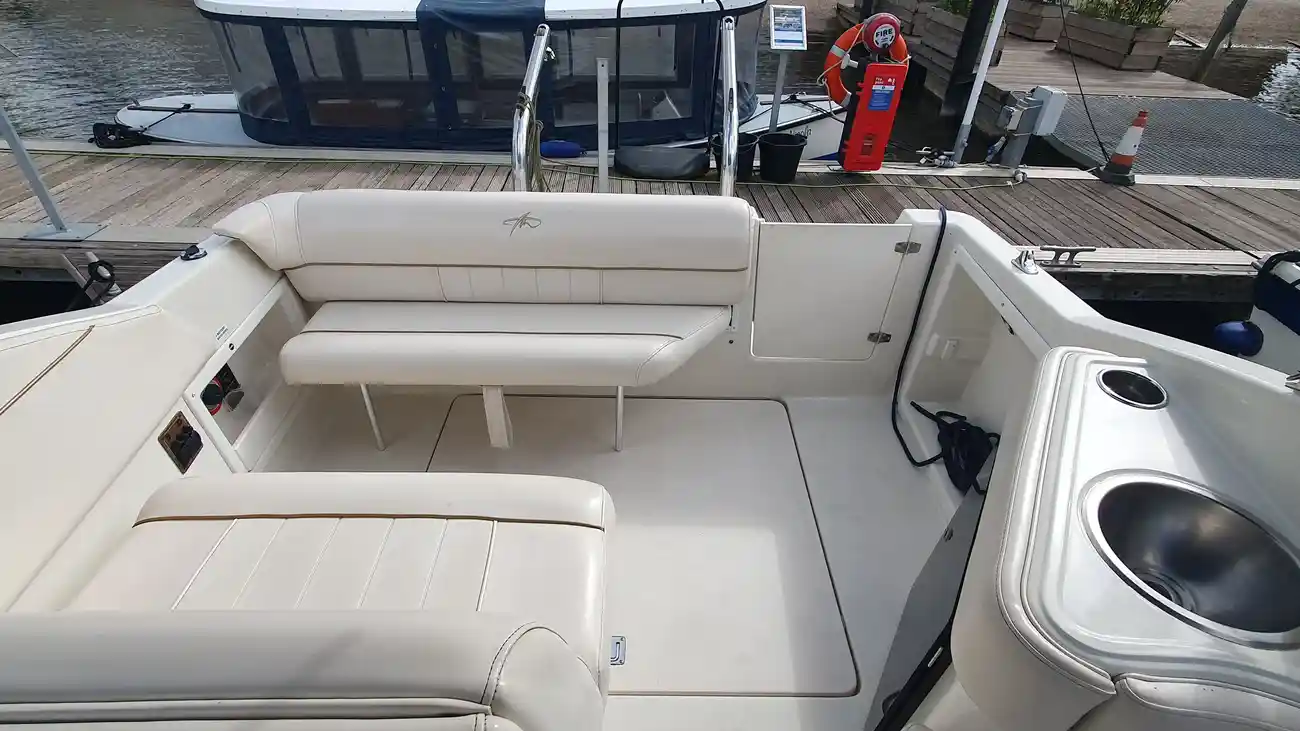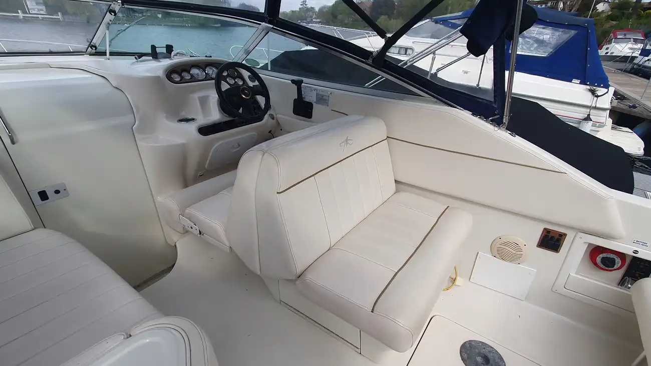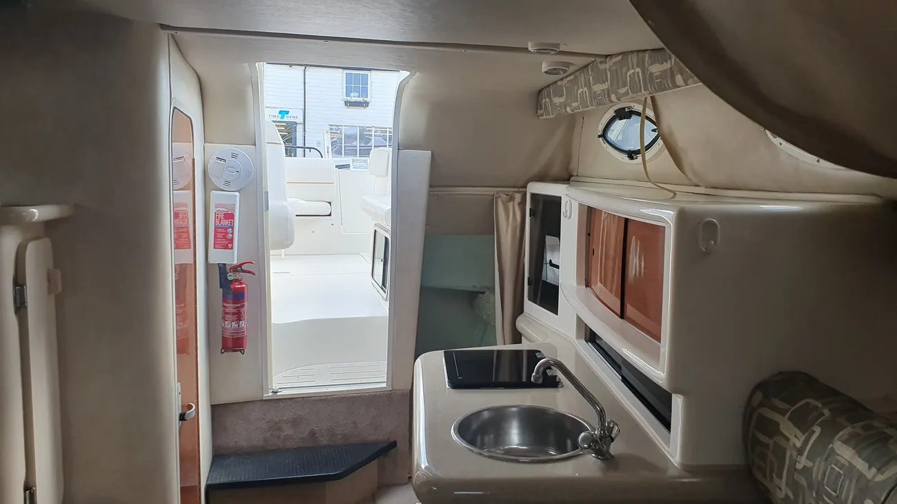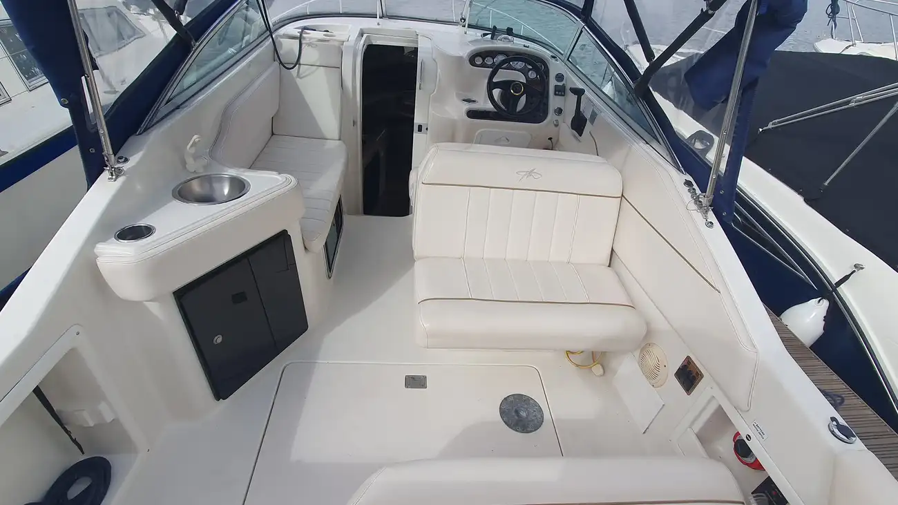 Monterey 262 Sports Cruiser - 'Kings Folly'  Just arrived is this very well prepared and highly desirable sports cruiser from the respected Monterey stable.  Kings Folly is fully equipped for extended trips away and having had a full engine service, engine bay degrease and clean, outdrive rebuild, hull acid wash and anti-foul is now ready to just turn the key and go! The engine is a Mercruiser 5.7L EFI (260Hp) matched with a Bravo III duo prop leg so with the additional benefit of a bow thruster this boat is easily maneuverable. With room for 8 adults Kings Folly can comfortably seat everyone and still have room to move around with it's generous seating plan with a double helm seat, and single navigator seat where the back rest can fold forward creating a sun lounger facing aft and finally a wet bar with fridge below. With the table set in the cockpit there is room for 5 to dine. In the cabin are four berths, a double midships and another double with the table lowered in the U shaped seating in the bow.  The galley has a hob and an electric cooker, hot and cold pumped water to the stainless sink and also a fridge.