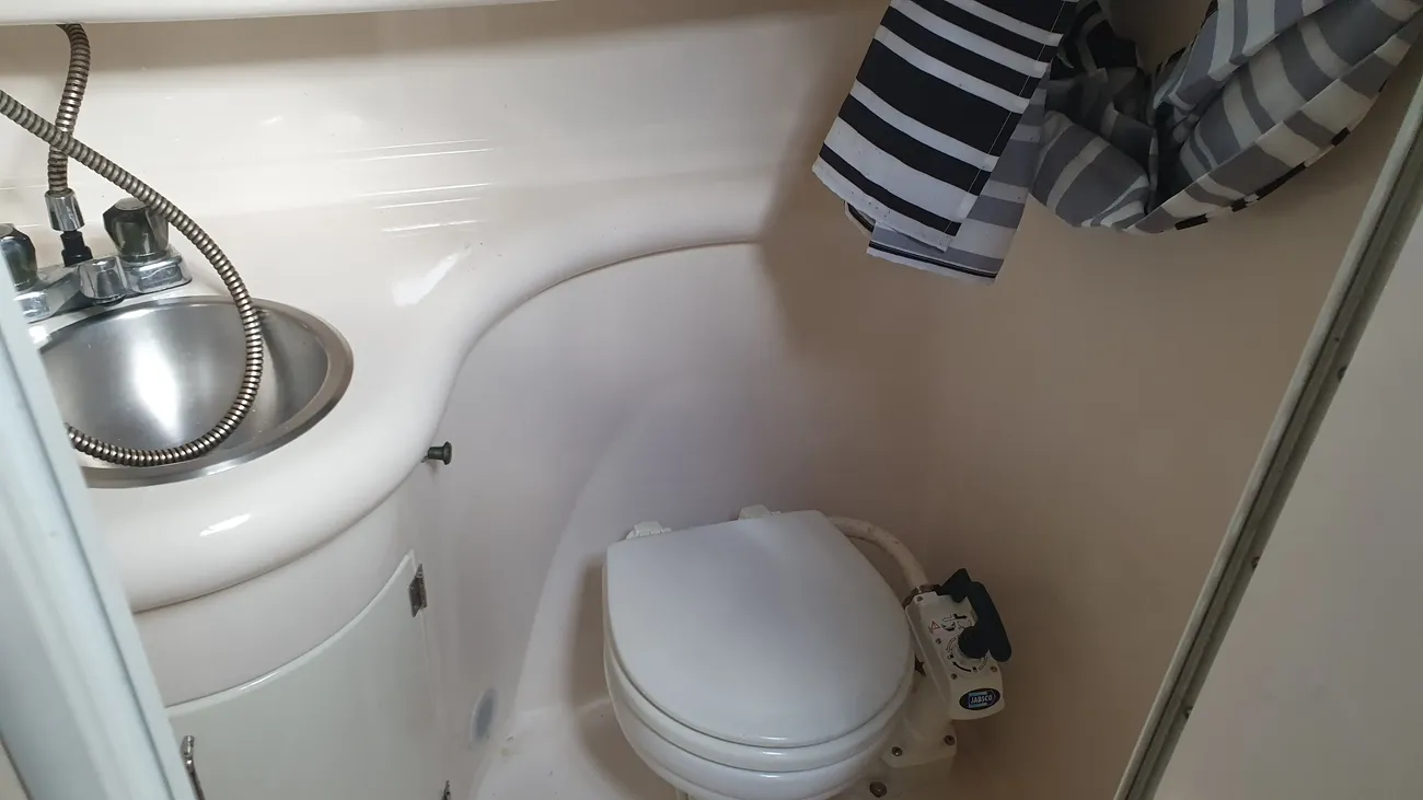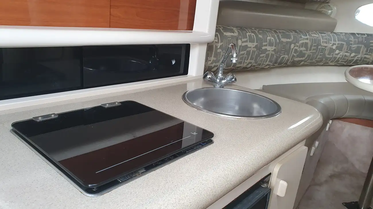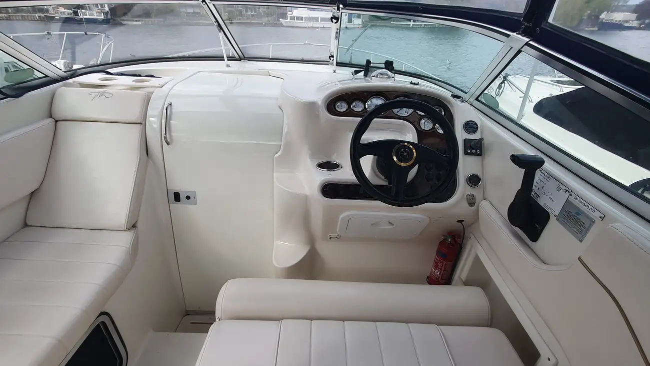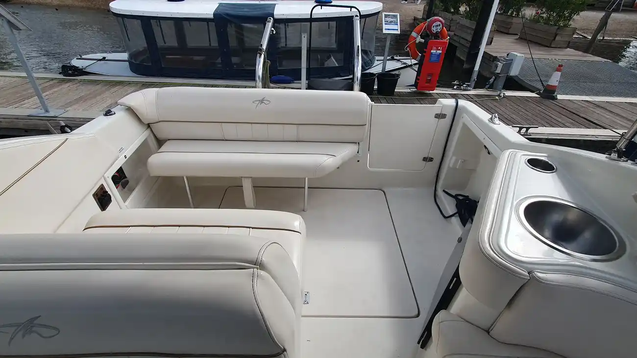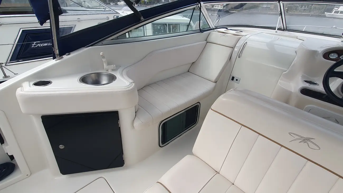Monterey 262 Sports Cruiser - 'Kings Folly'  Just arrived is this very well prepared and highly desirable sports cruiser from the respected Monterey stable.  Kings Folly is fully equipped for extended trips away and having had a full engine service, engine bay degrease and clean, outdrive rebuild, hull acid wash and anti-foul is now ready to just turn the key and go! The engine is a Mercruiser 5.7L EFI (260Hp) matched with a Bravo III duo prop leg so with the additional benefit of a bow thruster this boat is easily maneuverable. With room for 8 adults Kings Folly can comfortably seat everyone and still have room to move around with it's generous seating plan with a double helm seat, and single navigator seat where the back rest can fold forward creating a sun lounger facing aft and finally a wet bar with fridge below. With the table set in the cockpit there is room for 5 to dine. In the cabin are four berths, a double midships and another double with the table lowered in the U shaped seating in the bow.  The galley has a hob and an electric cooker, hot and cold pumped water to the stainless sink and also a fridge.