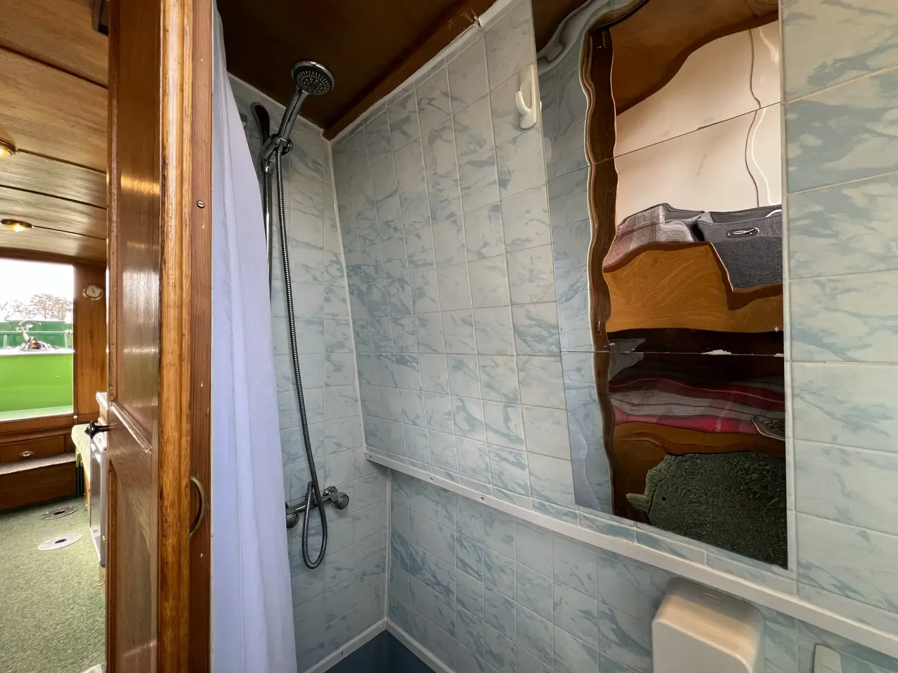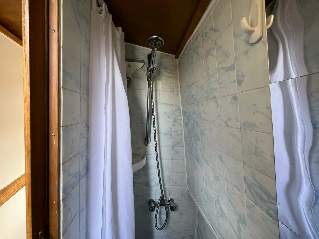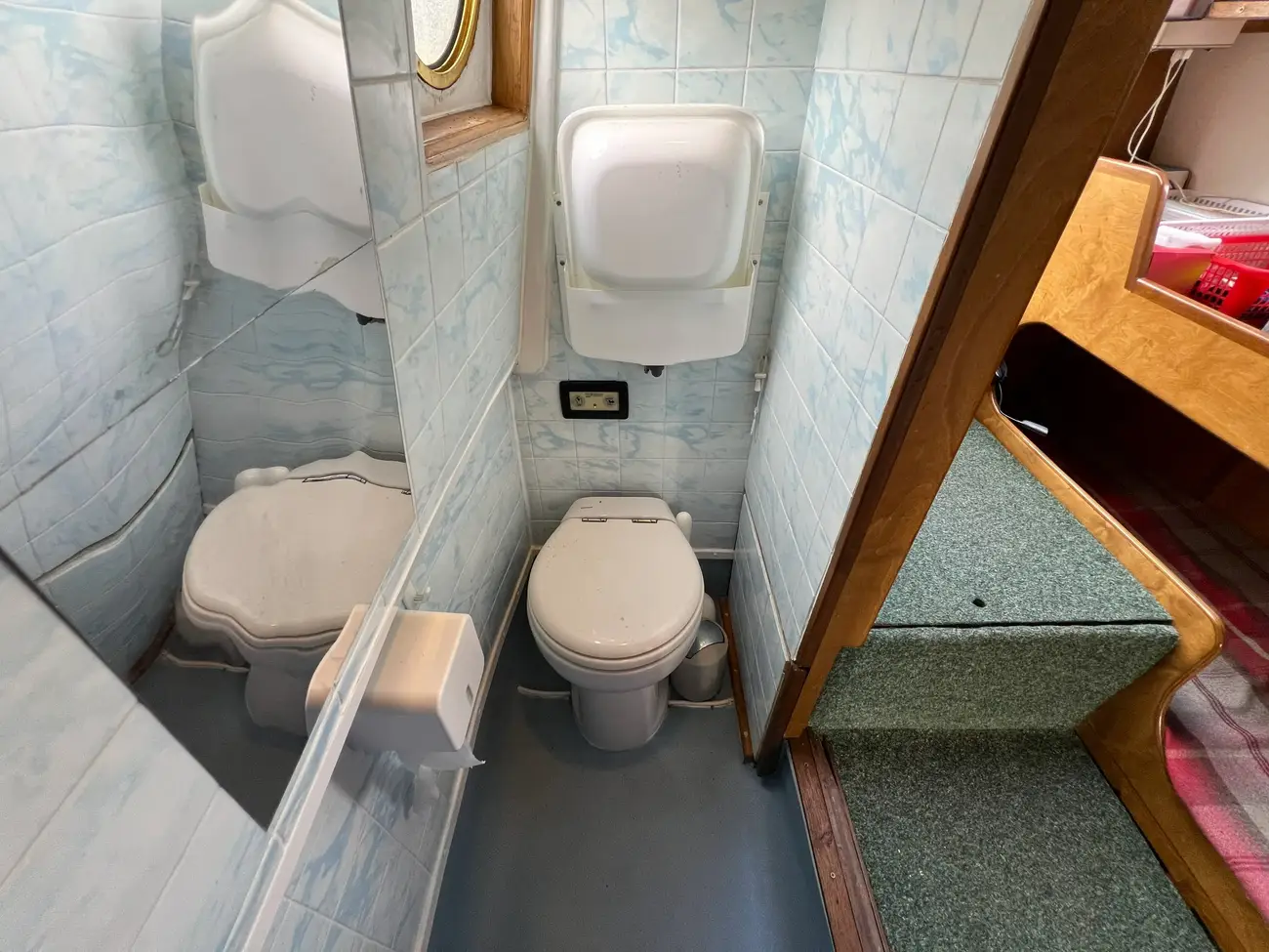 Opposite the bunks is a wet room-style bathroom fitted with a pump-out toilet, shower, and a convenient fold-away hand basin, making efficient use of the available space.