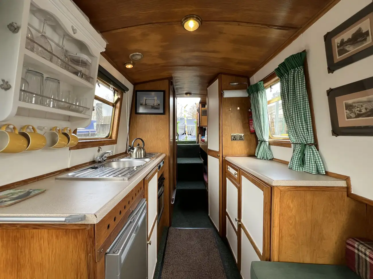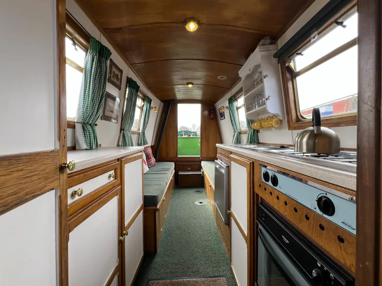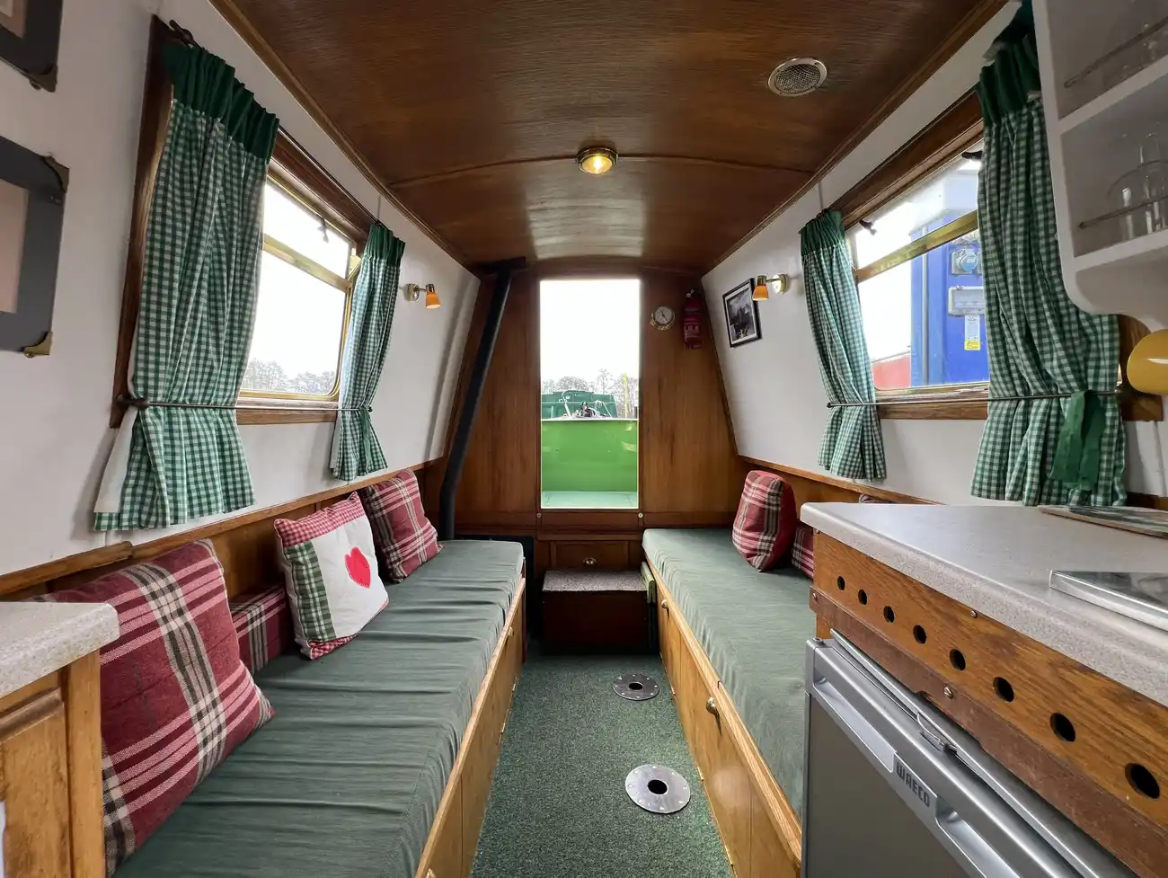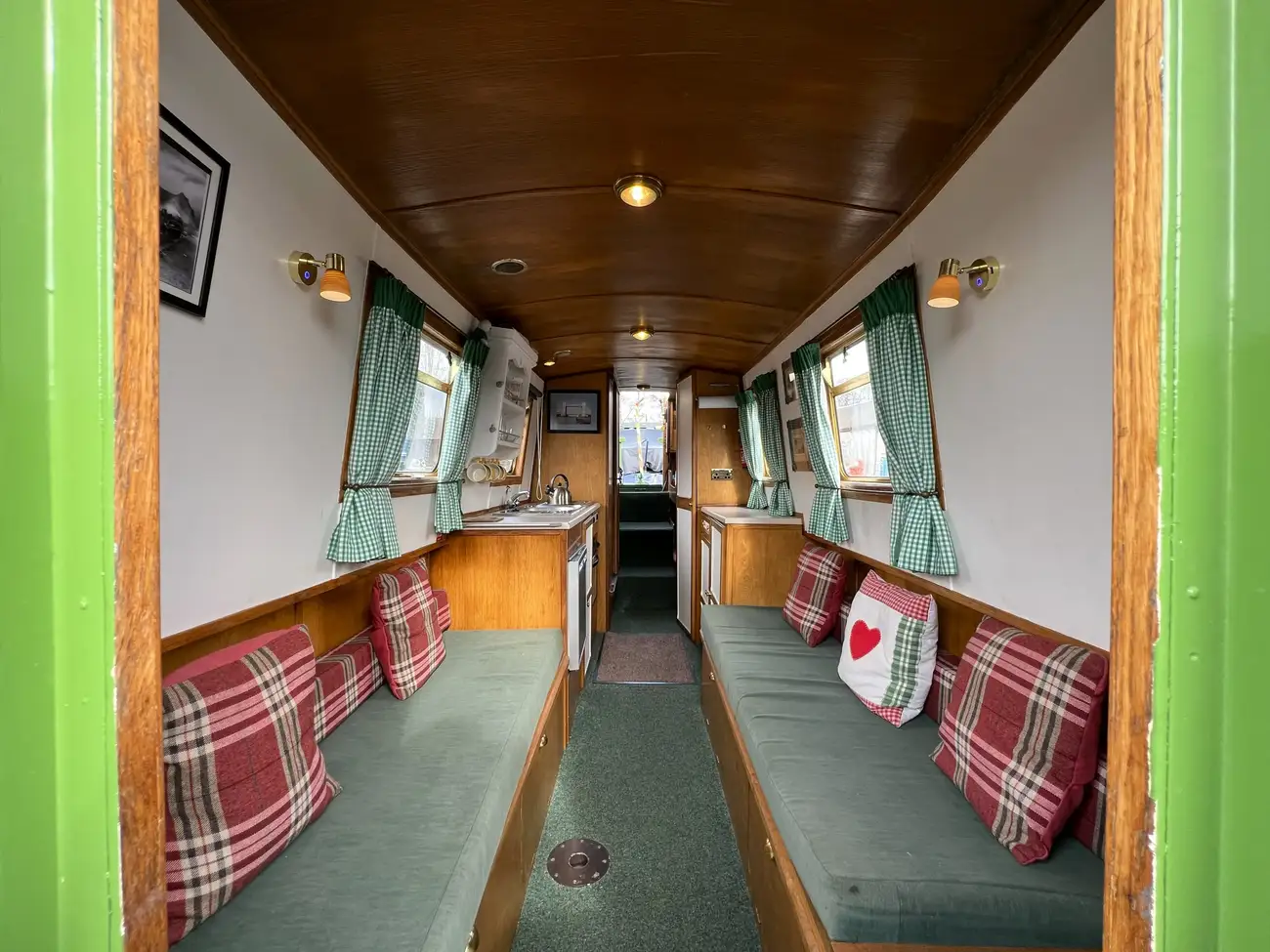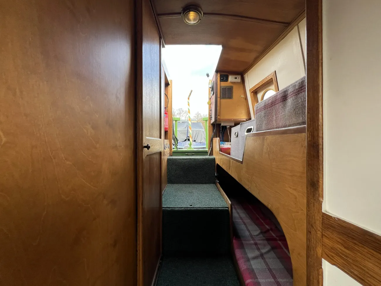 Entering the boat via the central stern doors leads into a light and thoughtfully arranged cabin space, designed to maximise comfort within a compact footprint.