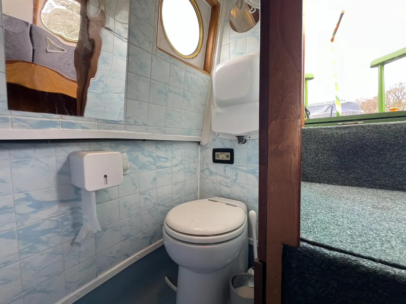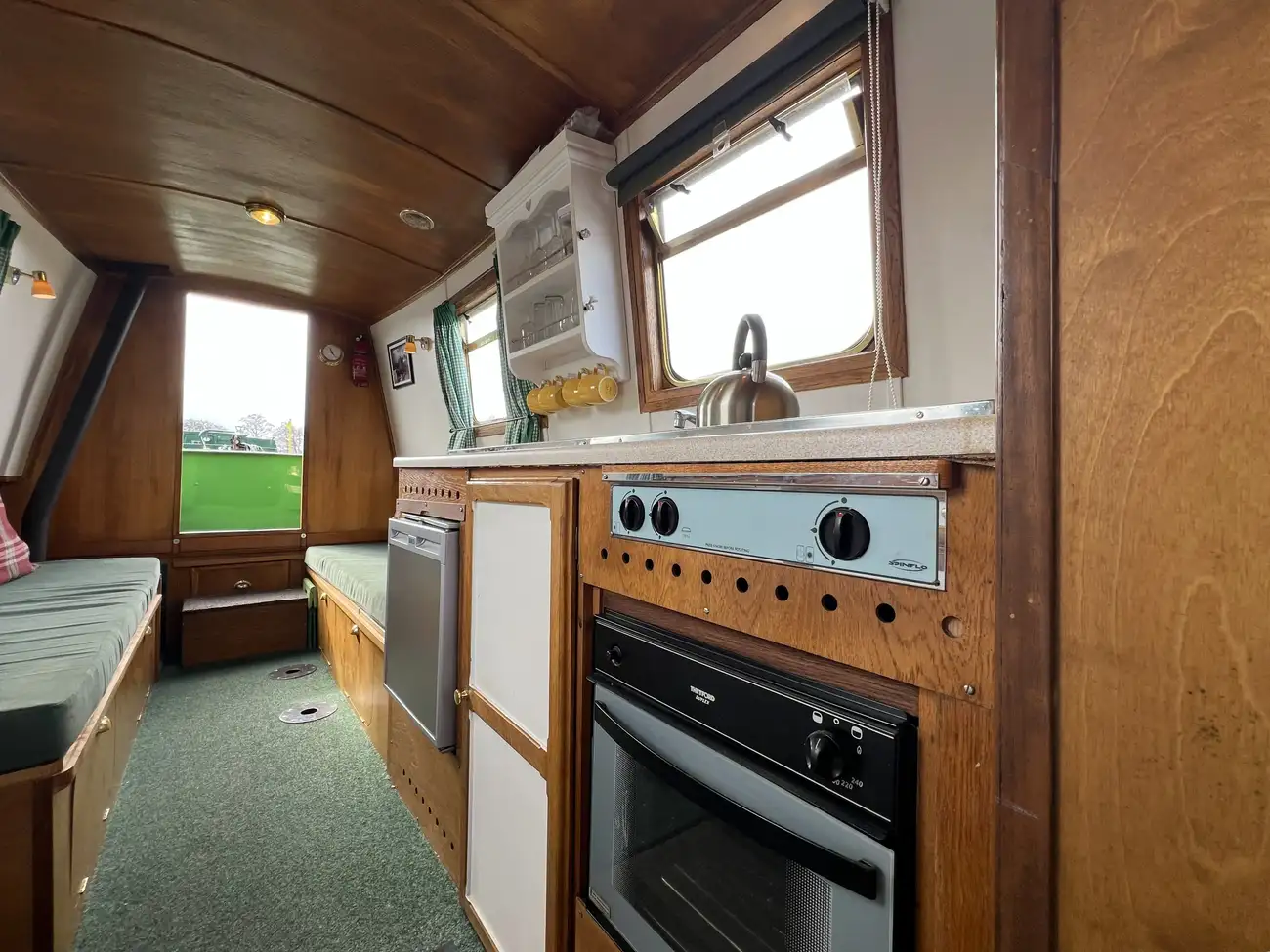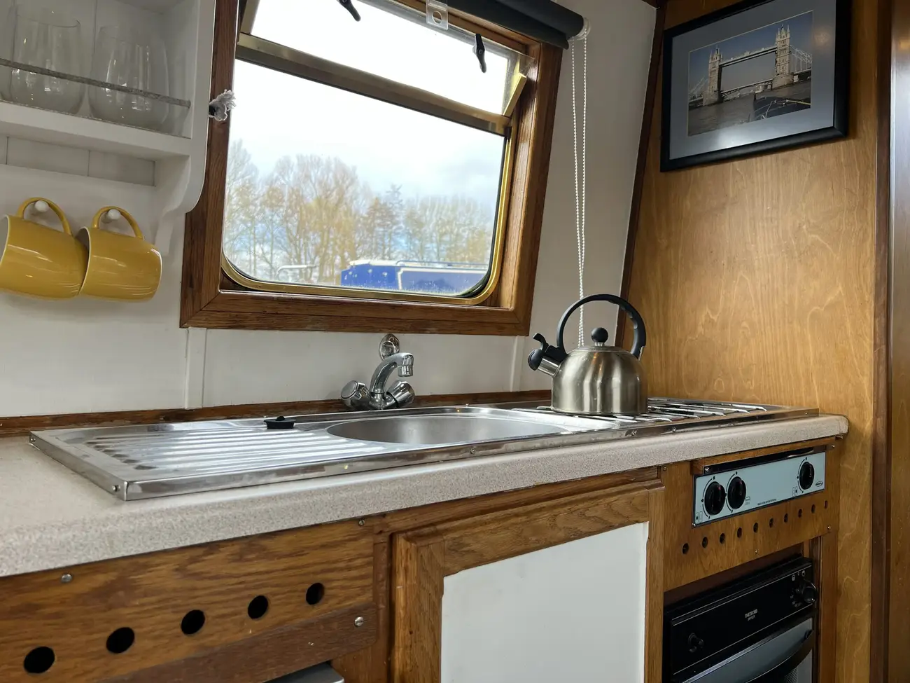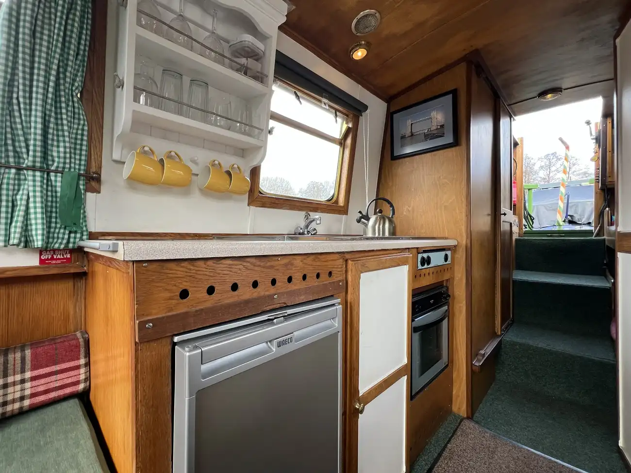 Positioned midships, the walkthrough galley is equipped with a surface-mounted stainless-steel two-burner gas hob and a built-in Thetford gas oven and grill. Additional features include a kitchen sink with draining board and a 12V Waeco fridge with ice box. Useful drawers and storage cupboards provide practical space for cooking equipment and provisions, making onboard meal preparation simple and convenient.