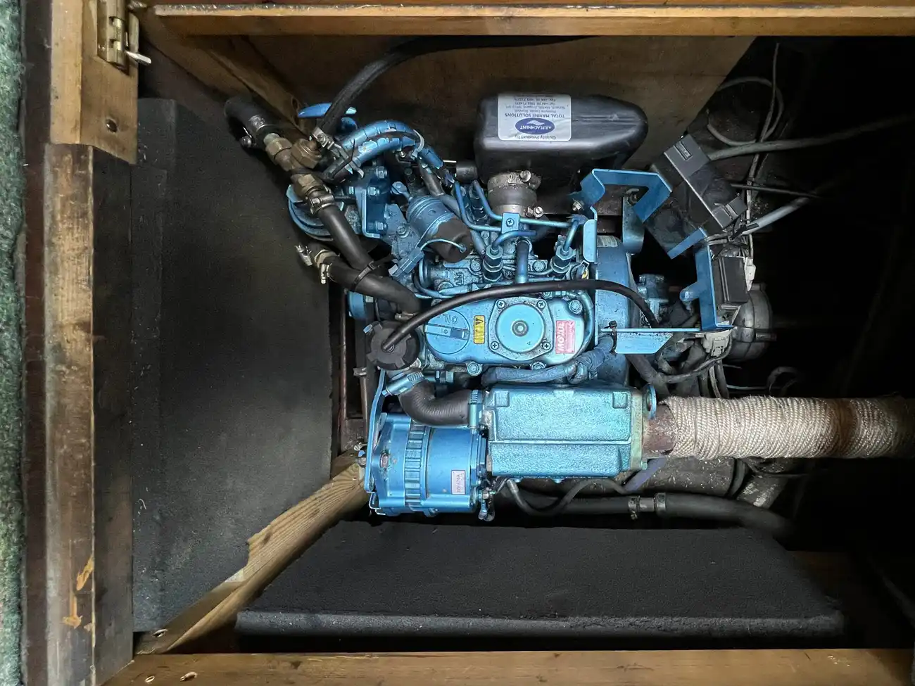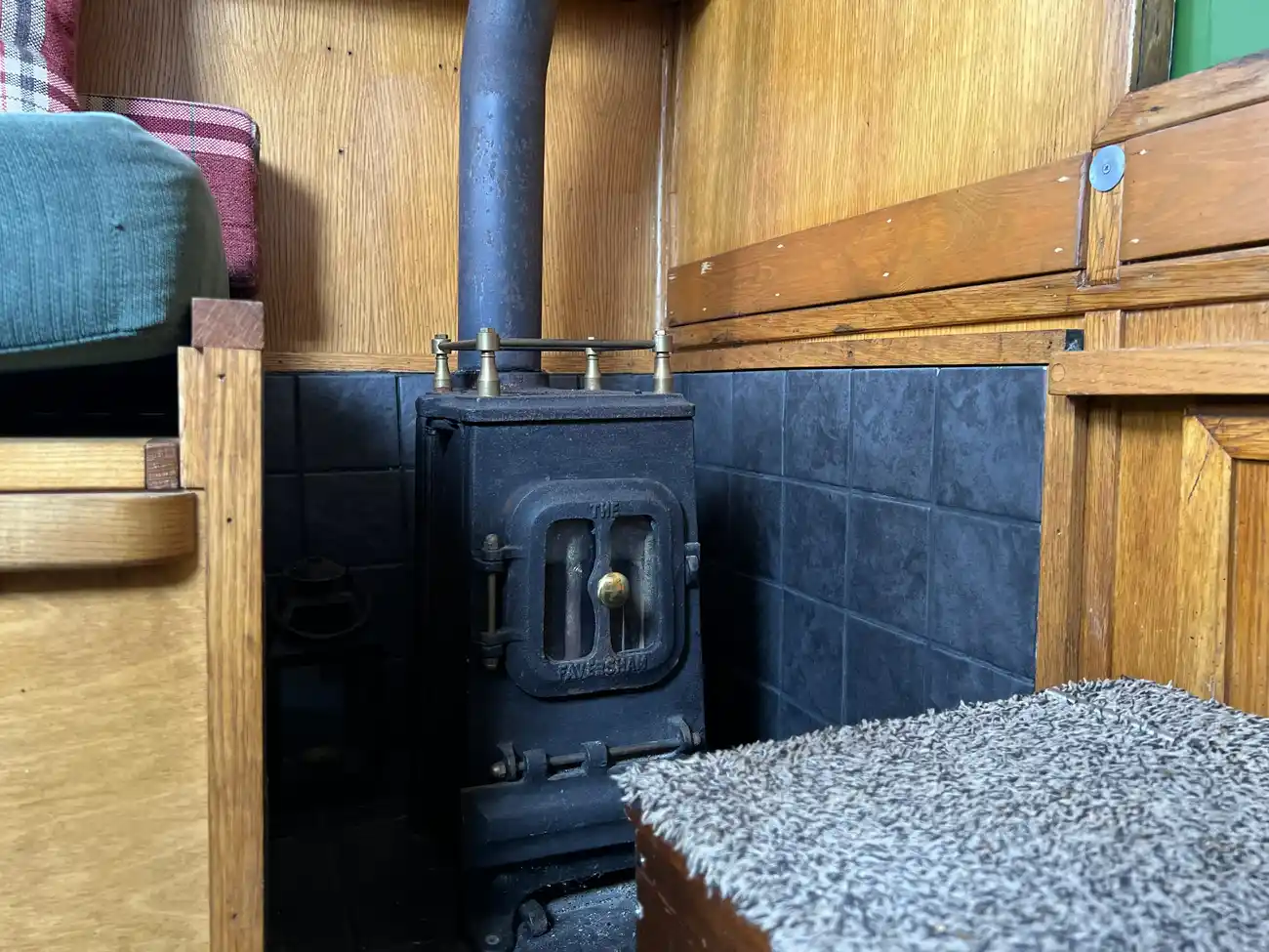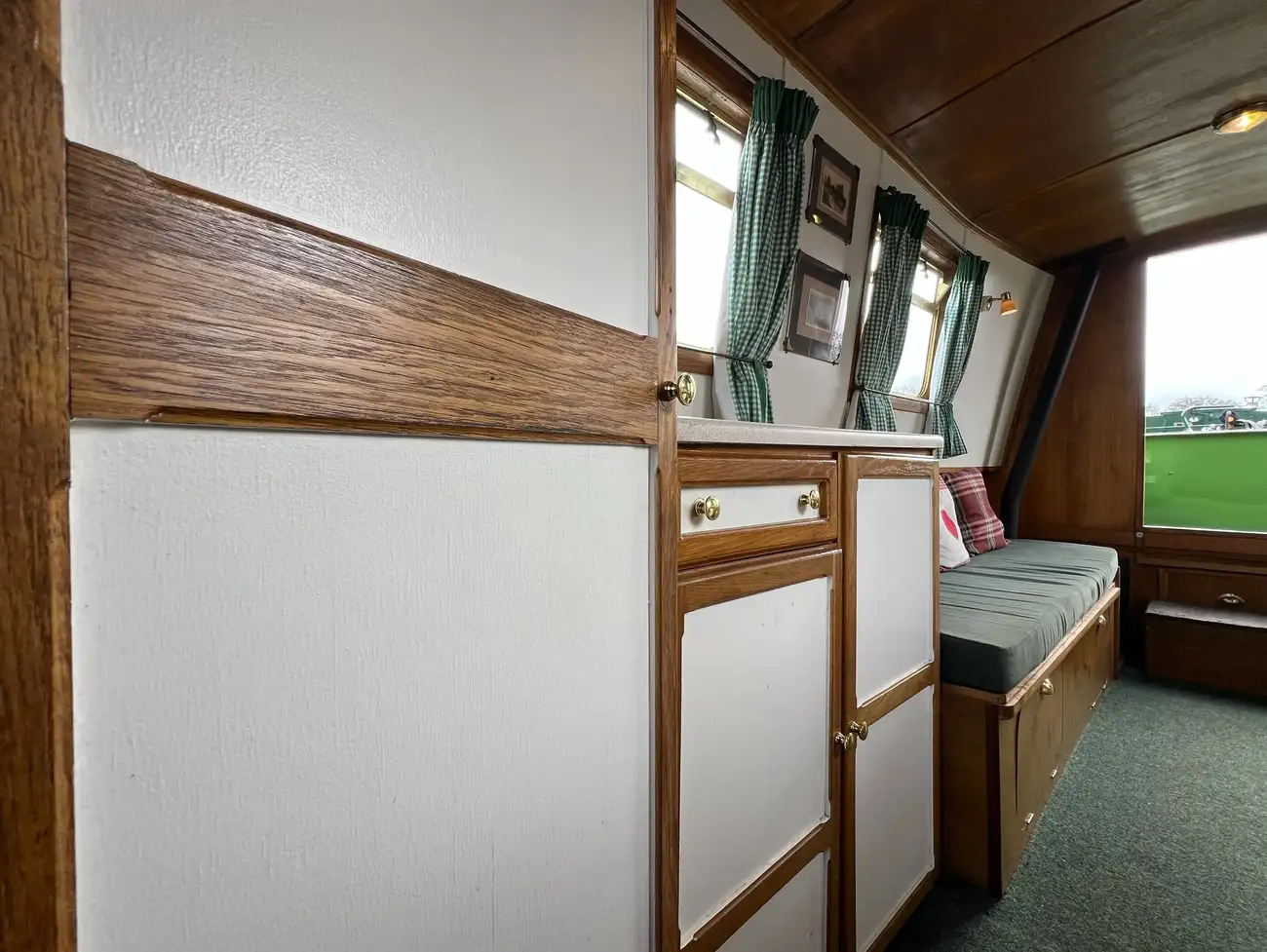 The saloon is located forward and benefits from direct access onto the bow well deck. Port and starboard bench seating with storage beneath provides a comfortable space to relax and can also be used as additional single berths when required. A multifuel stove set on a tiled hearth provides warmth and comfort within the cabin.