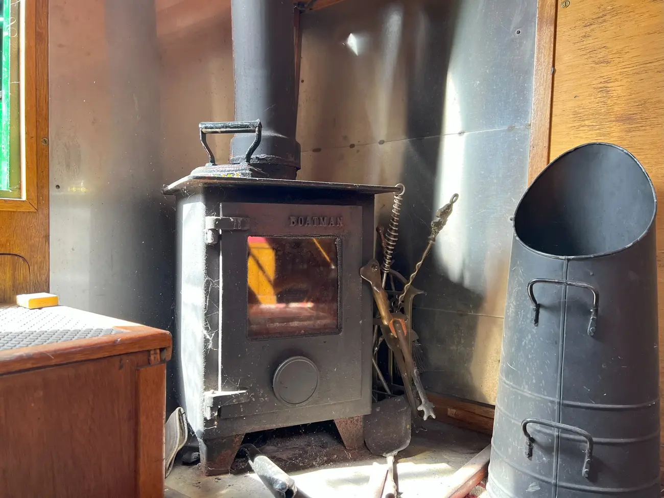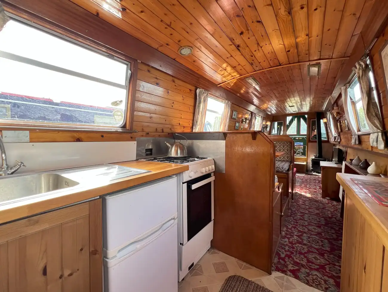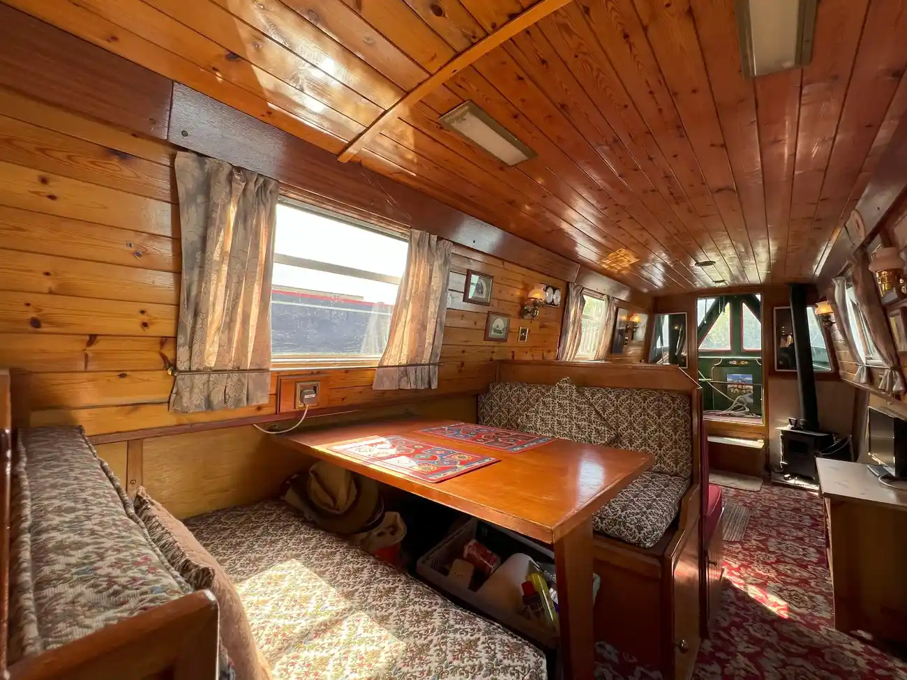 Forward of the dinette, the saloon offers direct access onto the bow well deck. An L-shaped built-in sofa provides seating for four and also converts into an additional double berth when required, with storage beneath. A port-side corner cabinet adds further stowage, while a multifuel stove, mounted on a tiled hearth to starboard, ensures warmth and comfort.