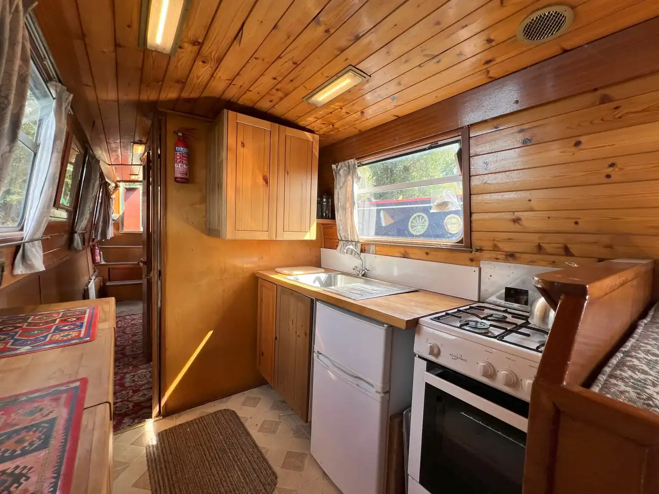 Positioned midships, the galley is equipped with a 4-burner gas hob, oven and grill, a 240V fridge freezer, and a stainless-steel sink with draining boards. Ample under-counter cupboards provide storage for cooking equipment and provisions.