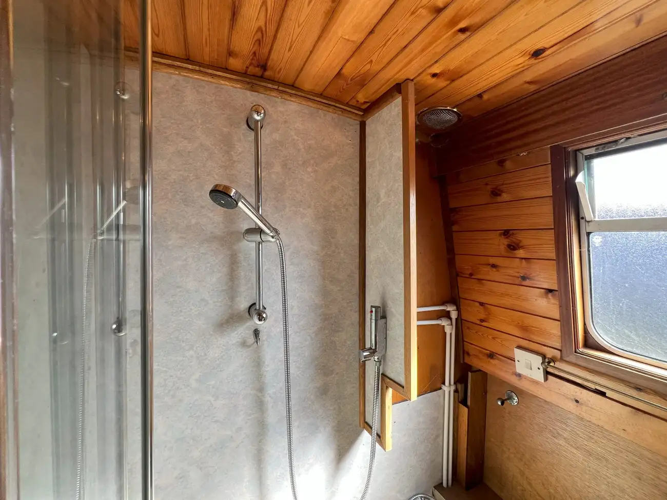 A functional bathroom is fitted with a Porta Potti toilet (with spare cassette), a bath with overhead shower, and a vanity unit with hand basin, providing all the essentials for onboard living.