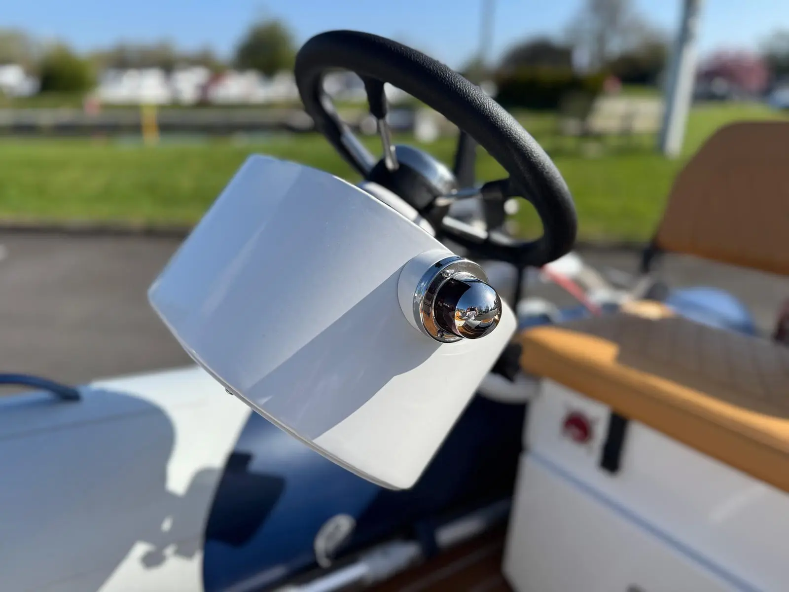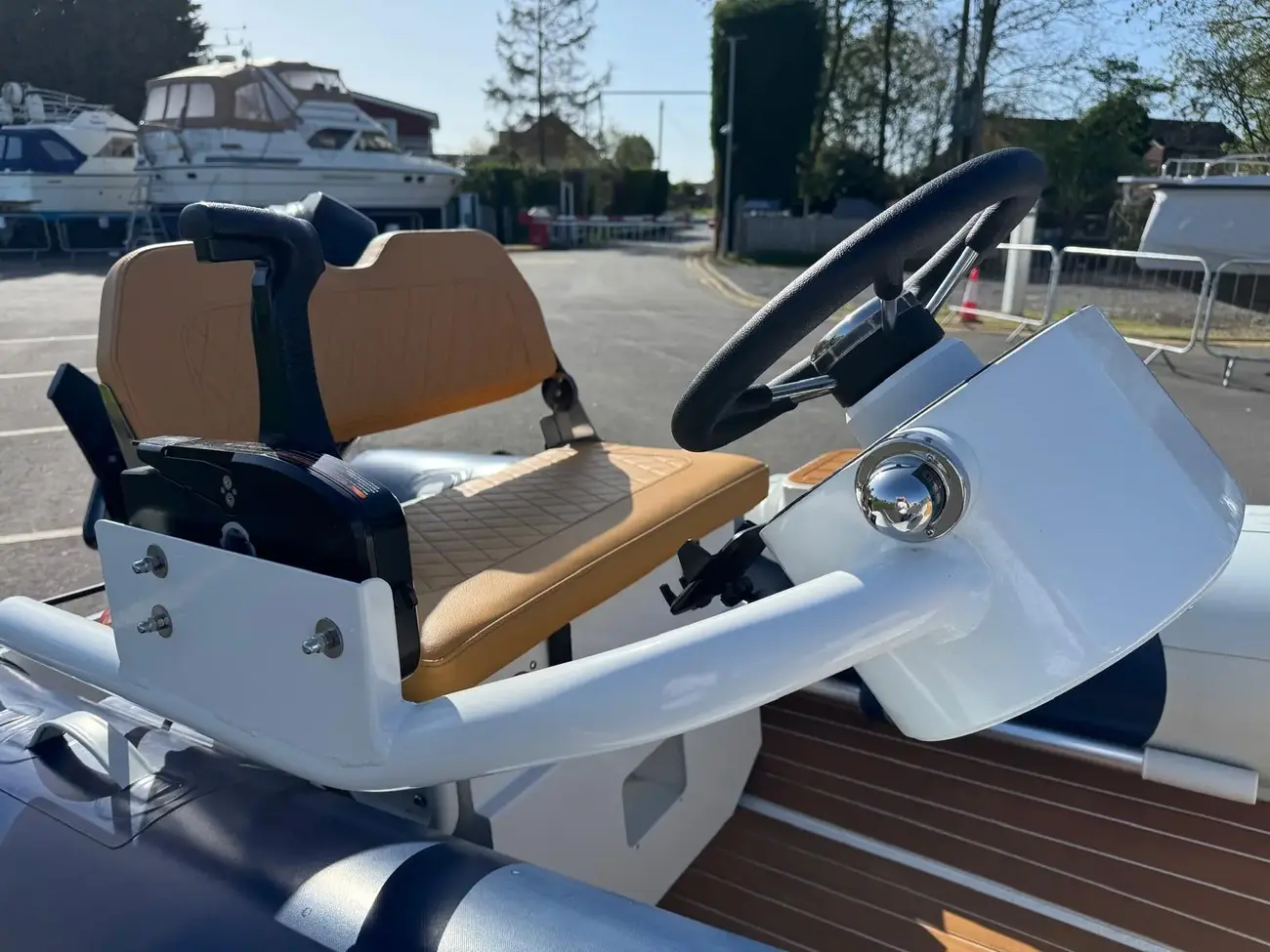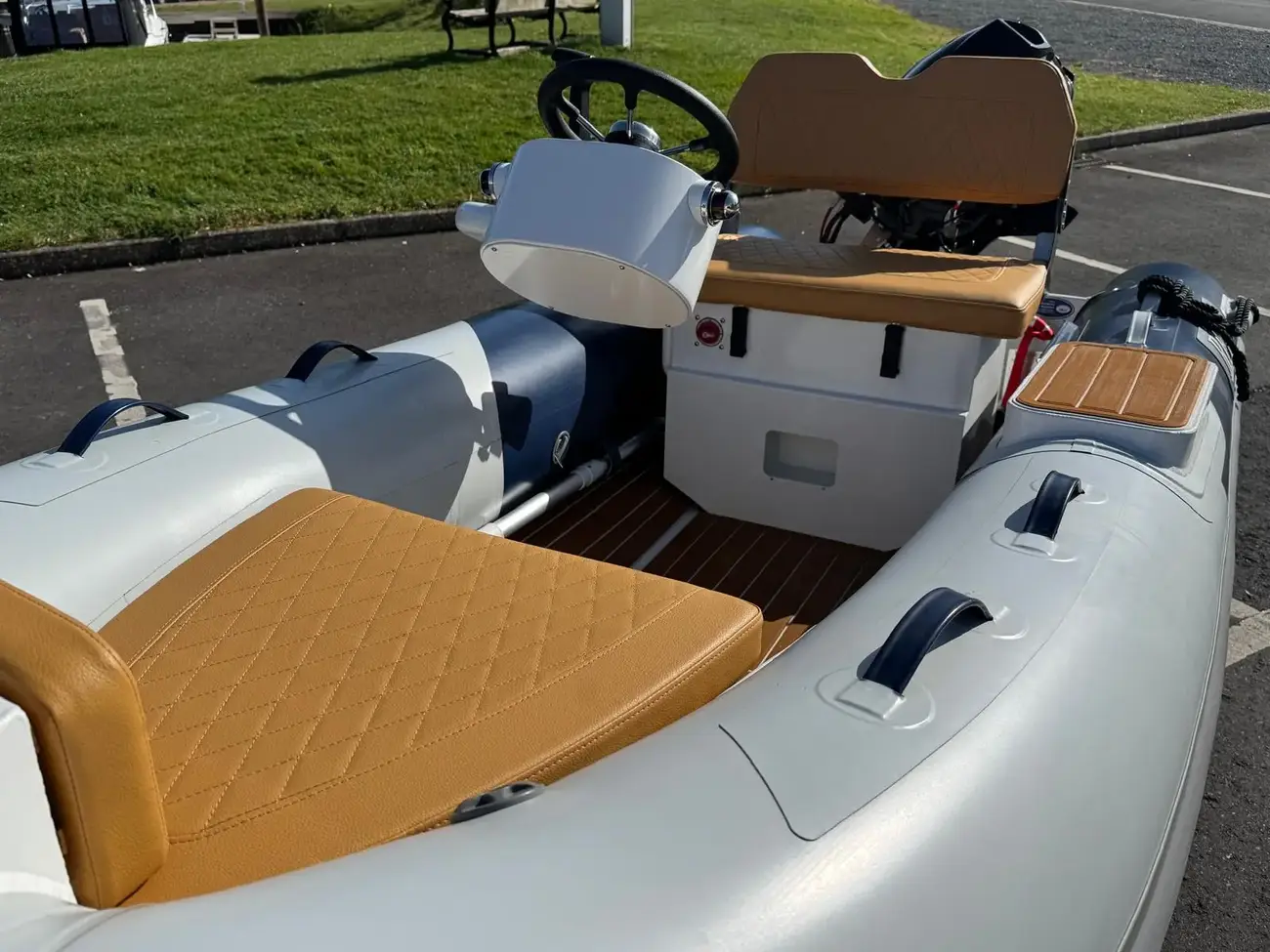 It has a bow locker with cushions, back rest, bow step and sidestep. This models can take up to 30hp outboards, but we recommend 20hp and with the benefit of the double floor you can put the fuel tank in the bow locker and run the fuel line under the deck so no unsightly tank or lines around your feet.